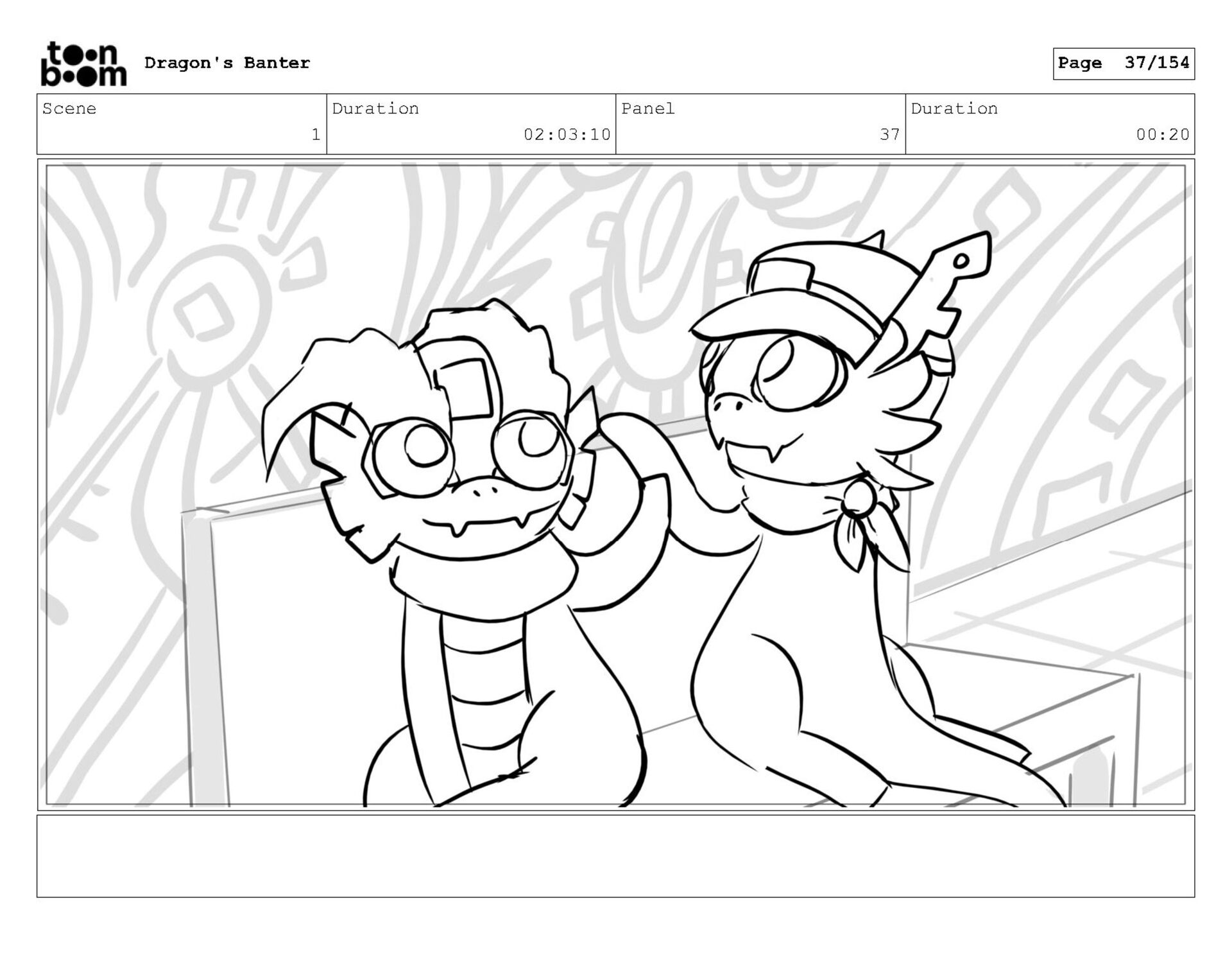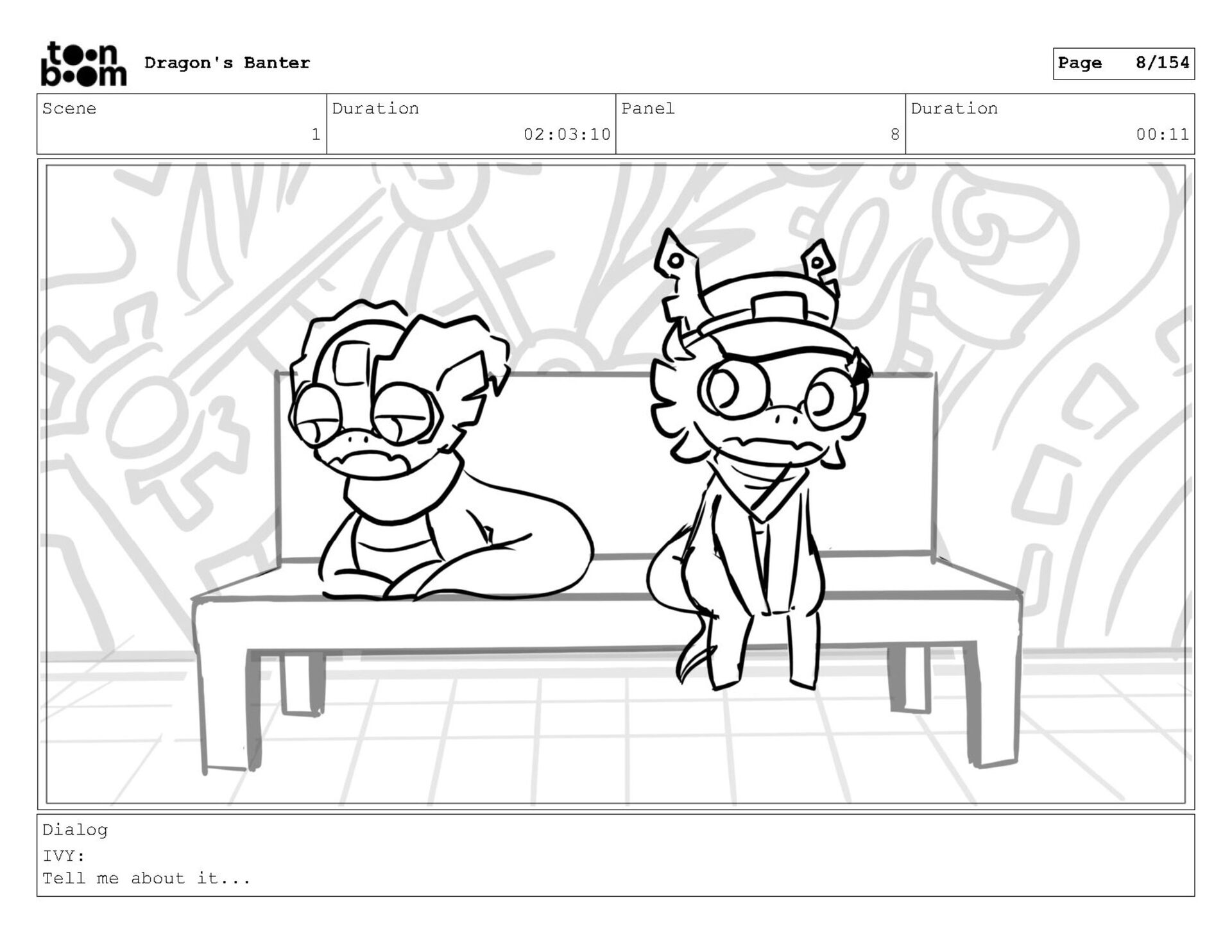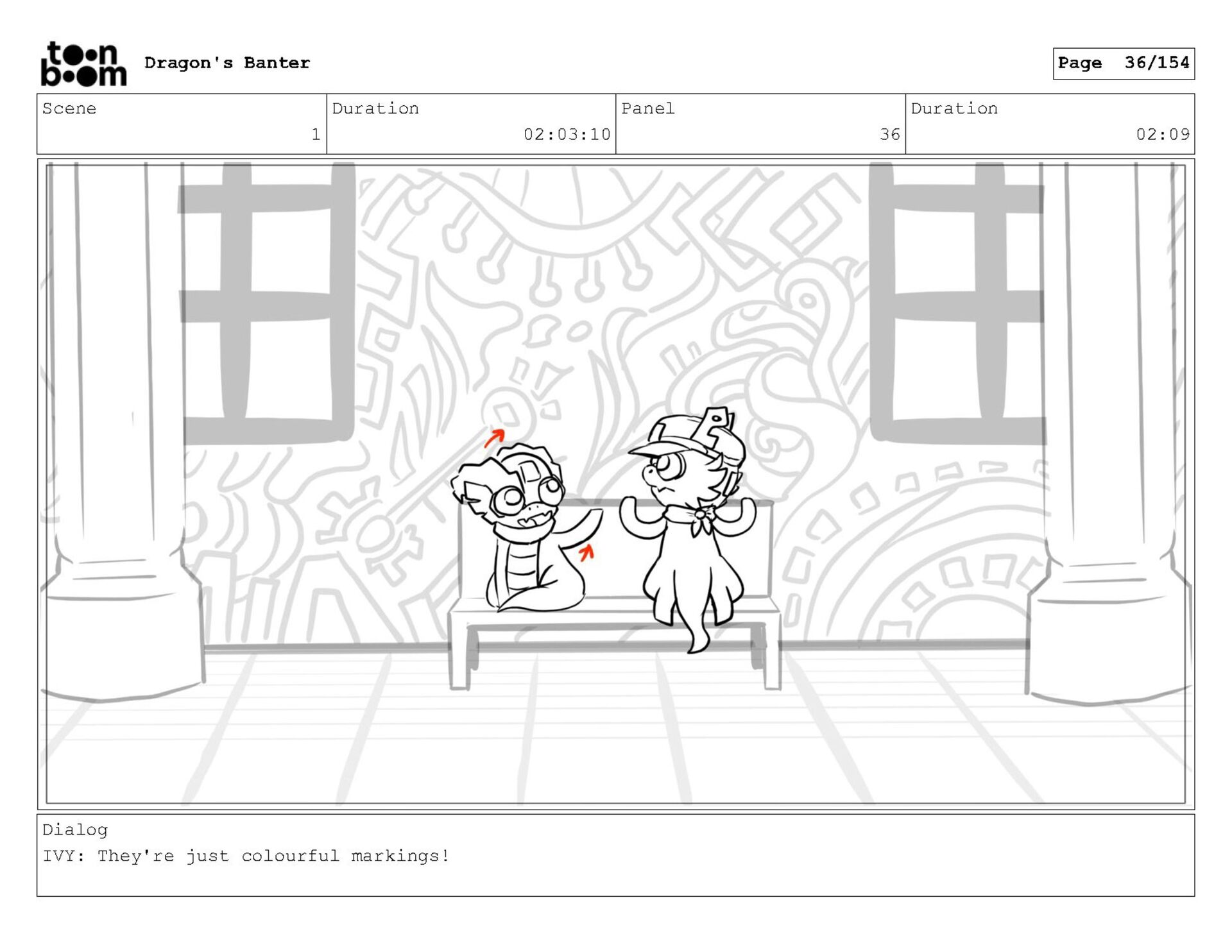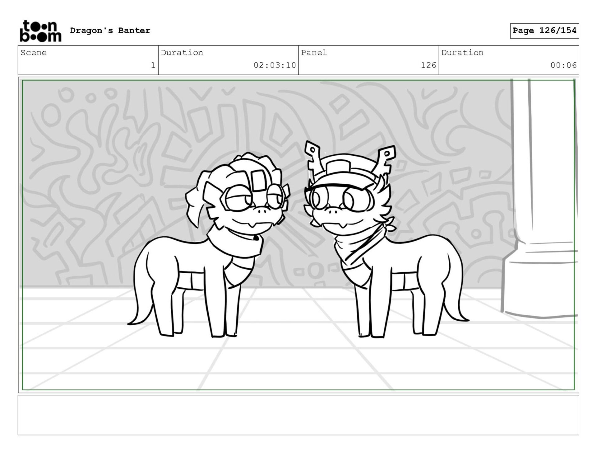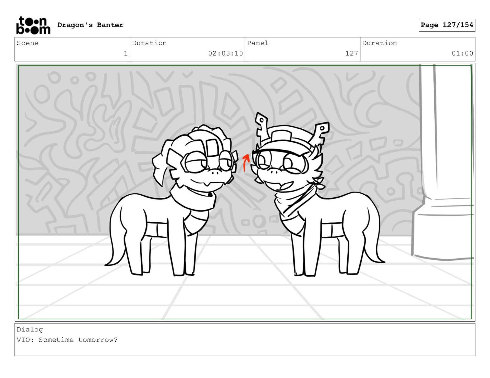 Storyboard produced for a University project, a comedic conversation exchange between two dragons about some fascinating markings on the walls. Featuring an original script and character designs.