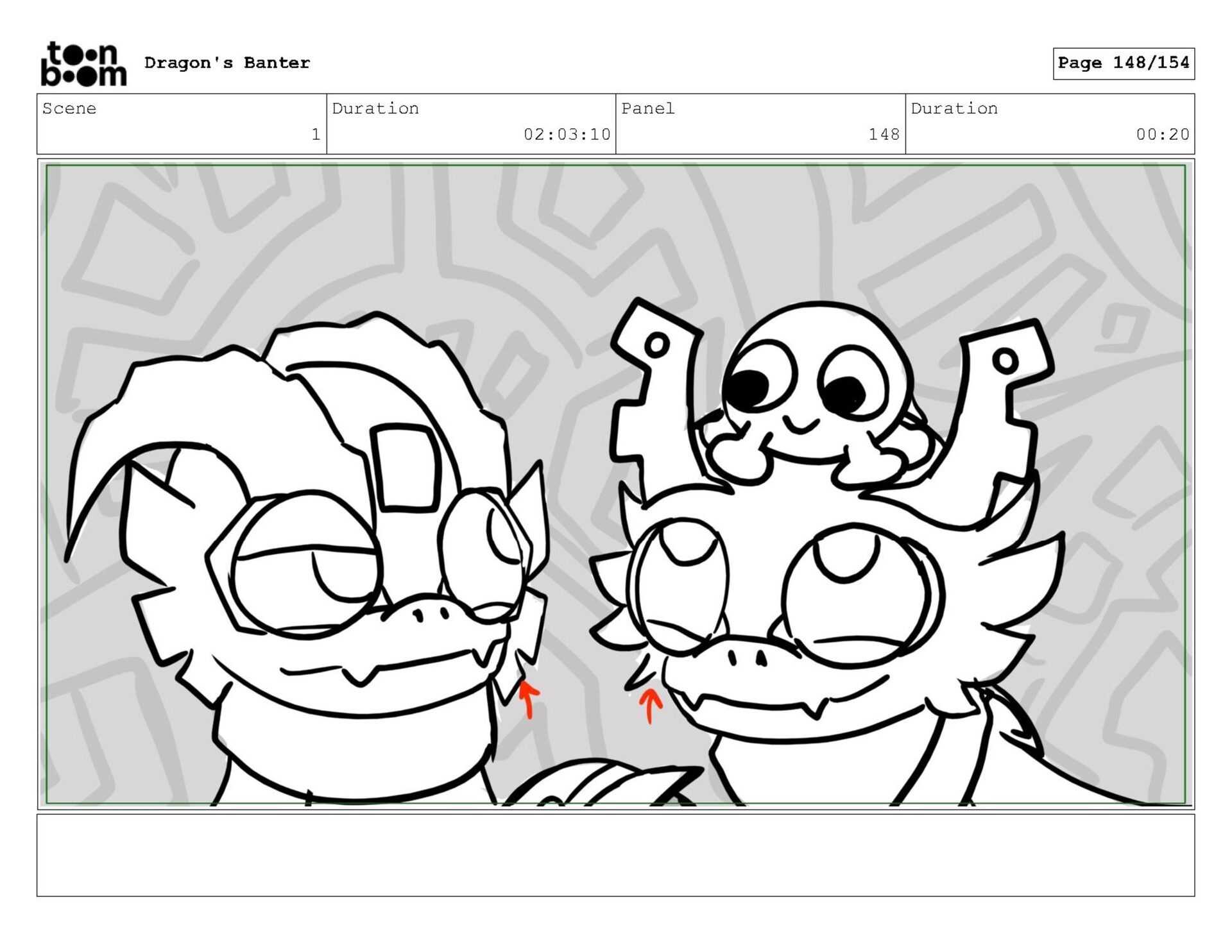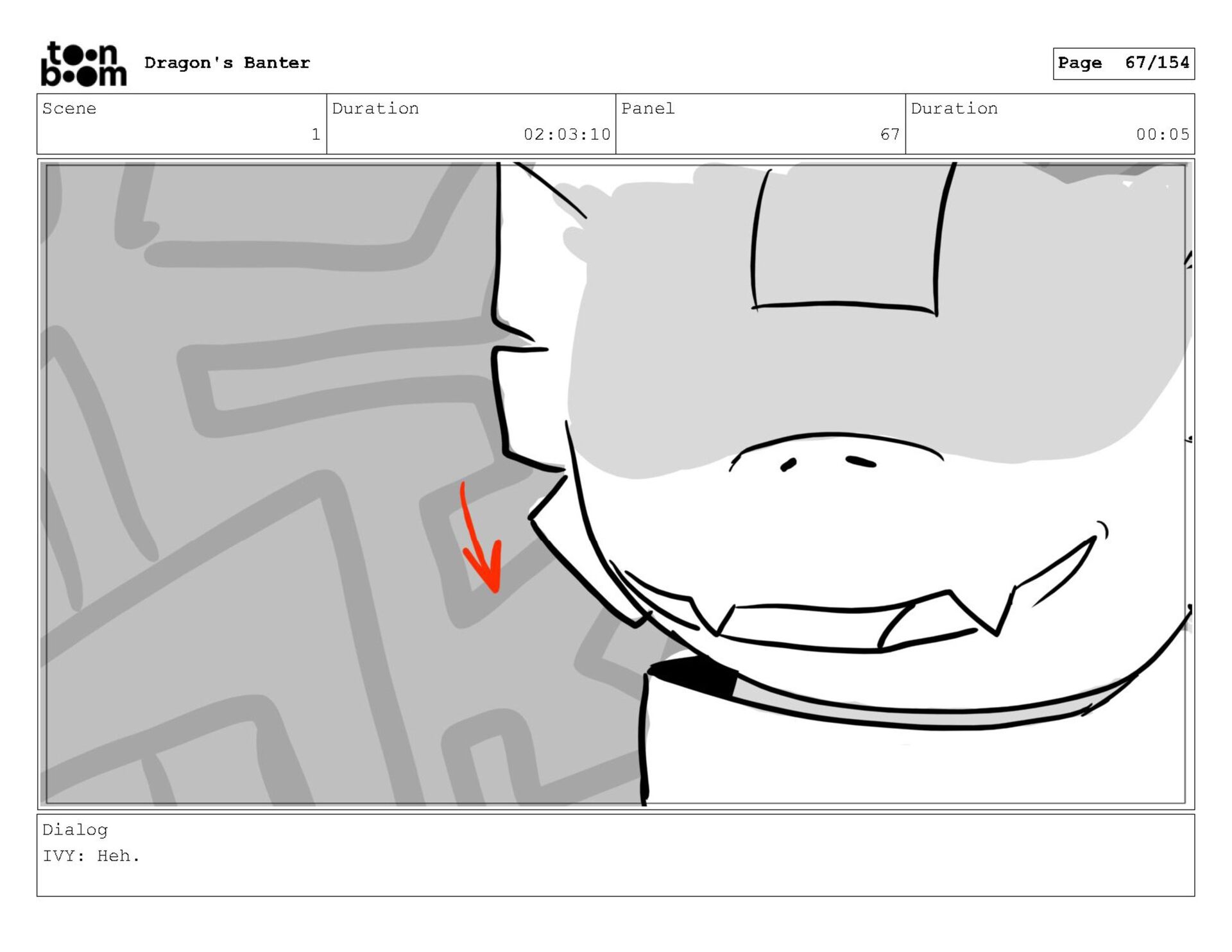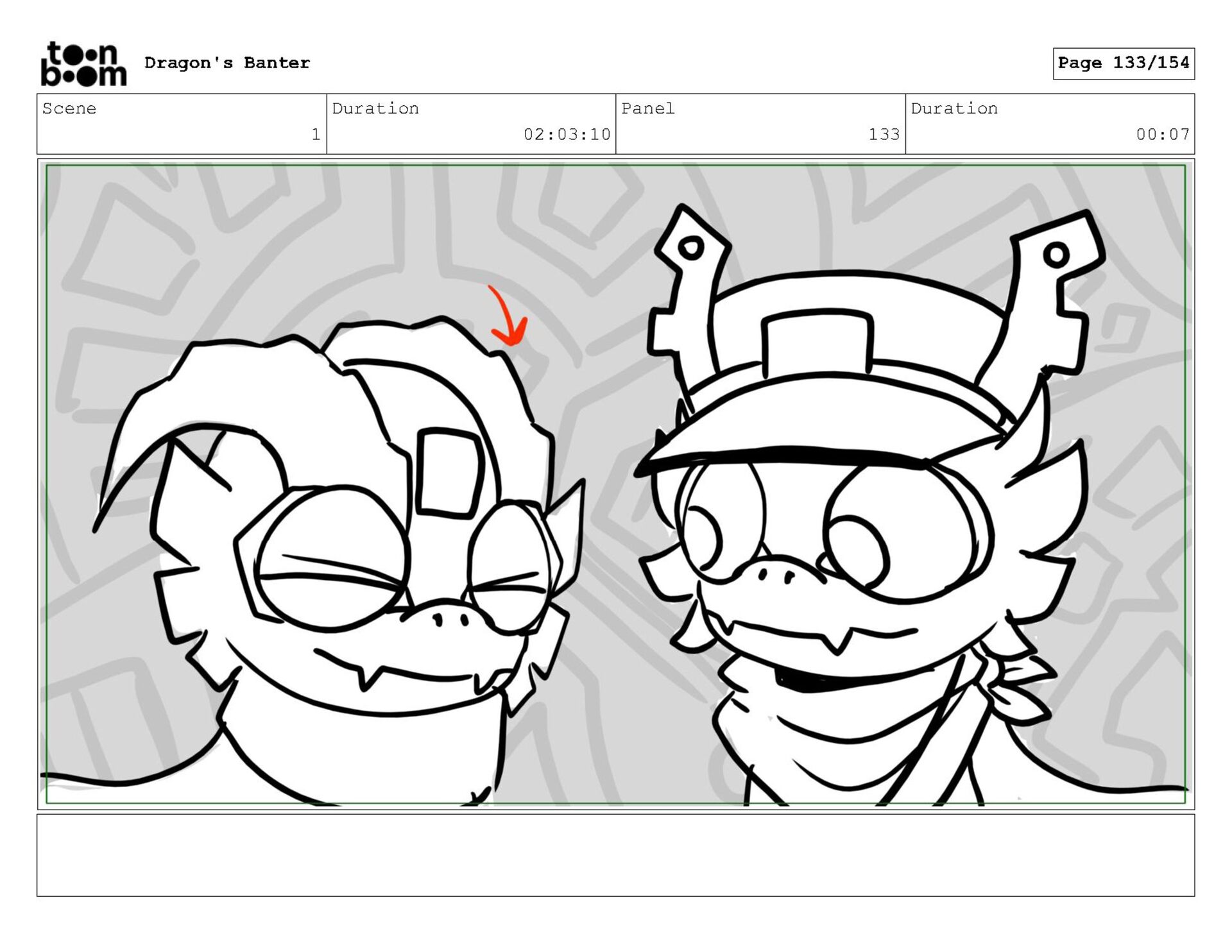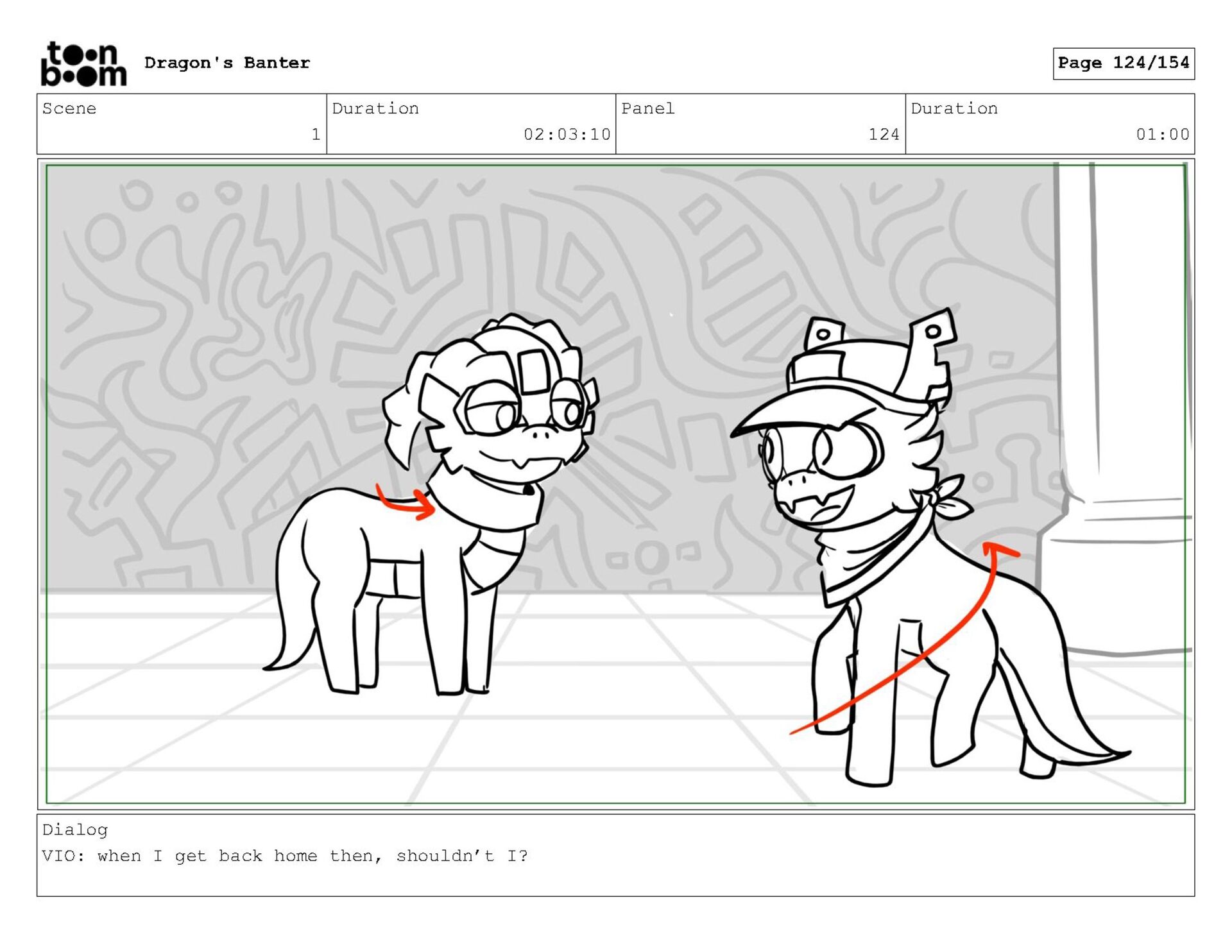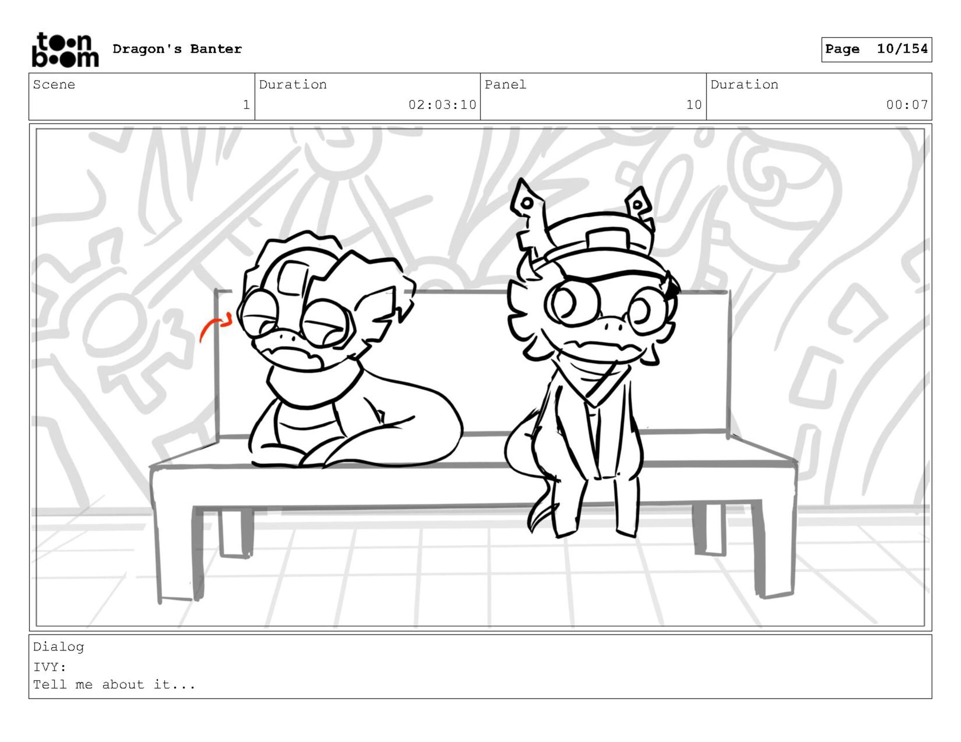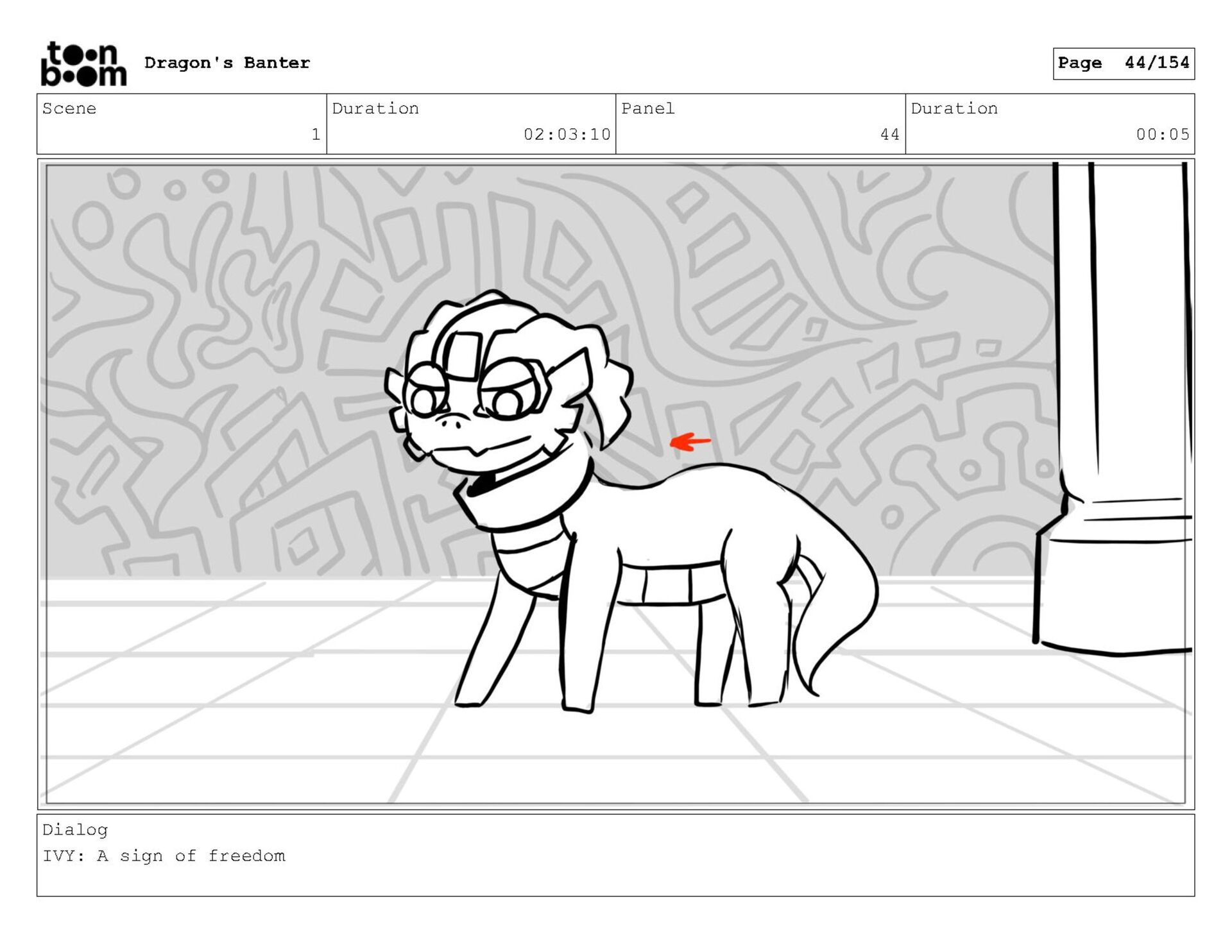 Storyboard produced for a University project, a comedic conversation exchange between two dragons about some fascinating markings on the walls. Featuring an original script and character designs.