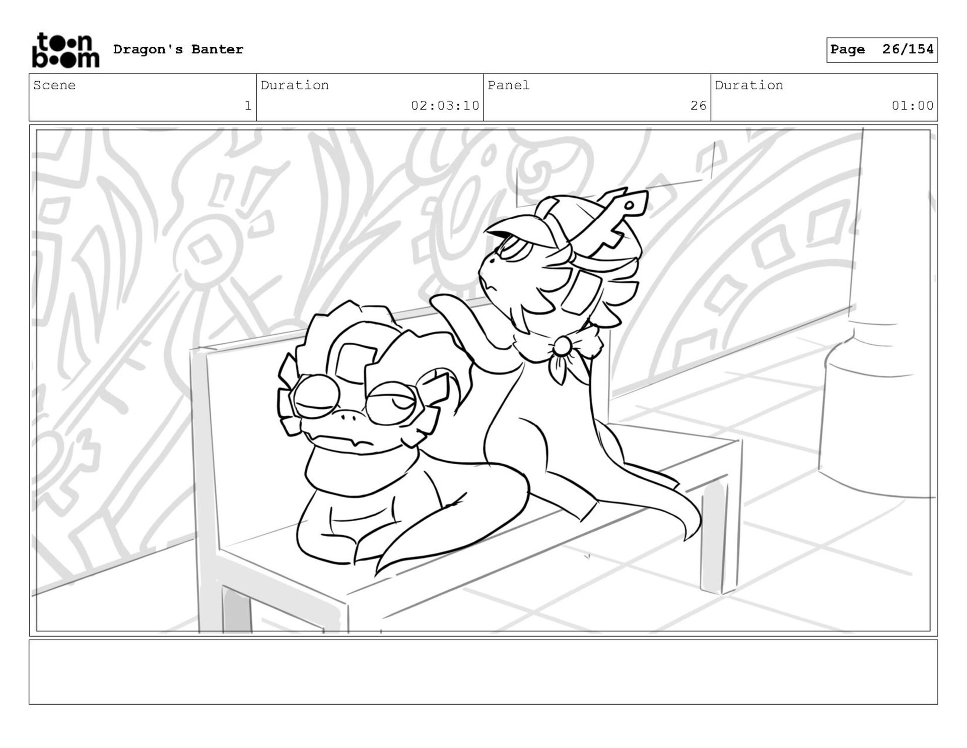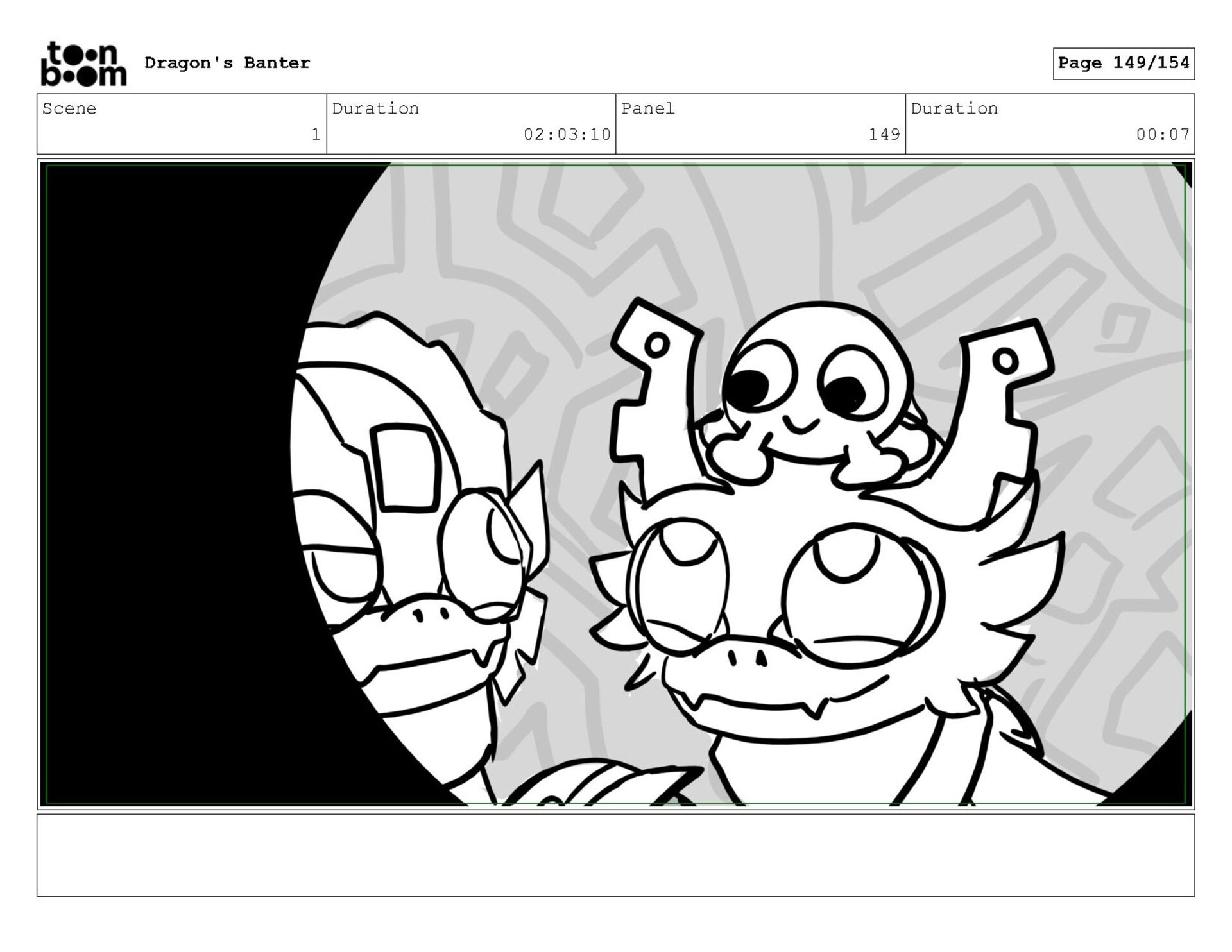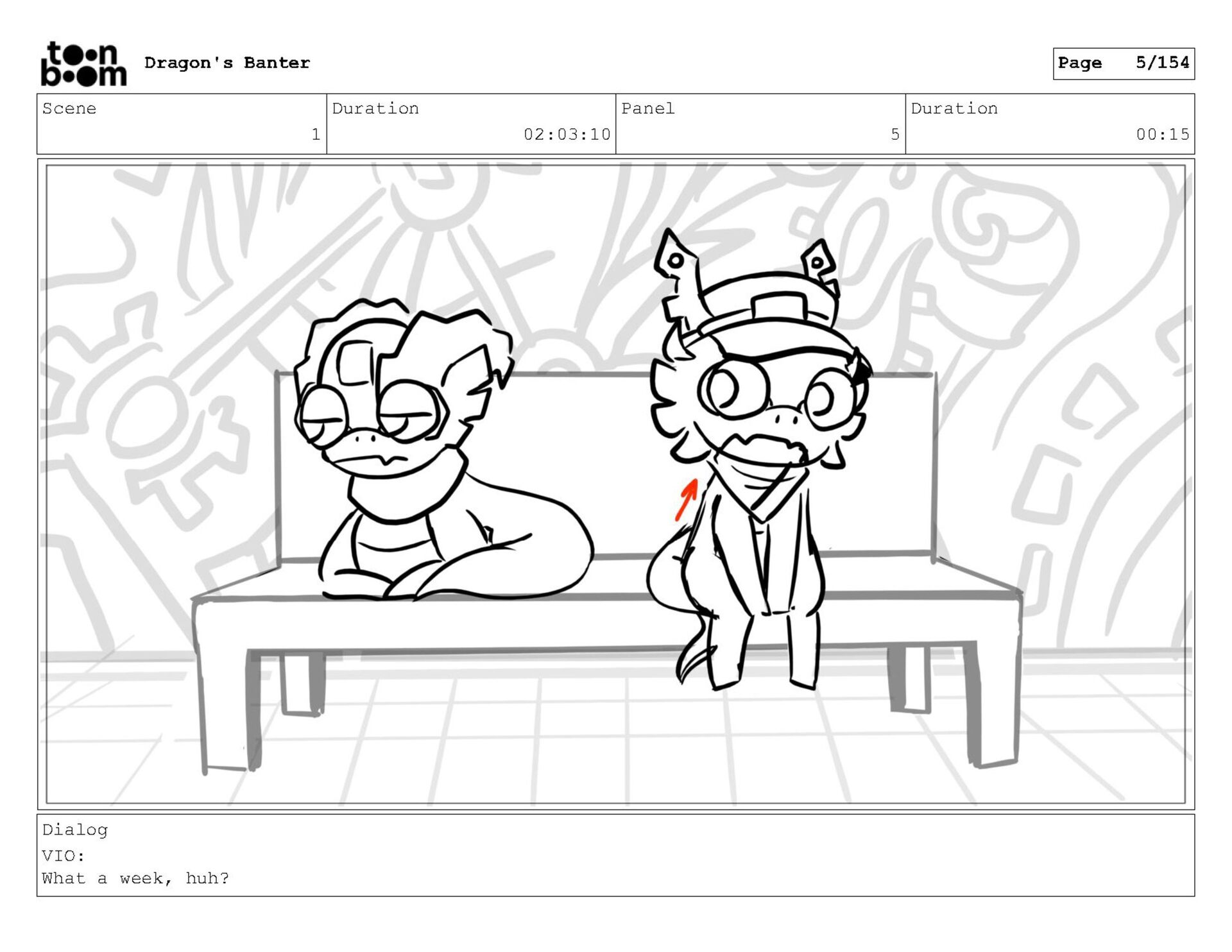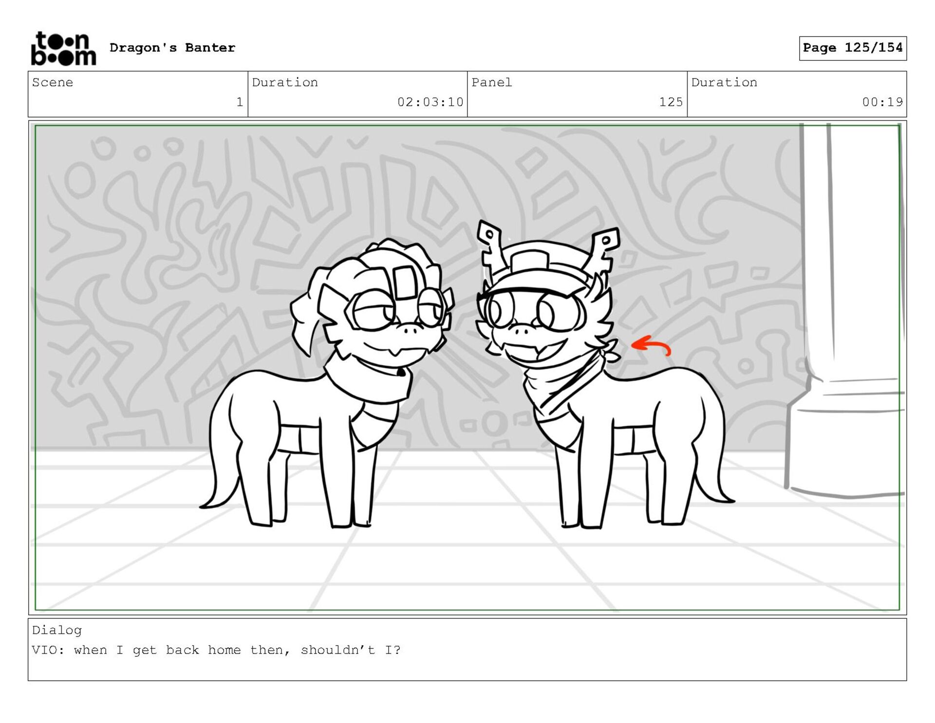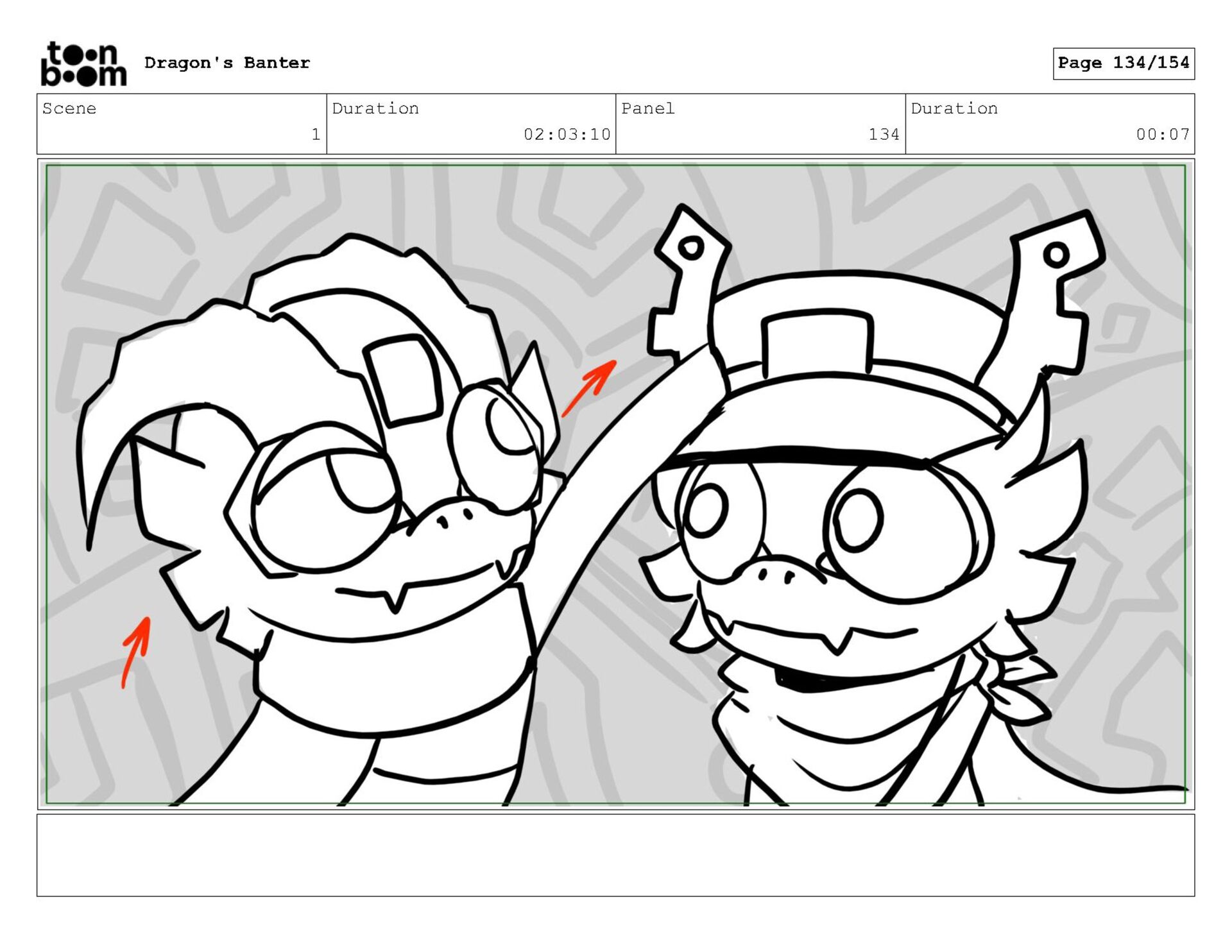 Storyboard produced for a University project, a comedic conversation exchange between two dragons about some fascinating markings on the walls. Featuring an original script and character designs.