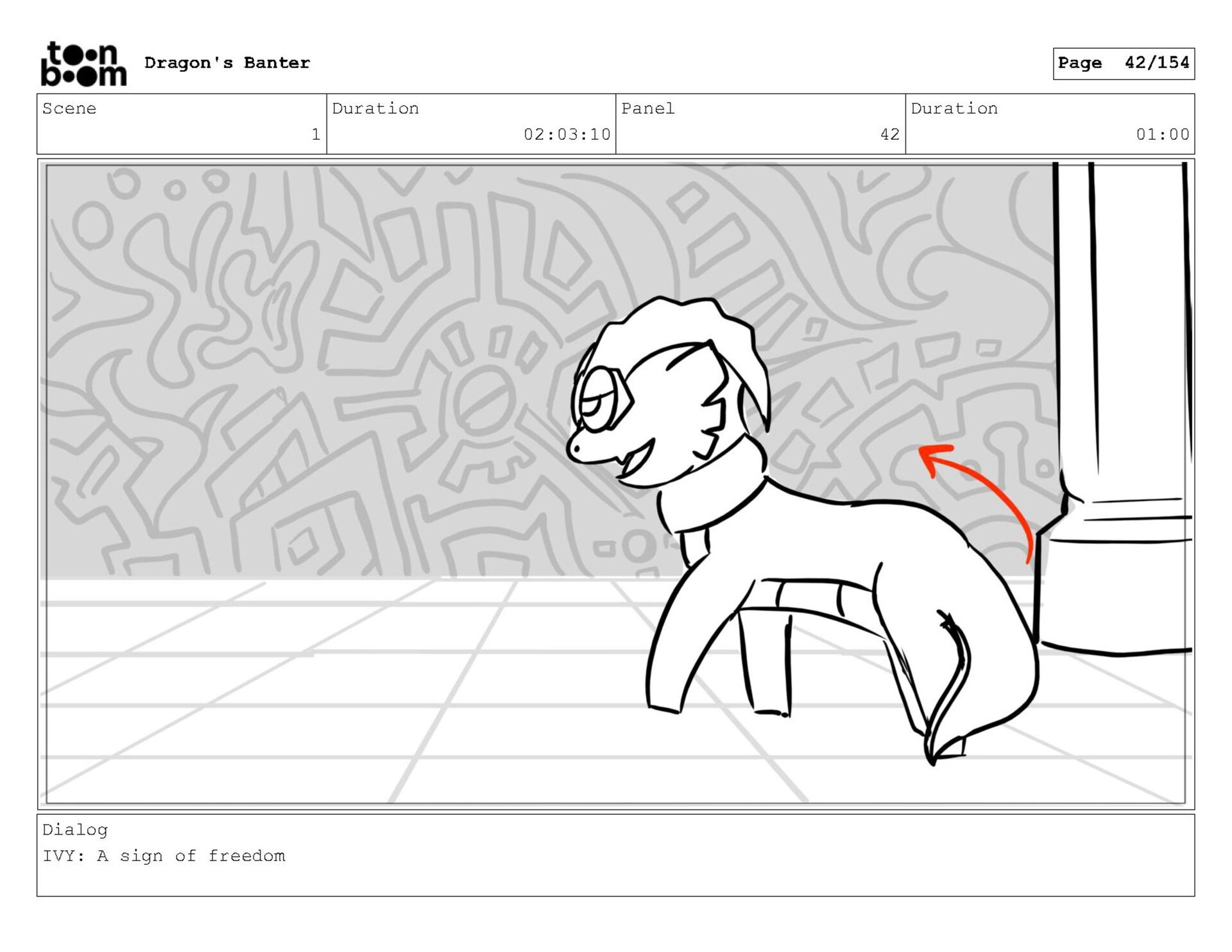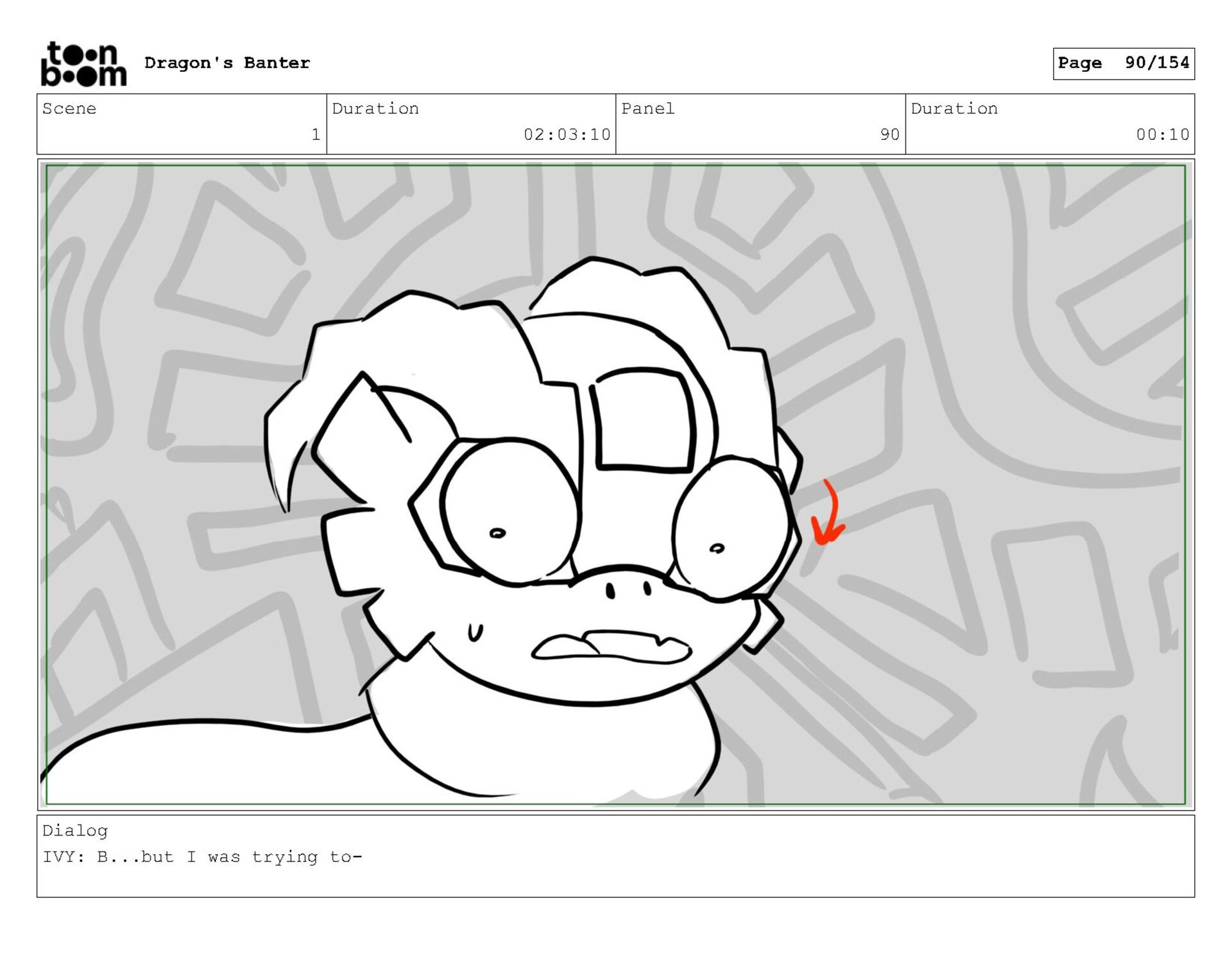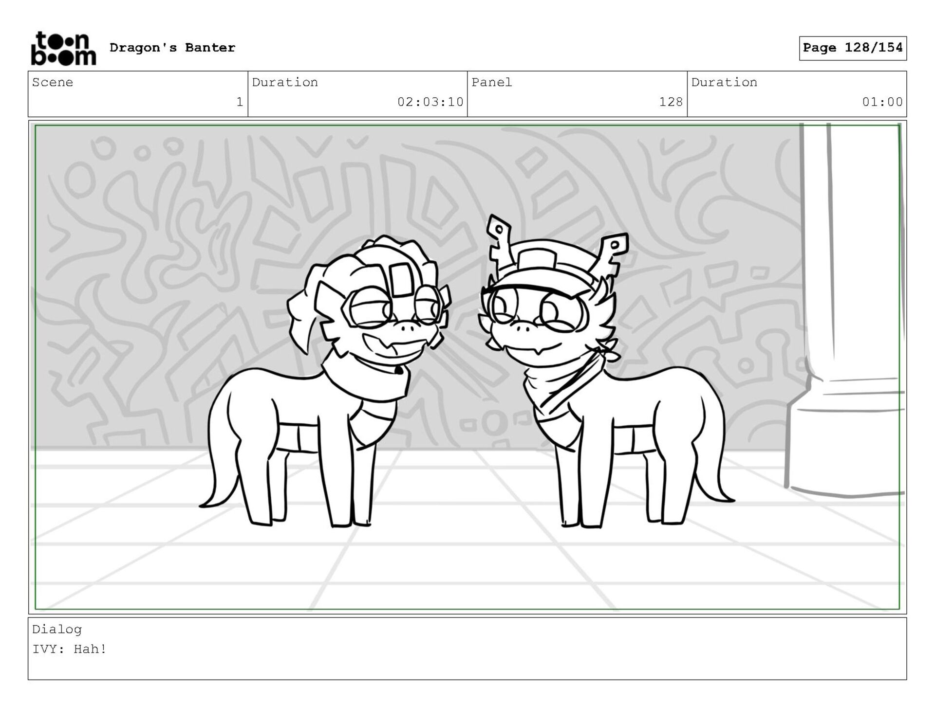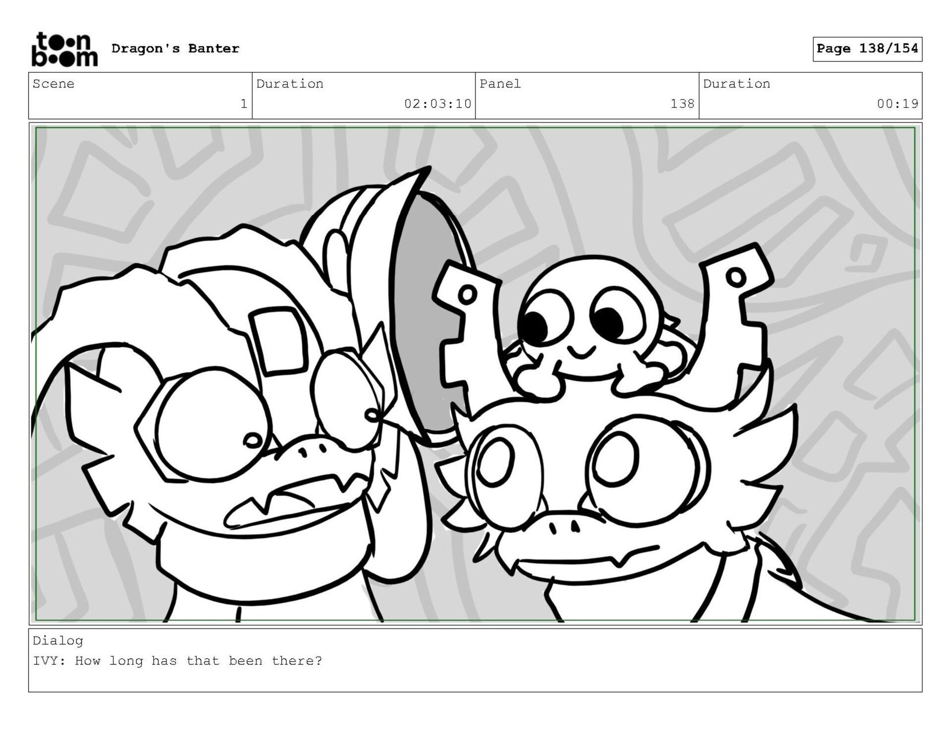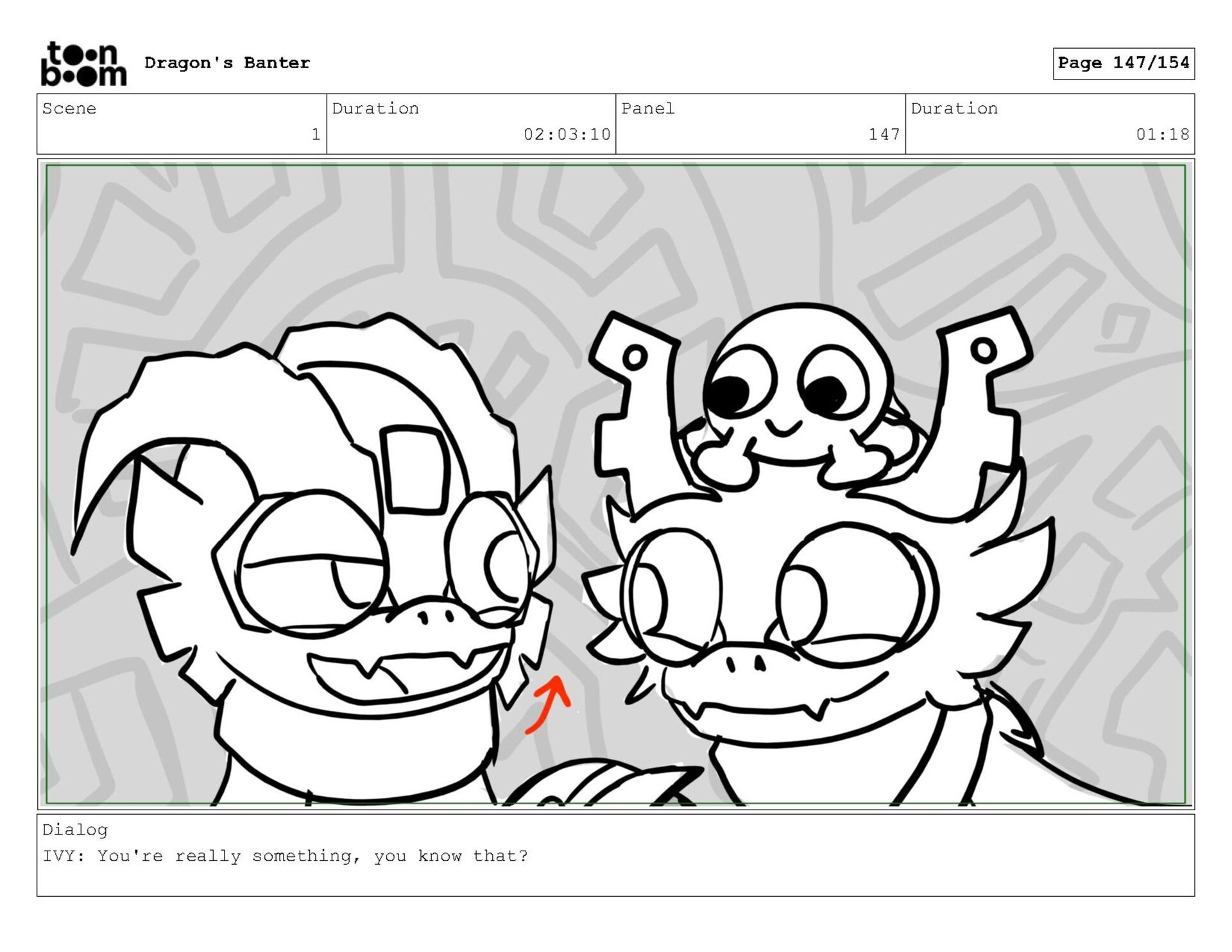 Storyboard produced for a University project, a comedic conversation exchange between two dragons about some fascinating markings on the walls. Featuring an original script and character designs.