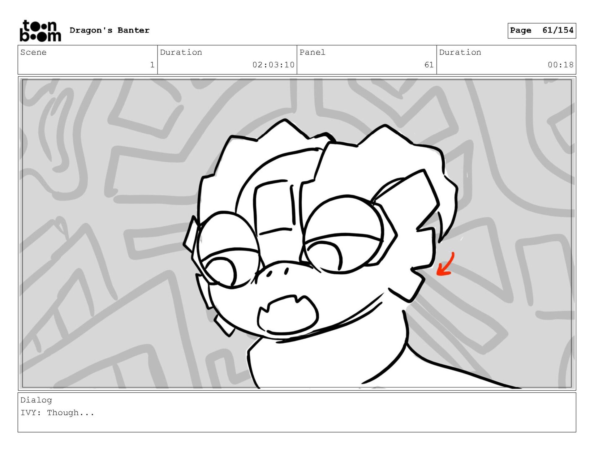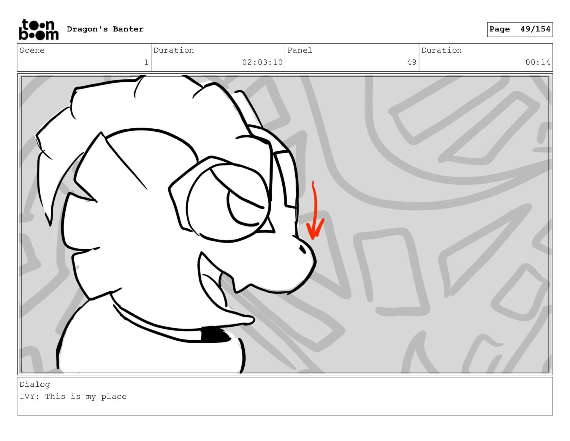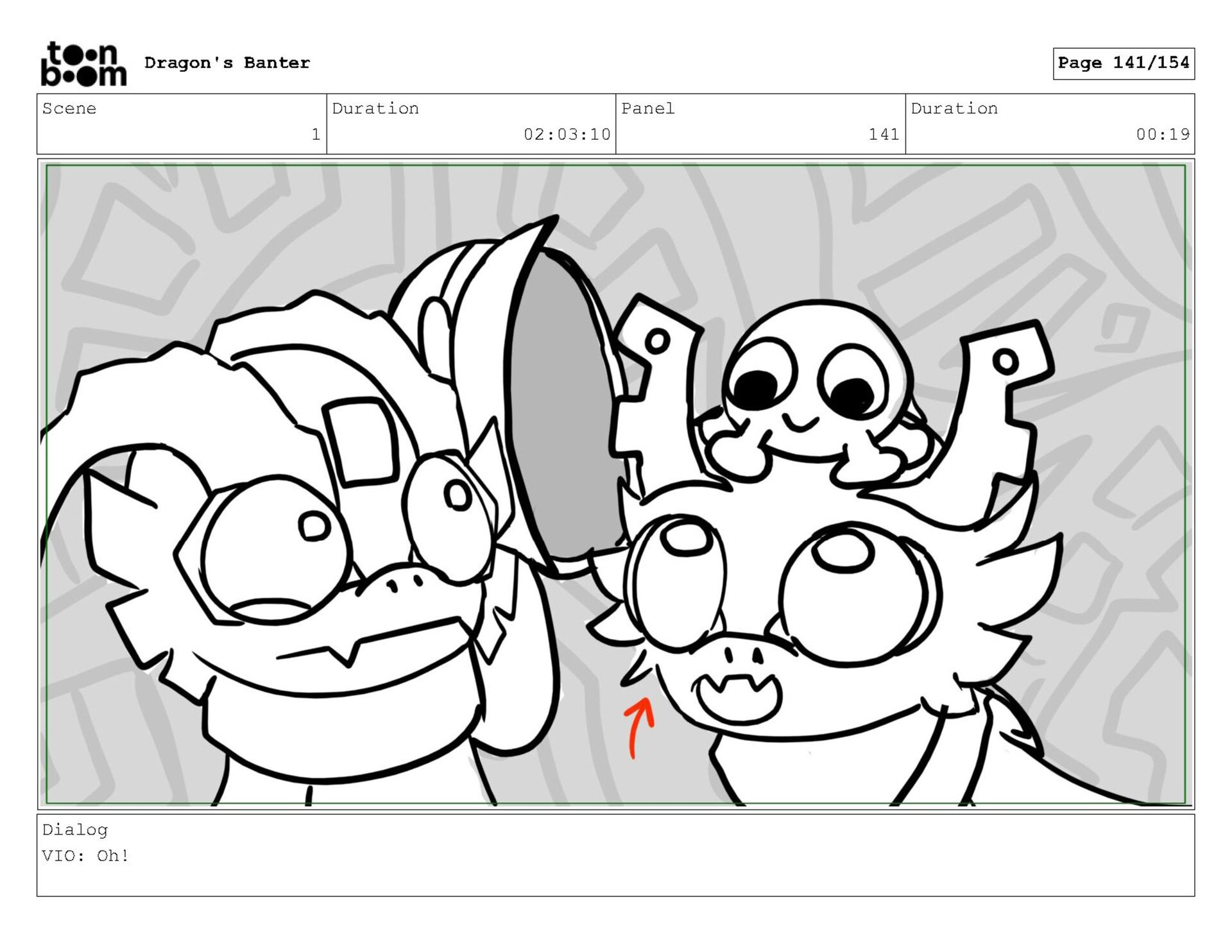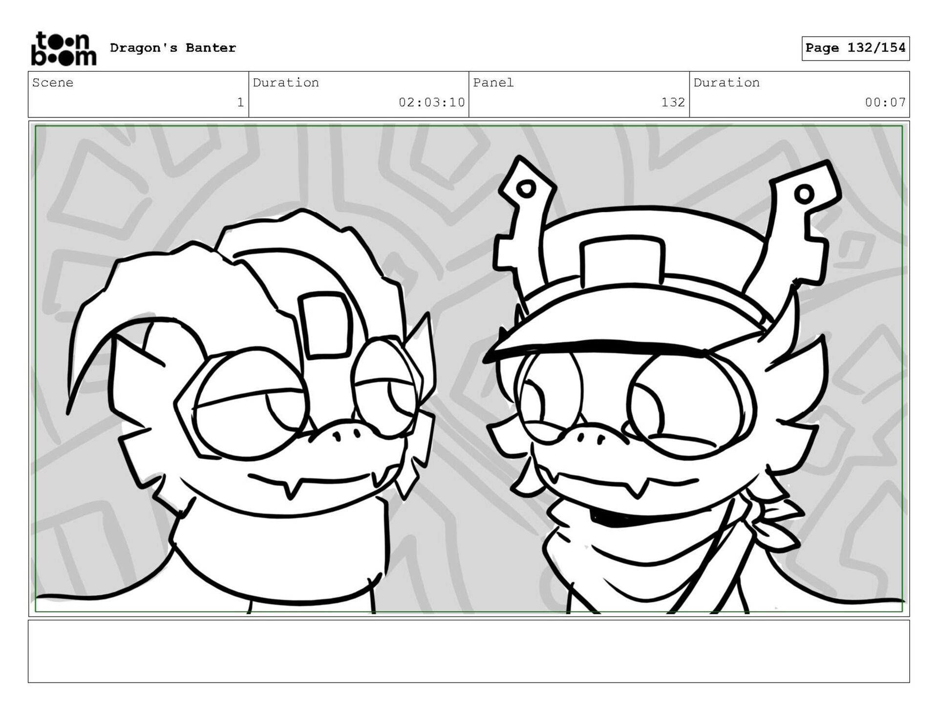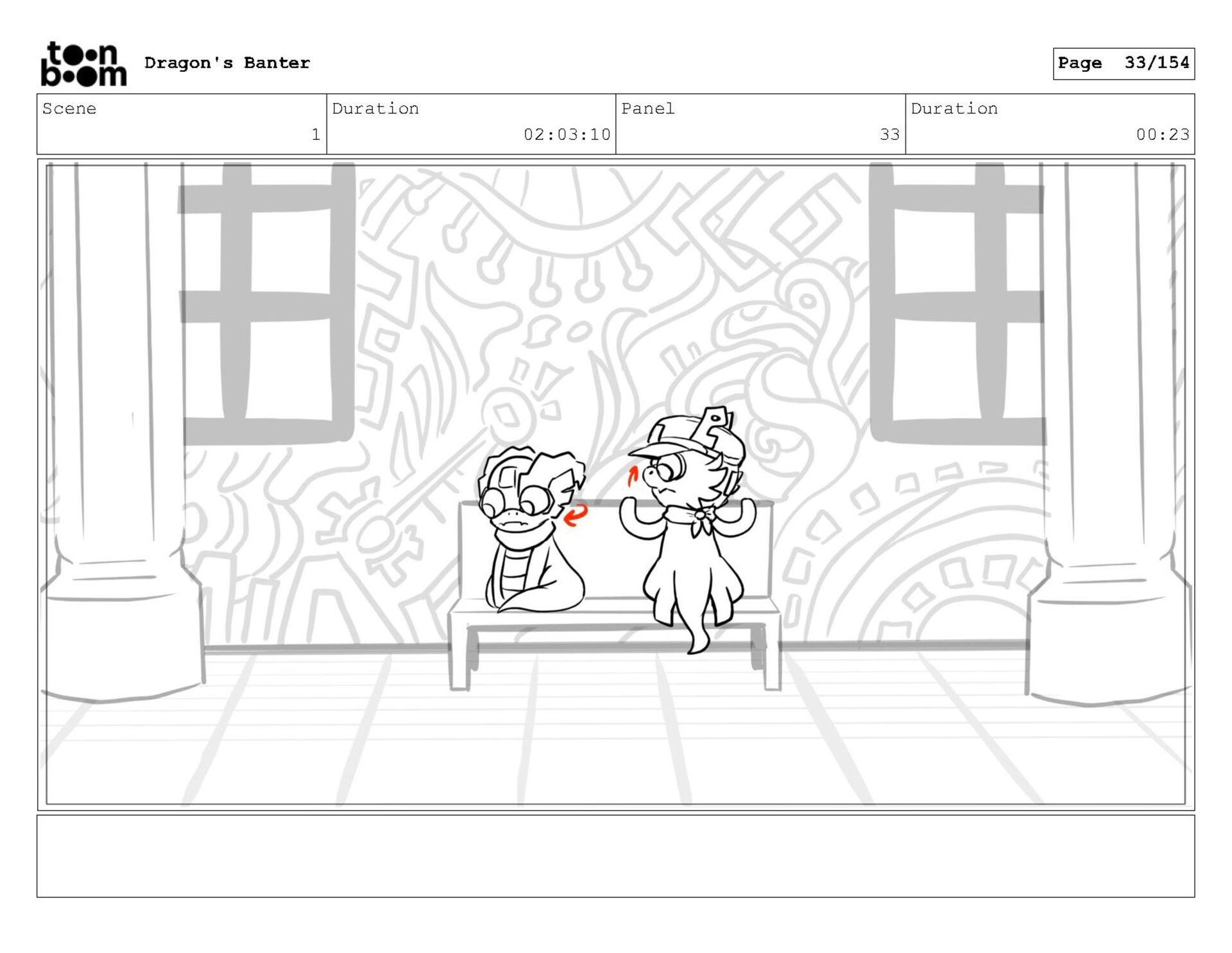 Storyboard produced for a University project, a comedic conversation exchange between two dragons about some fascinating markings on the walls. Featuring an original script and character designs.