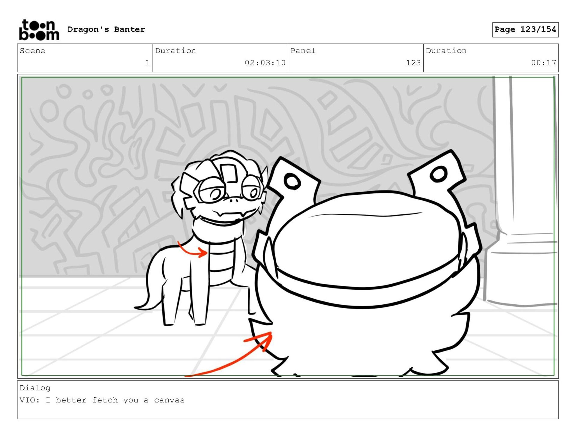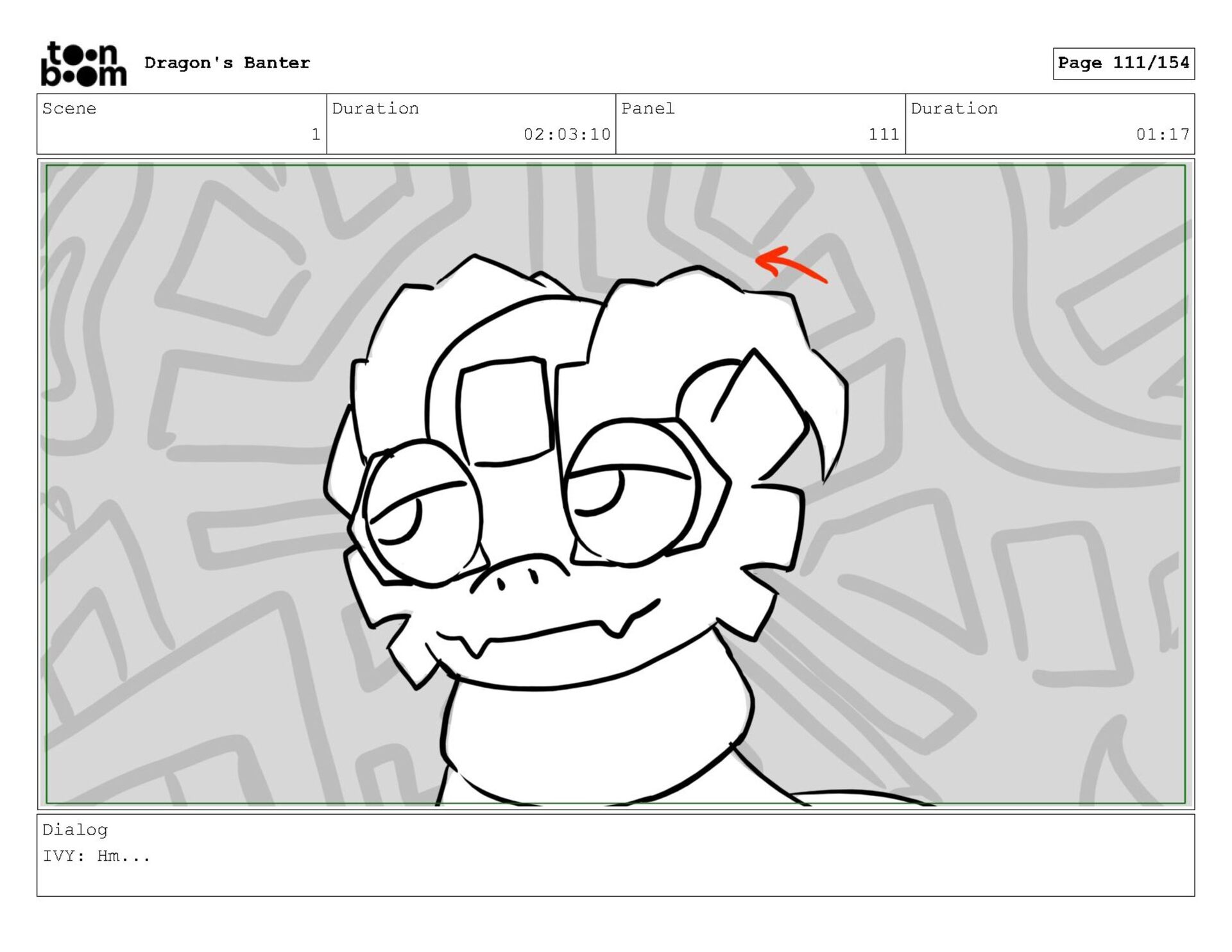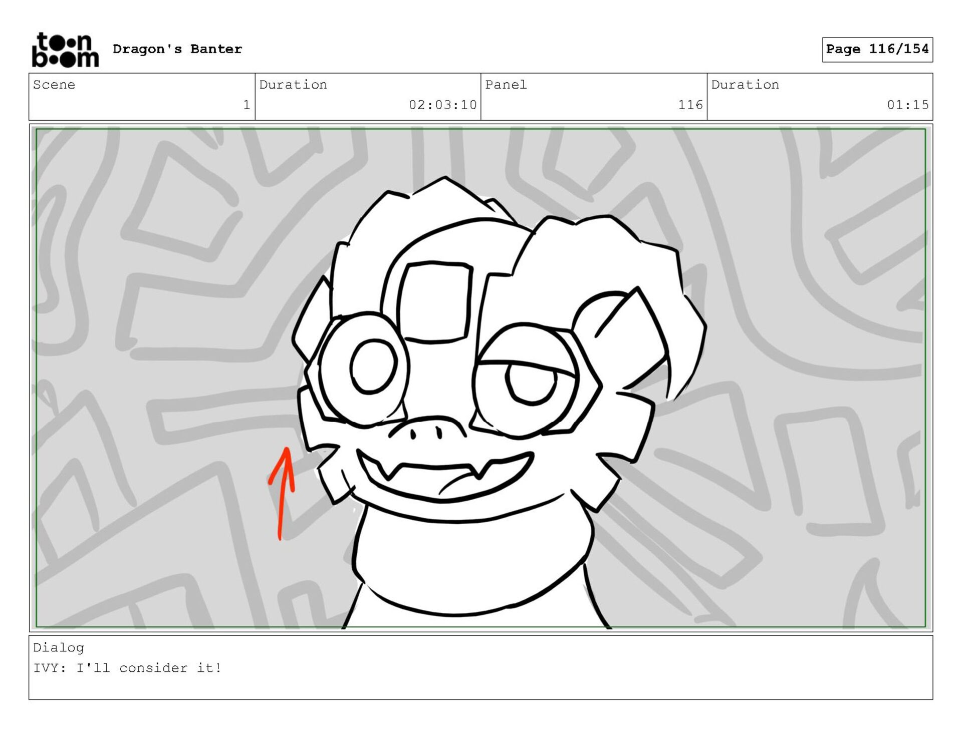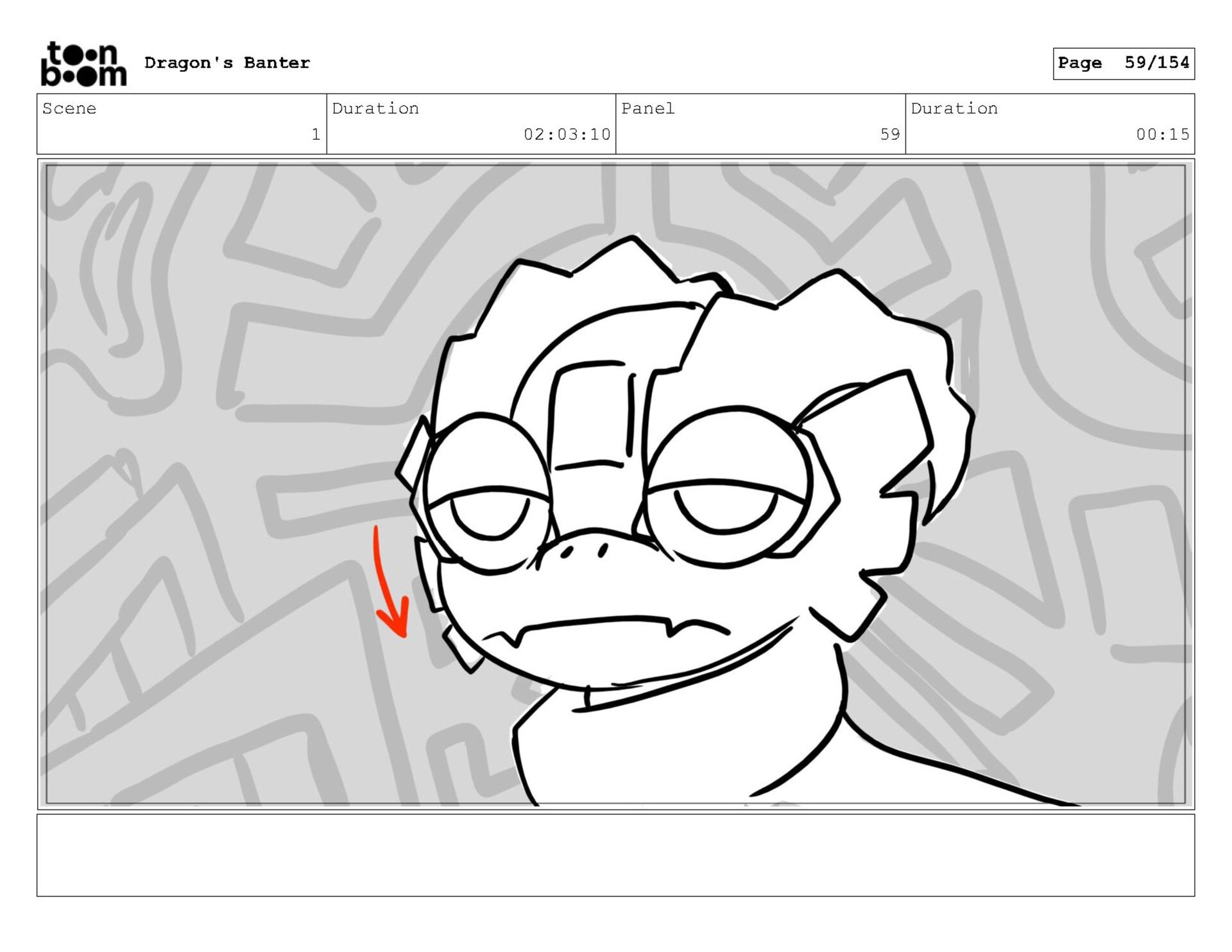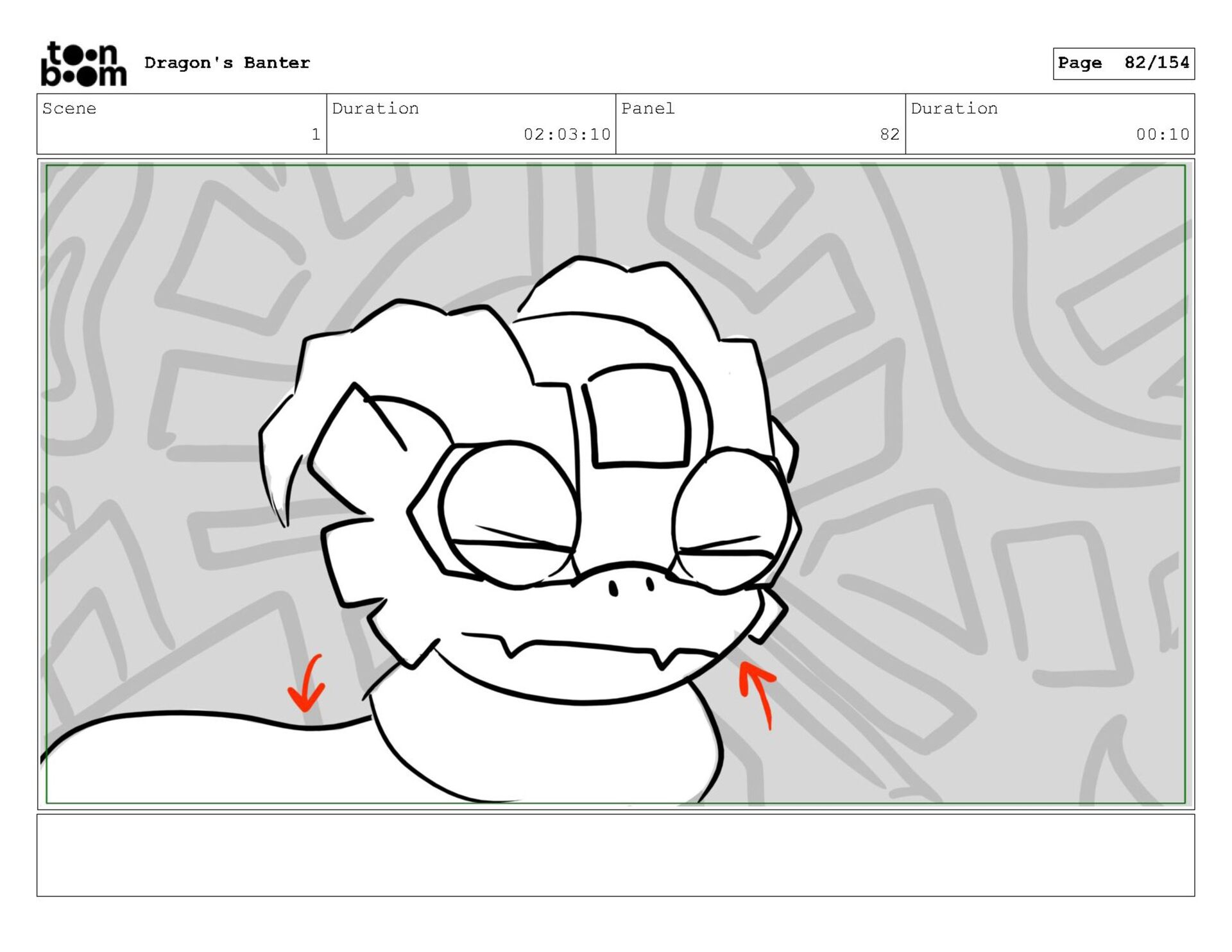 Storyboard produced for a University project, a comedic conversation exchange between two dragons about some fascinating markings on the walls. Featuring an original script and character designs.
