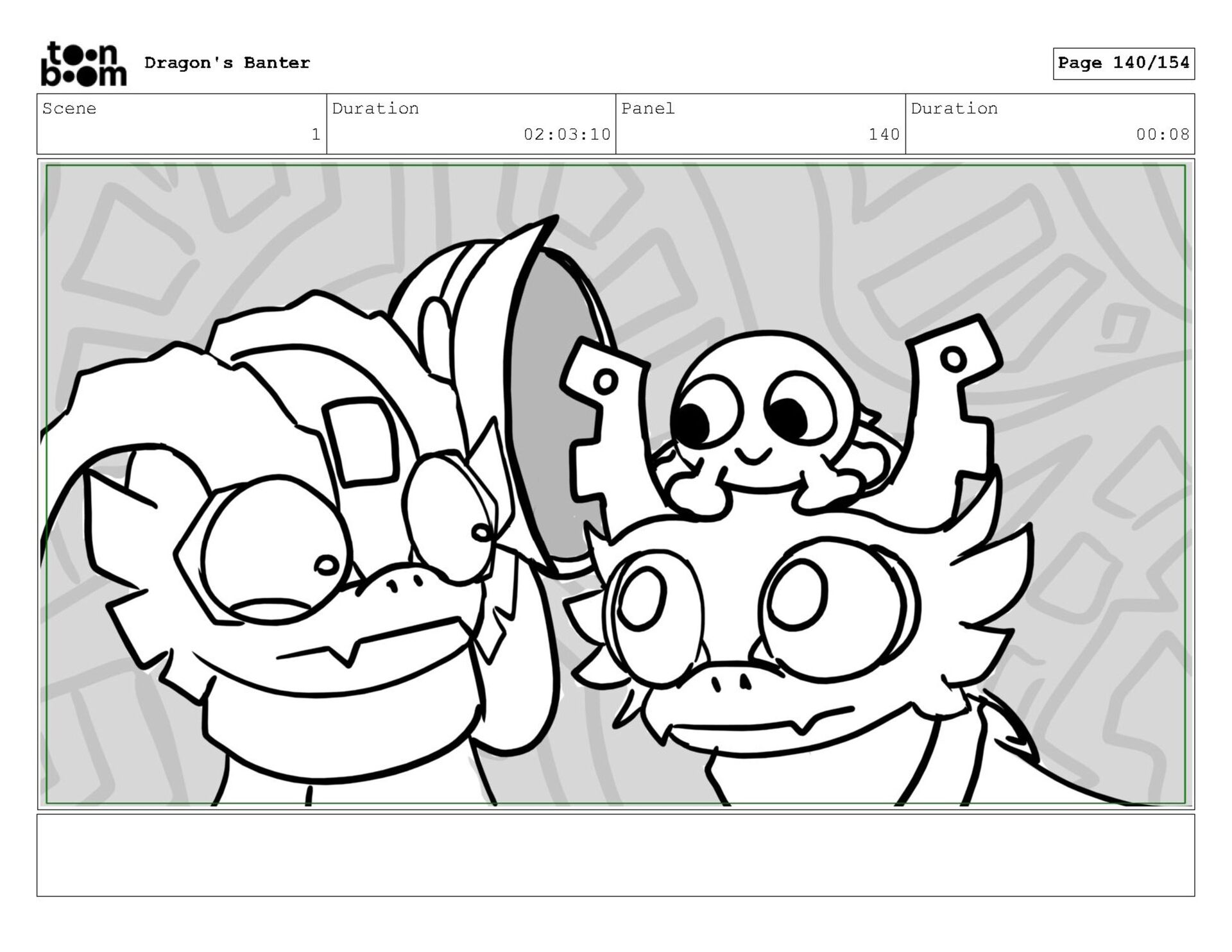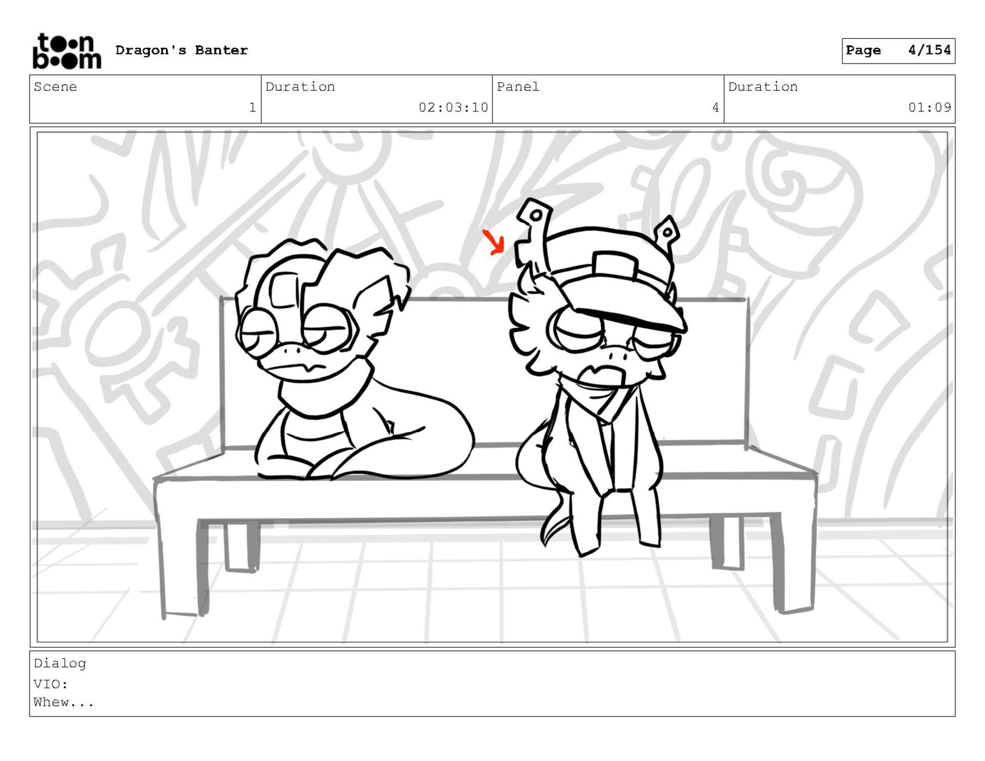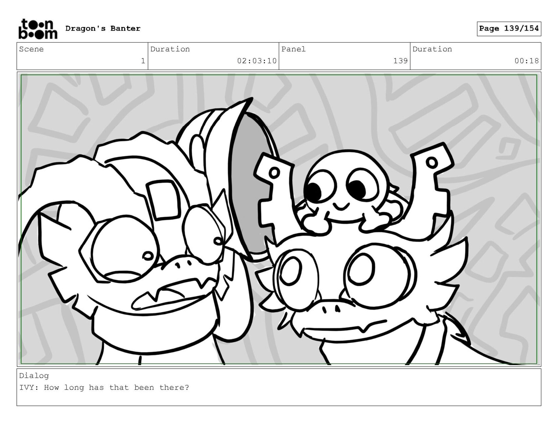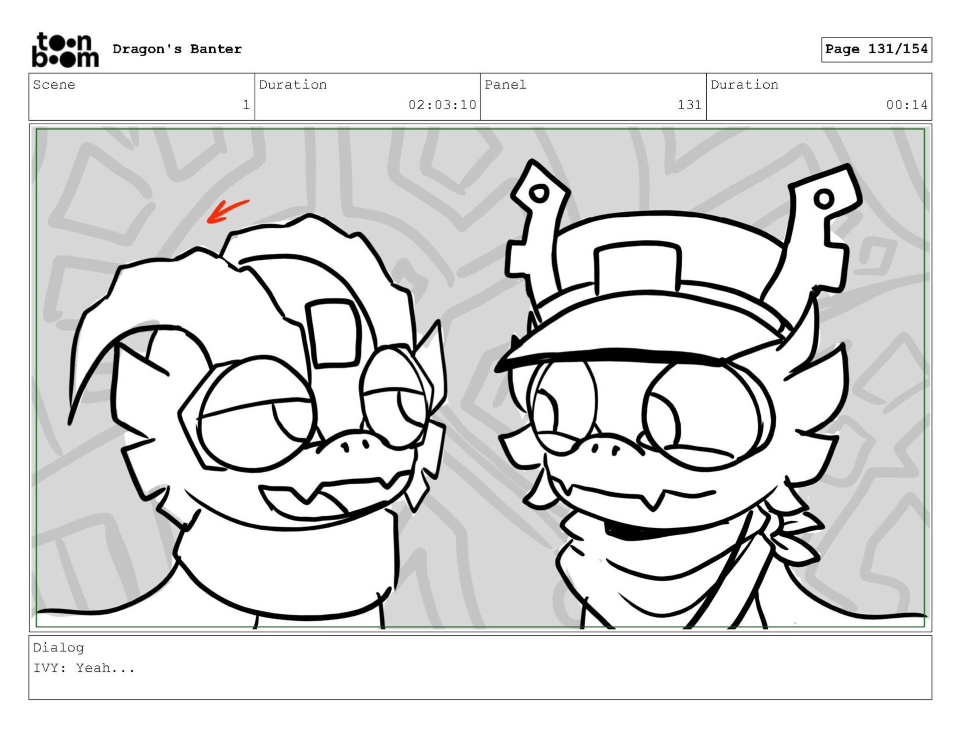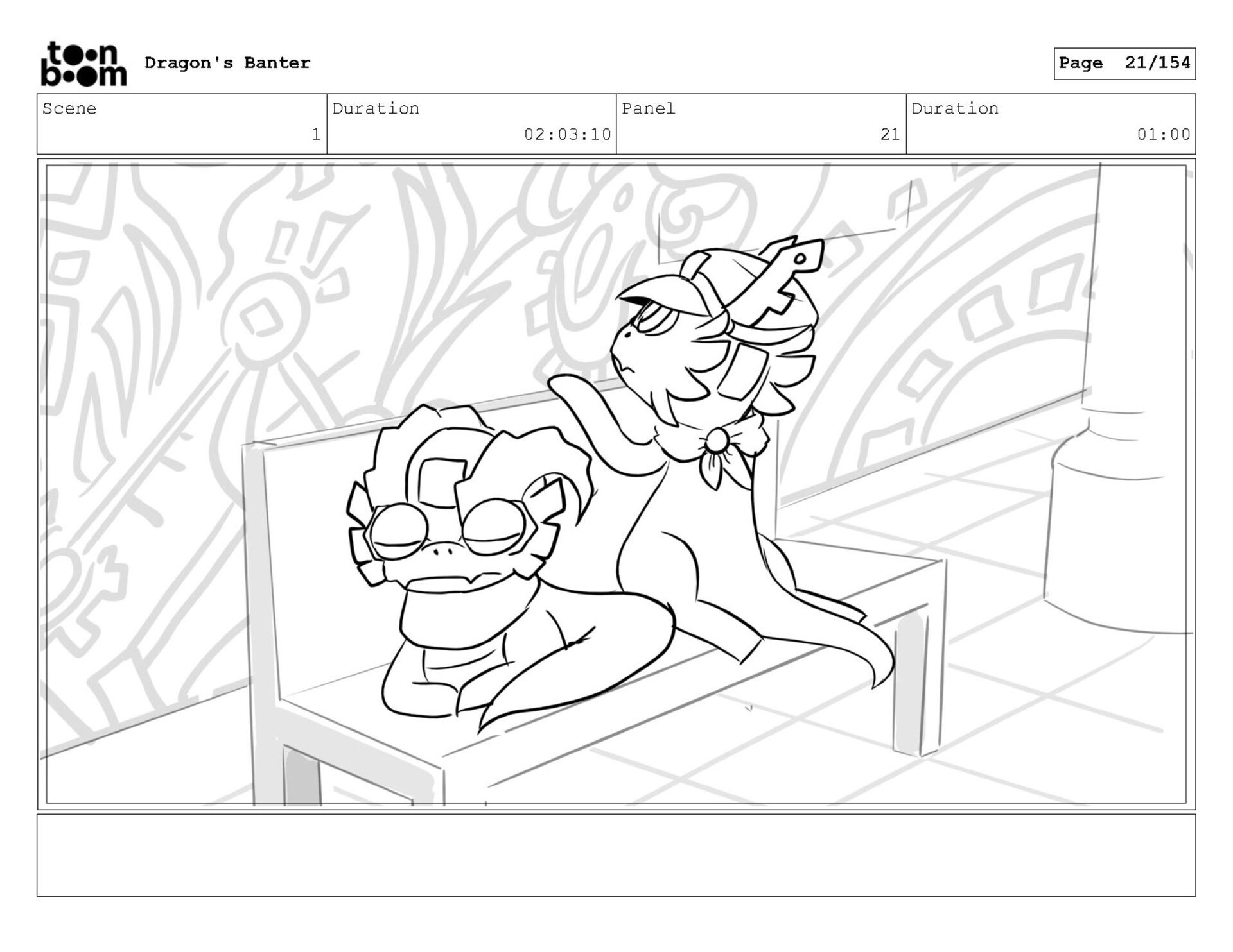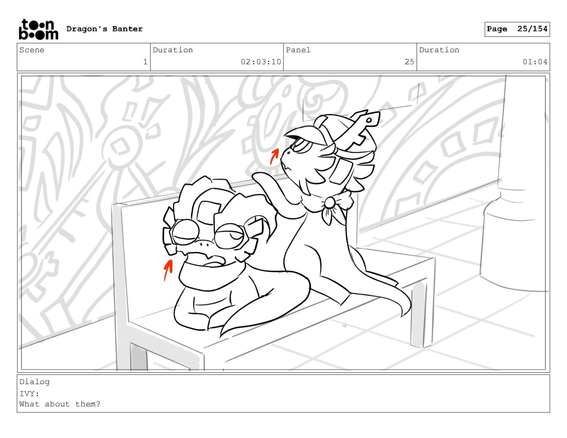 Storyboard produced for a University project, a comedic conversation exchange between two dragons about some fascinating markings on the walls. Featuring an original script and character designs.