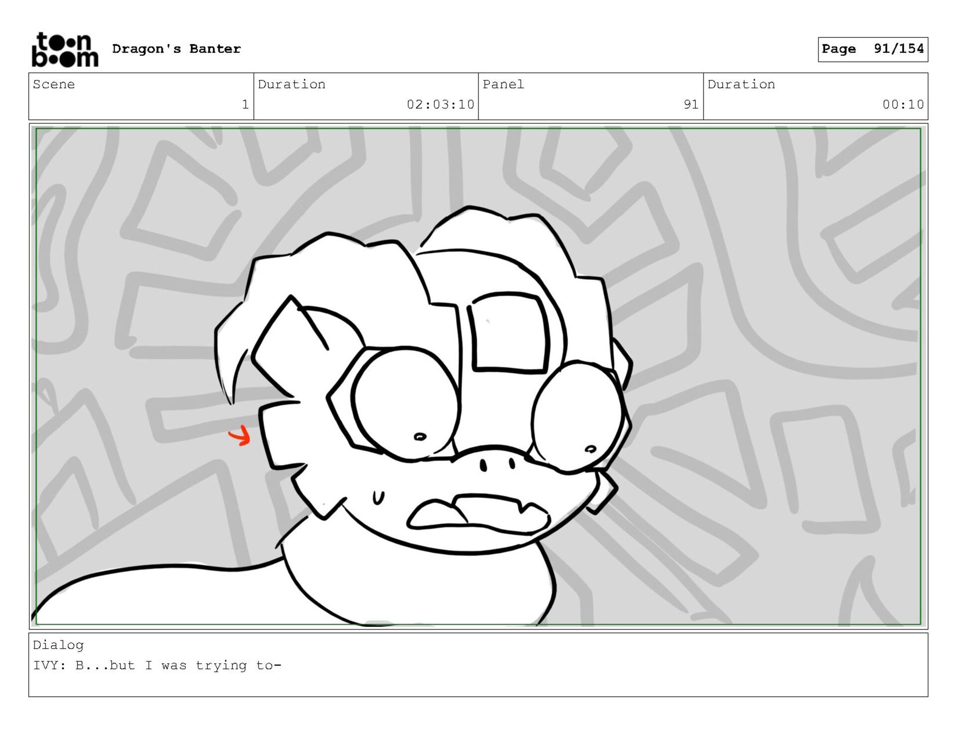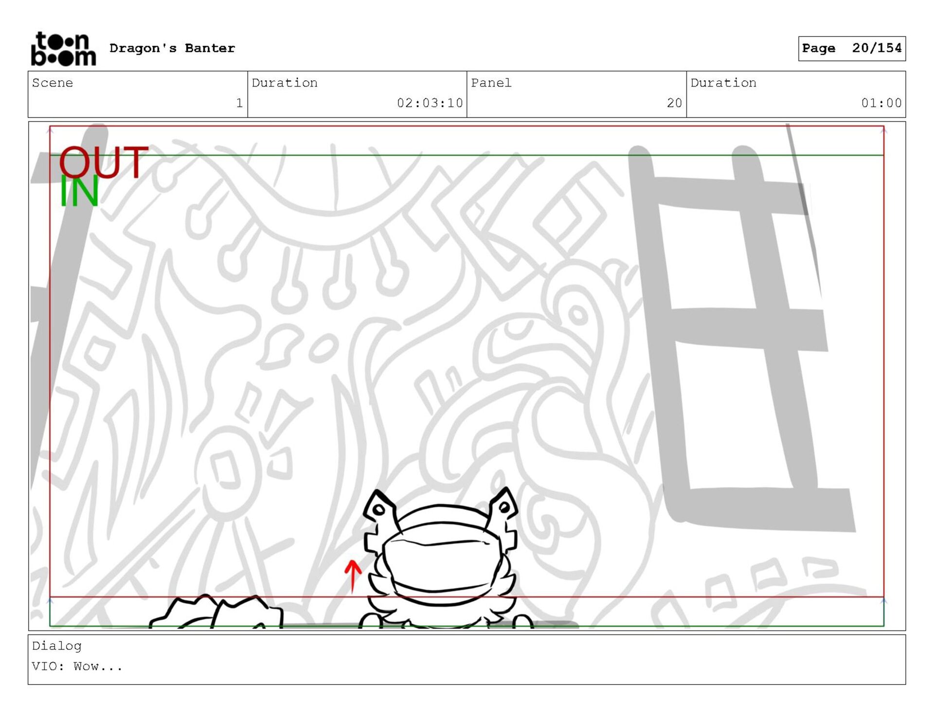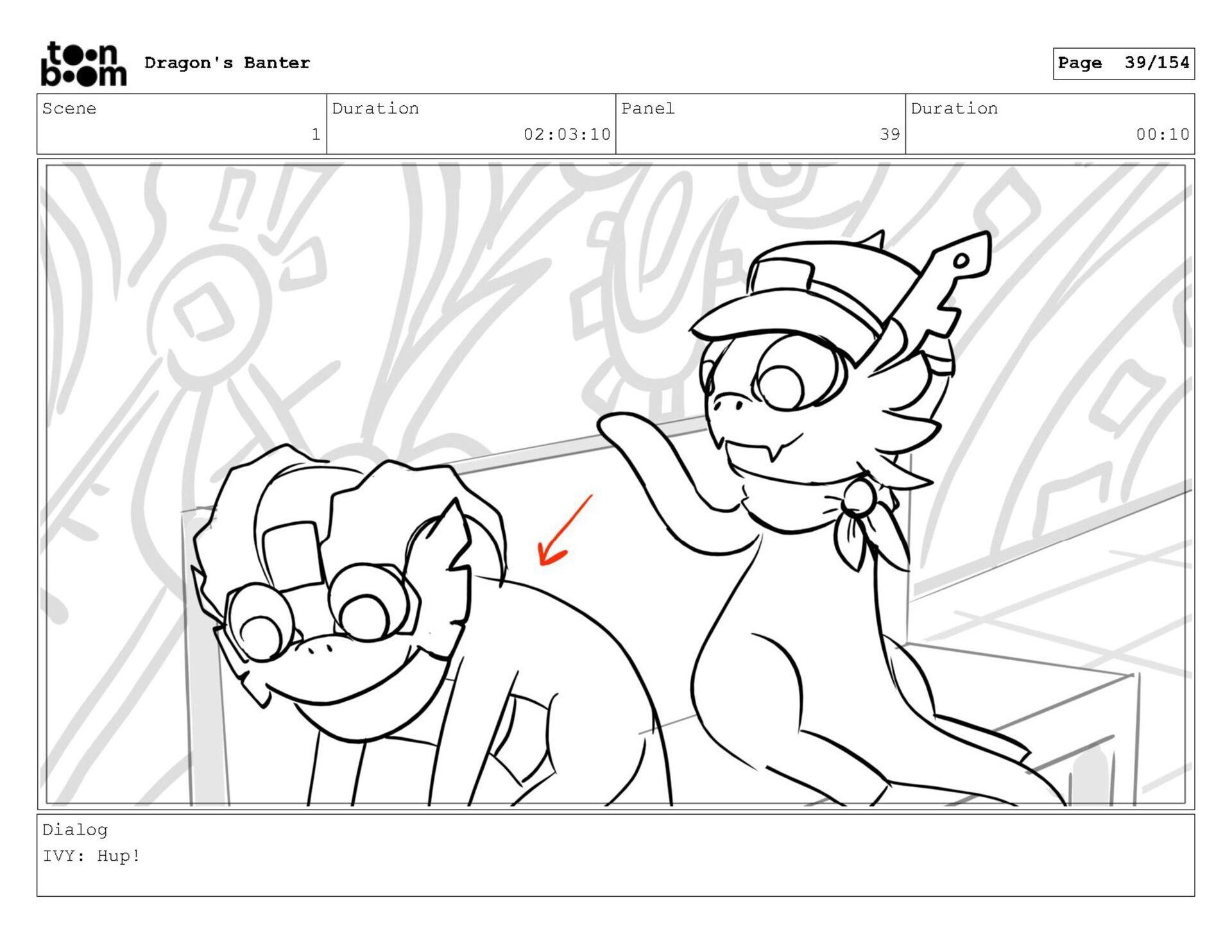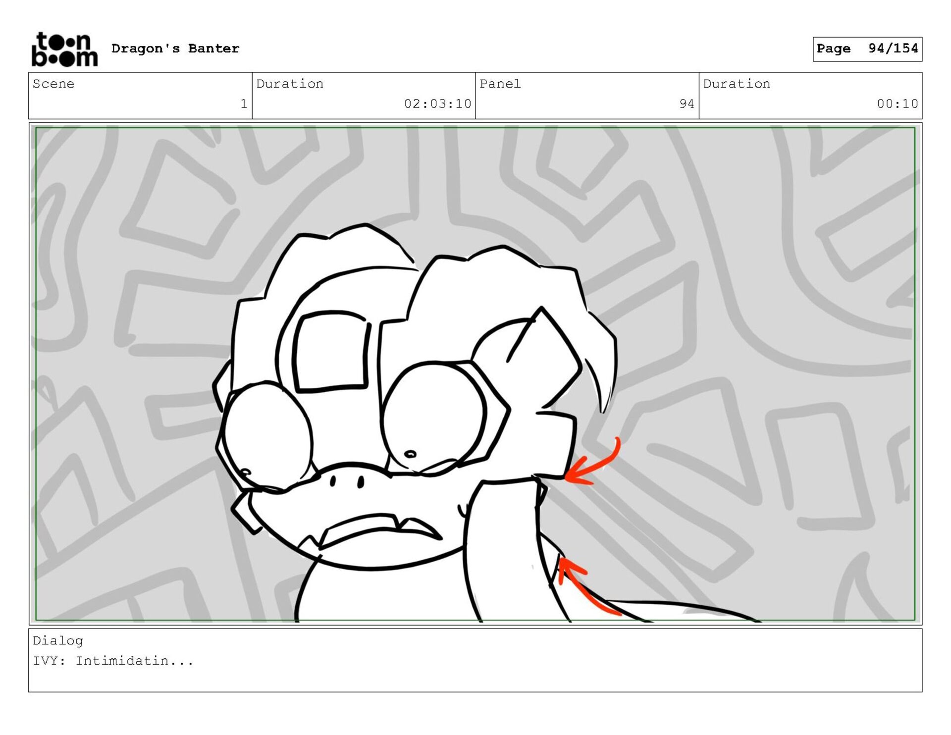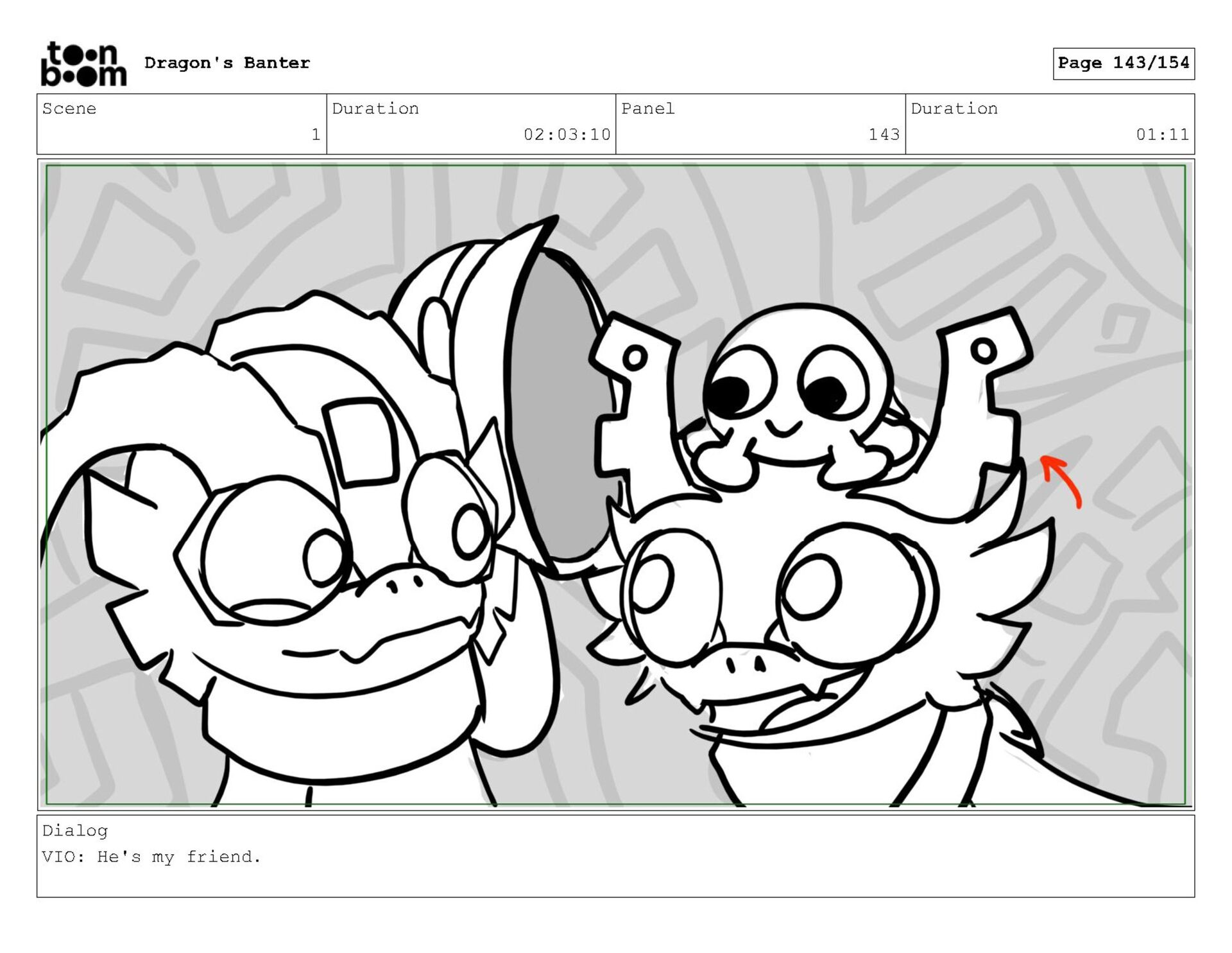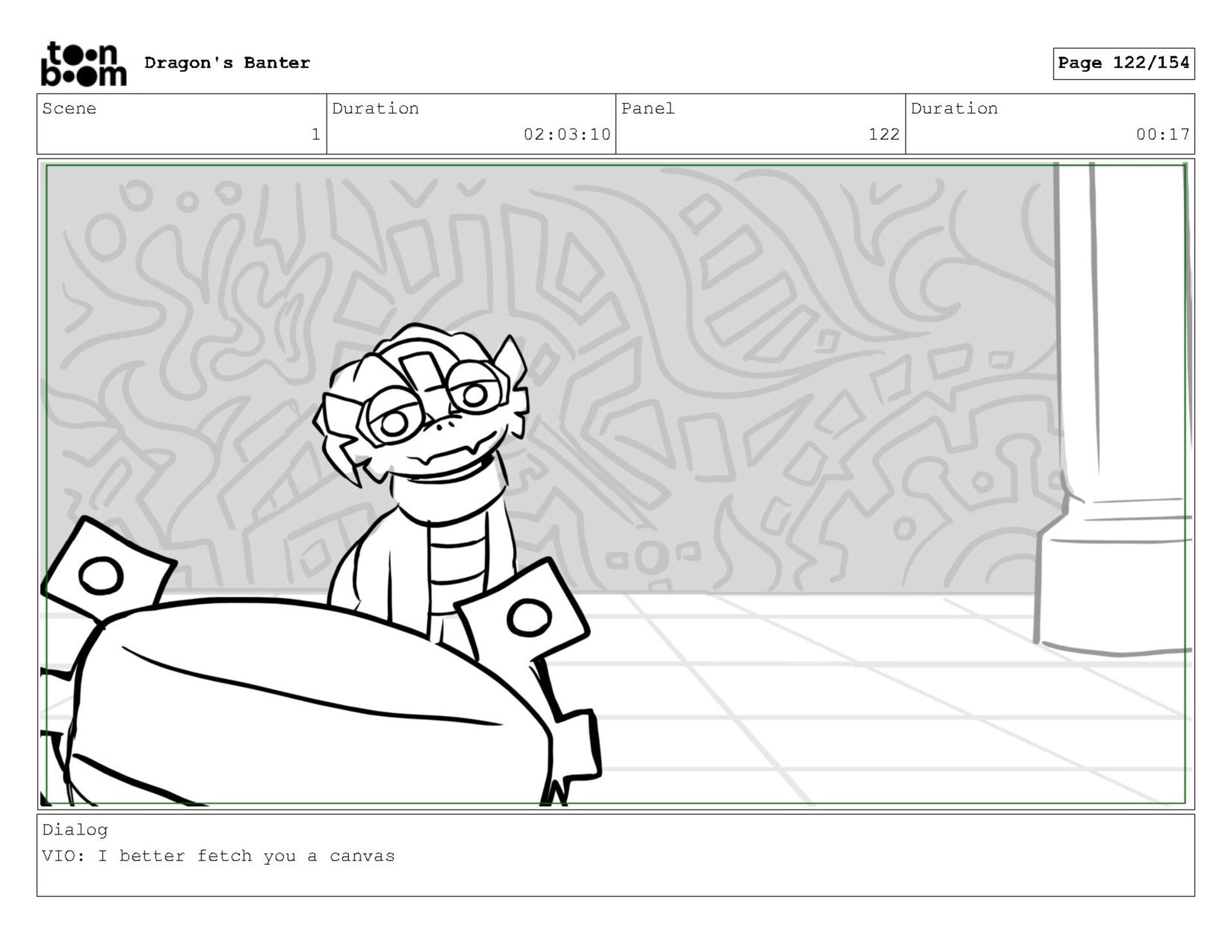 Storyboard produced for a University project, a comedic conversation exchange between two dragons about some fascinating markings on the walls. Featuring an original script and character designs.