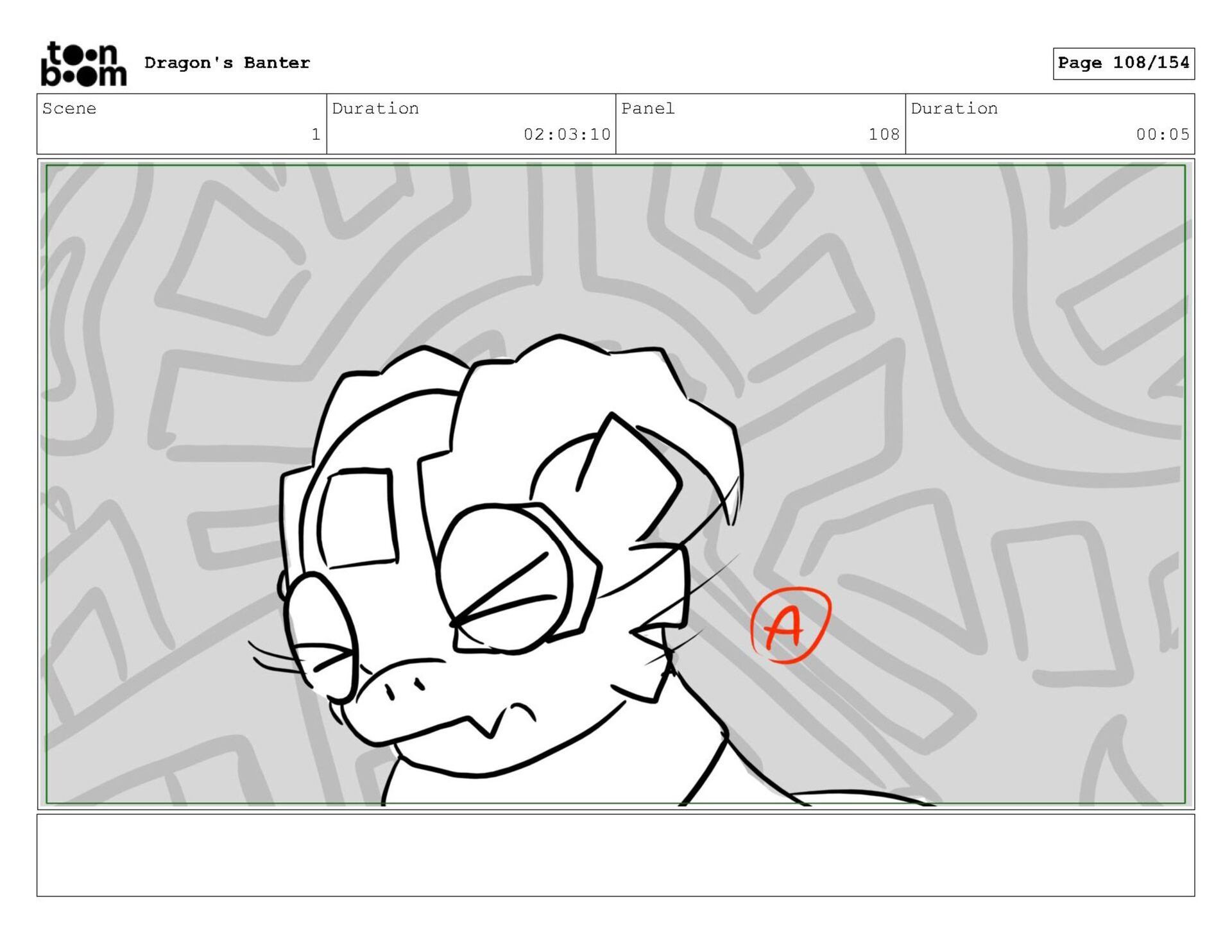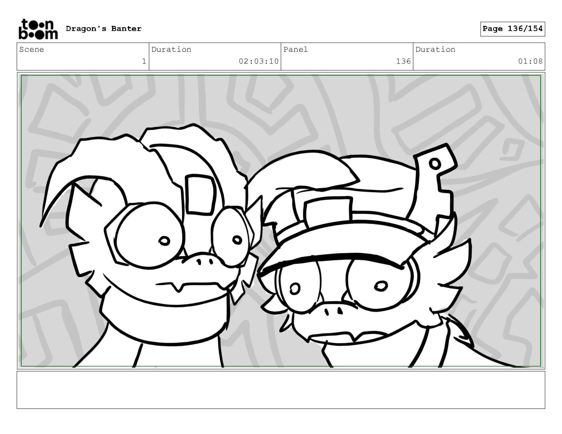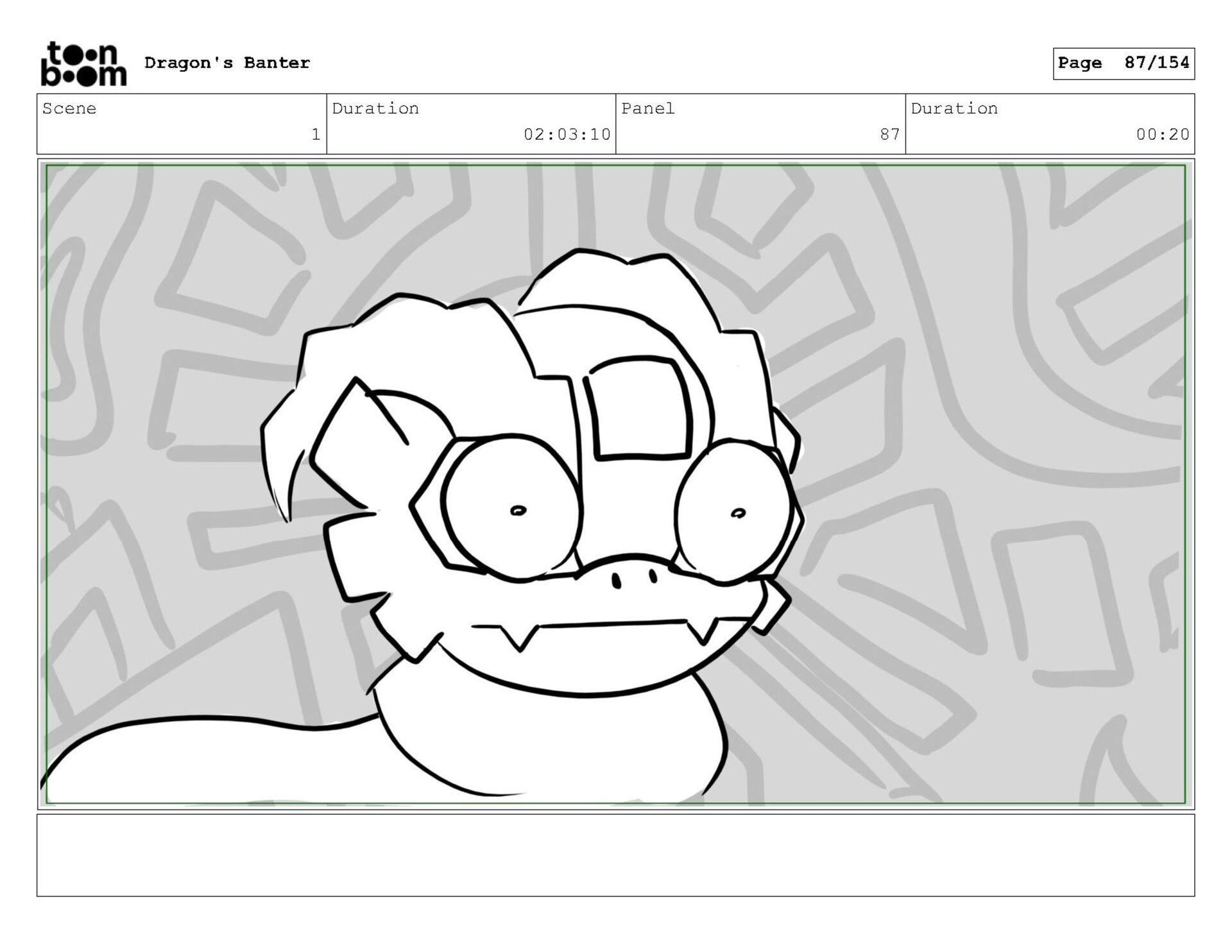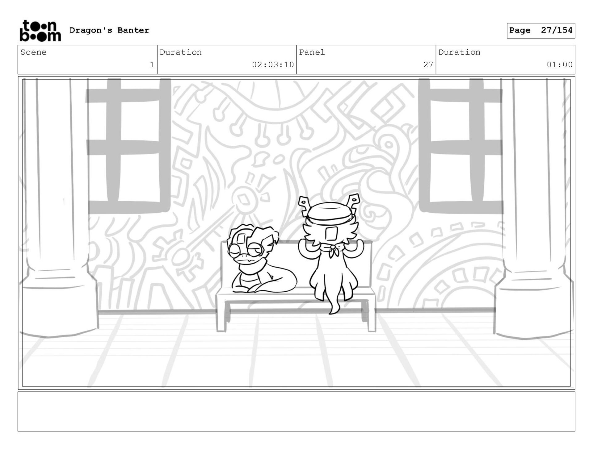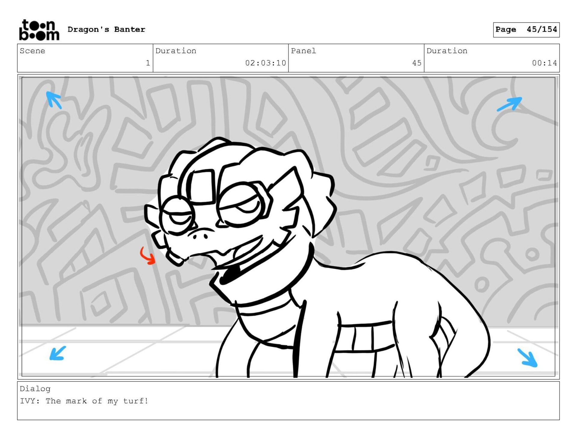 Storyboard produced for a University project, a comedic conversation exchange between two dragons about some fascinating markings on the walls. Featuring an original script and character designs.