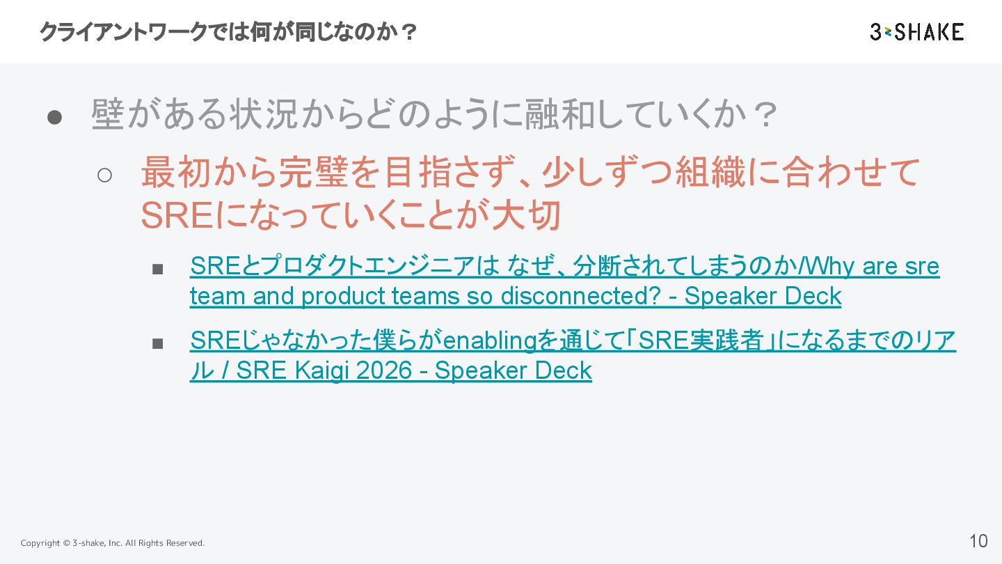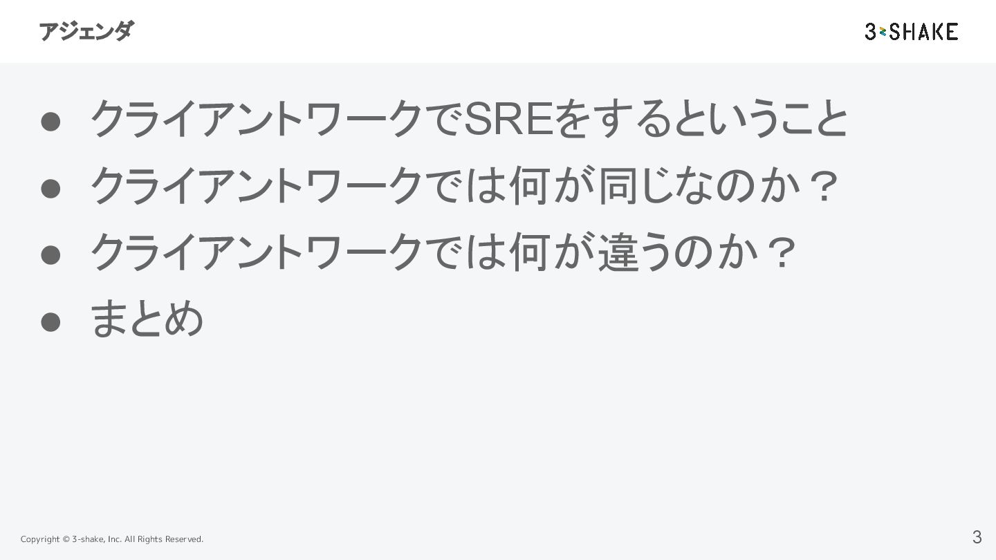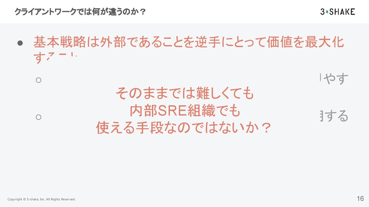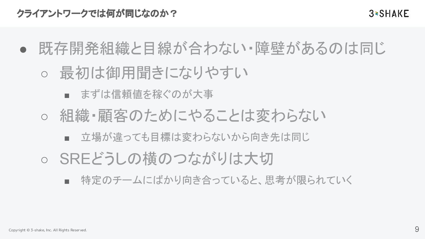 クライアントワークでSREを支援するという特殊な立ち位置だからこそ見える、クライアントワークでSREすることと事業会社でSREをすることの違いを話します。