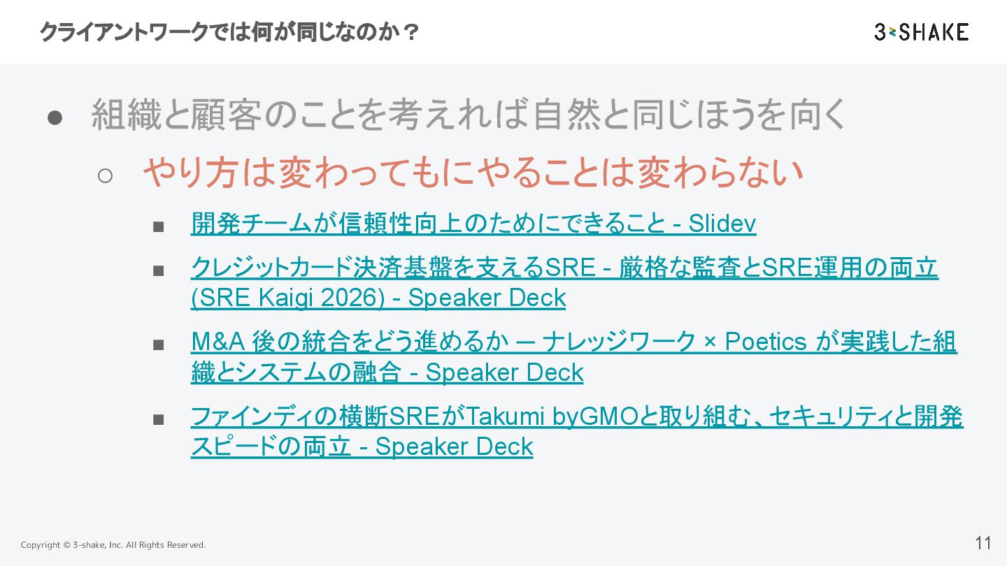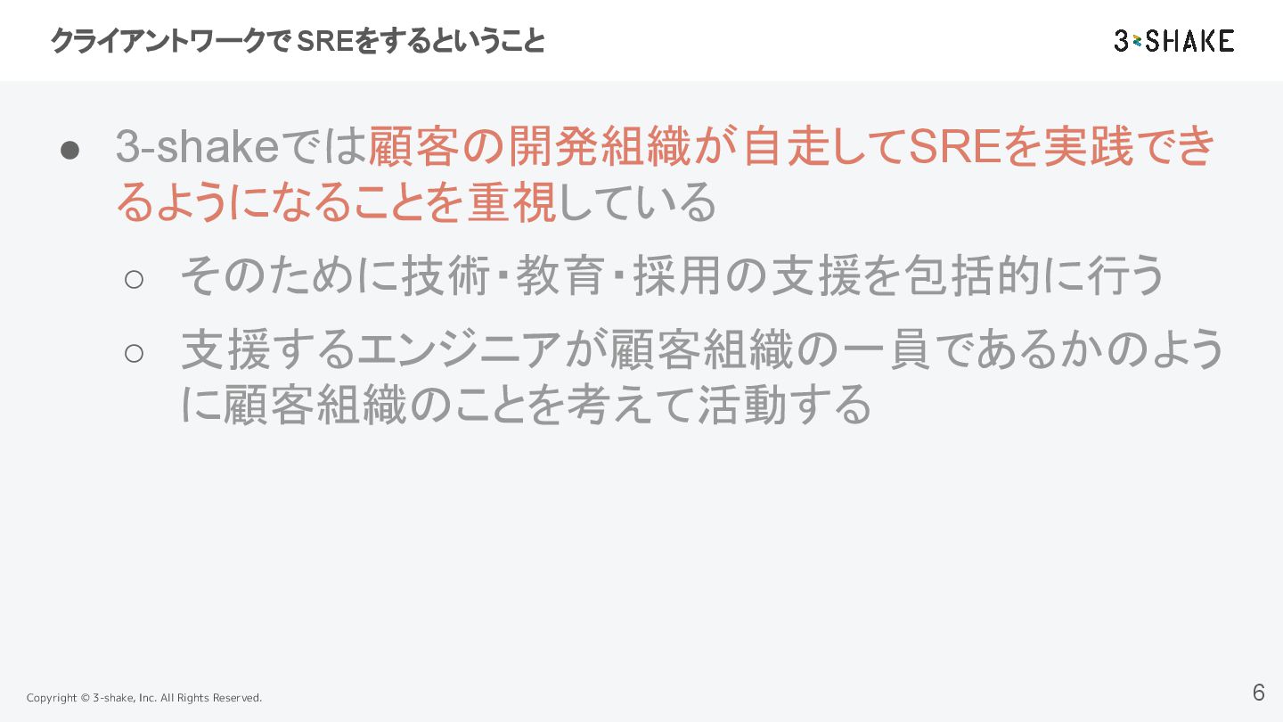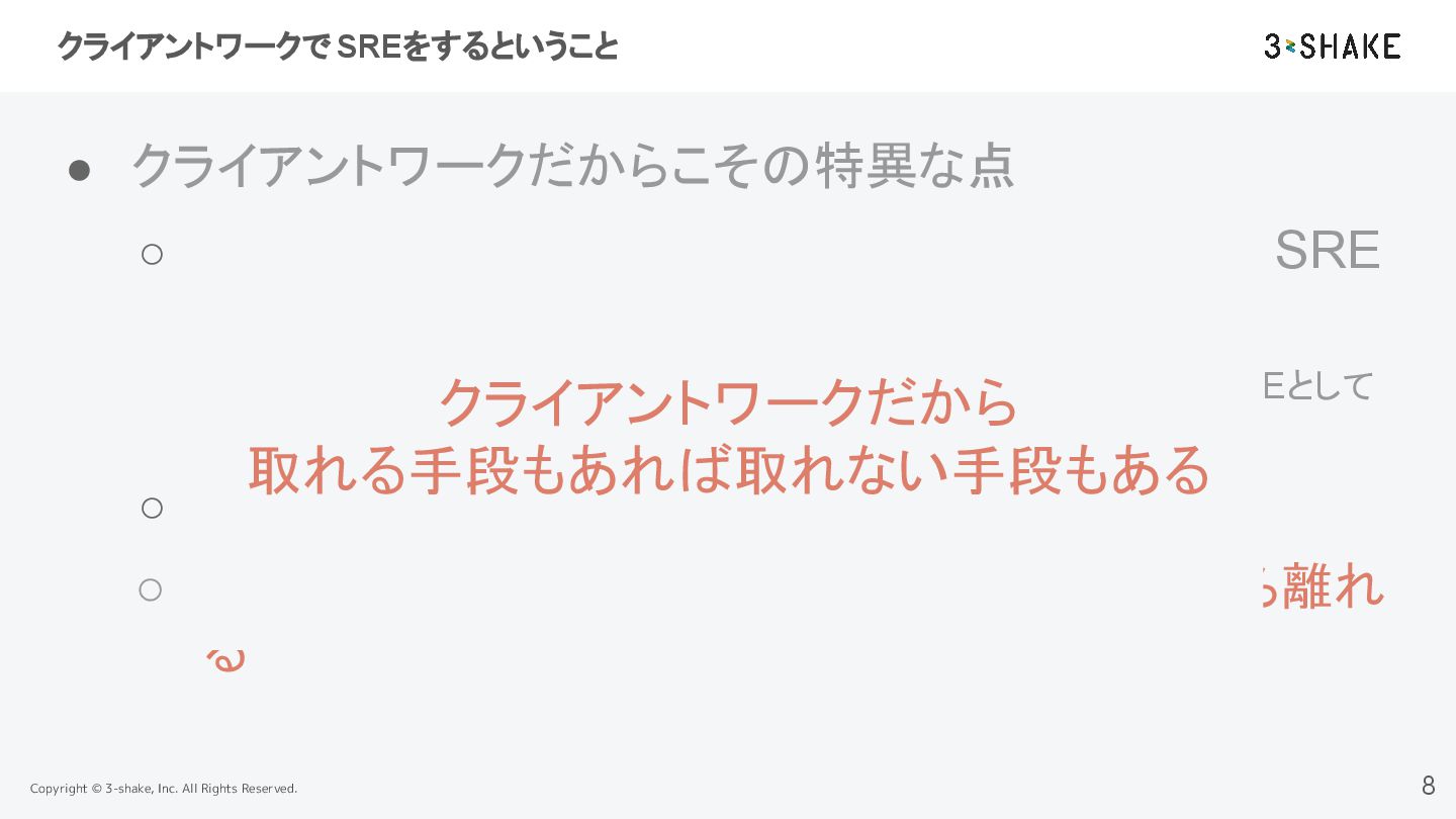 クライアントワークでSREを支援するという特殊な立ち位置だからこそ見える、クライアントワークでSREすることと事業会社でSREをすることの違いを話します。