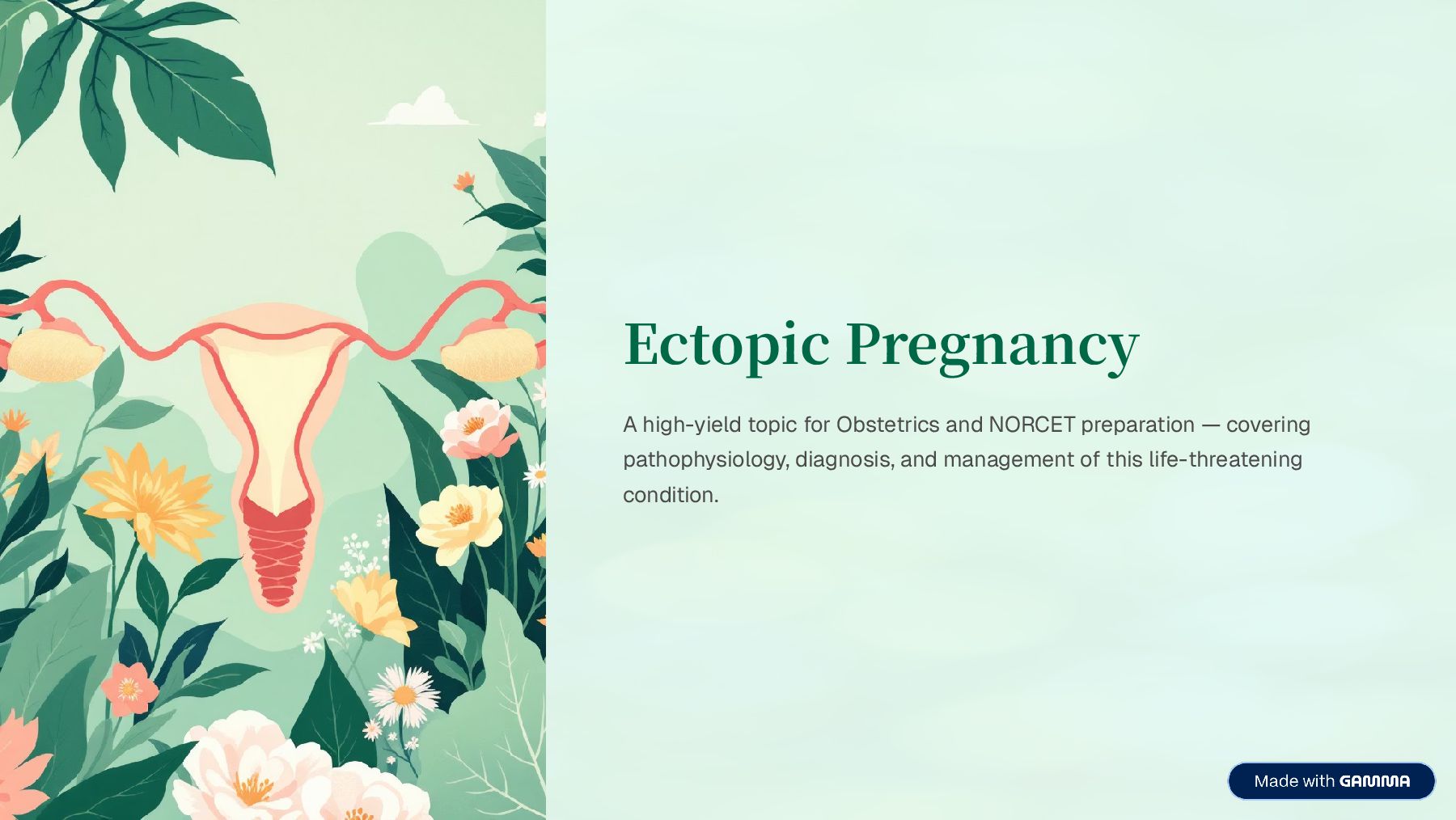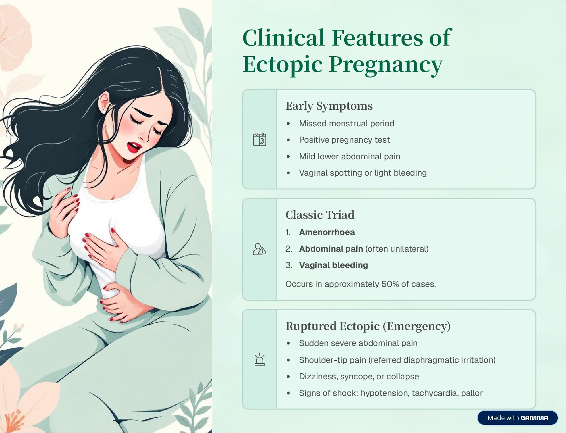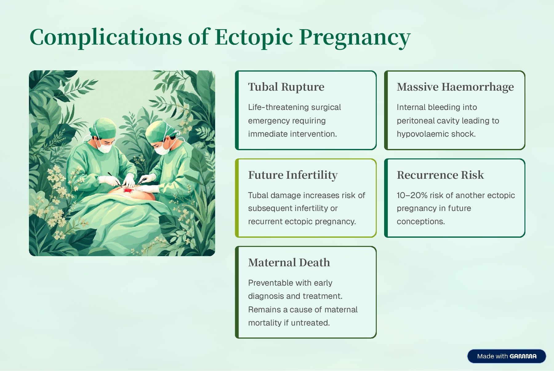 immediate intervention. Massive Haemorrhage Internal bleeding into peritoneal cavity leading to hypovolaemic shock. Future Infertility Tubal damage increases risk of subsequent infertility or recurrent ectopic pregnancy. Recurrence Risk 10320% risk of another ectopic pregnancy in future conceptions. Maternal Death Preventable with early diagnosis and treatment. Remains a cause of maternal mortality if untreated.