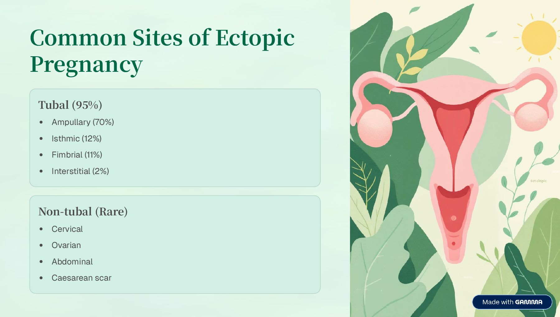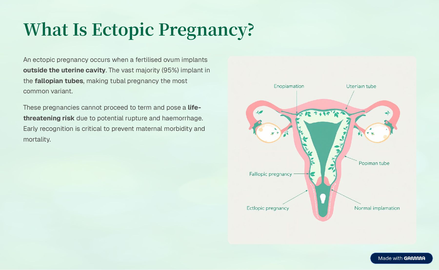 fertilised ovum implants outside the uterine cavity. The vast majority (95%) implant in the fallopian tubes, making tubal pregnancy the most common variant. These pregnancies cannot proceed to term and pose a life- threatening risk due to potential rupture and haemorrhage. Early recognition is critical to prevent maternal morbidity and mortality.