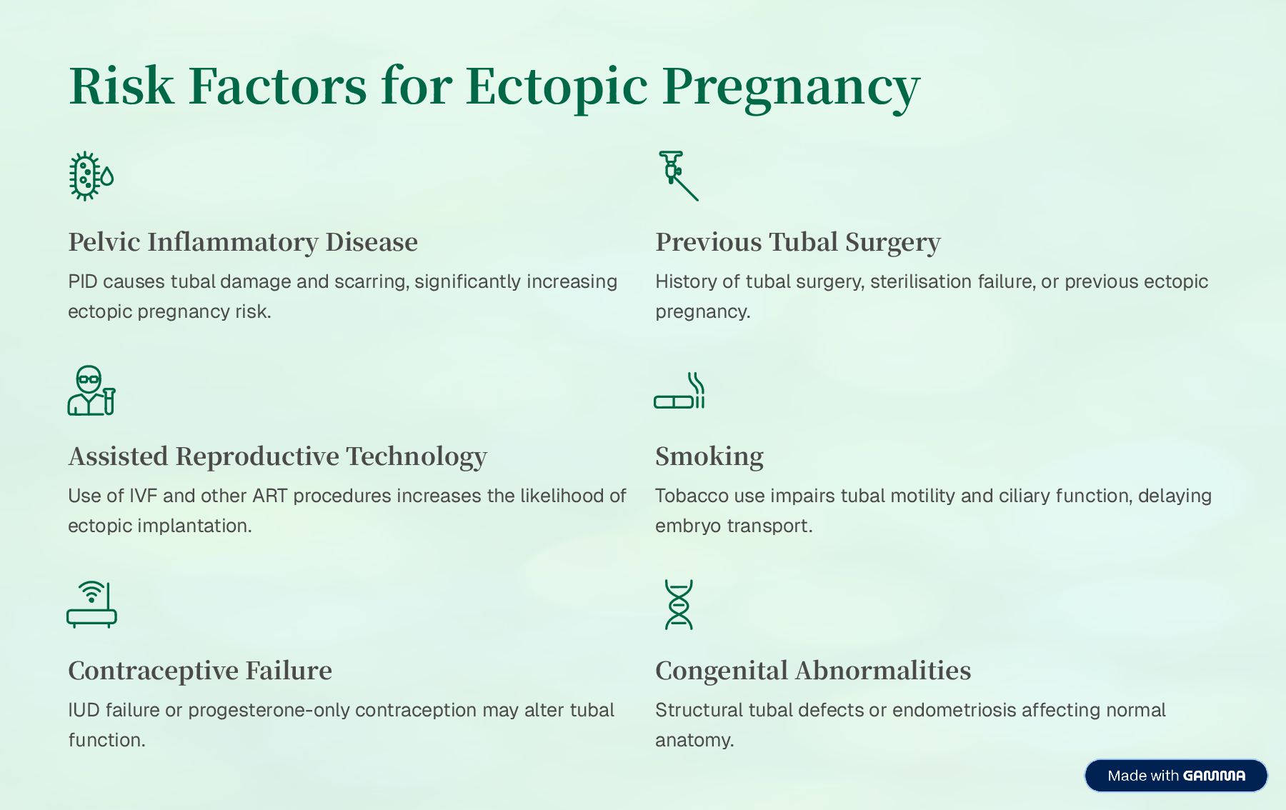 tubal damage and scarring, significantly increasing ectopic pregnancy risk. Previous Tubal Surgery History of tubal surgery, sterilisation failure, or previous ectopic pregnancy. Assisted Reproductive Technology Use of IVF and other ART procedures increases the likelihood of ectopic implantation. Smoking Tobacco use impairs tubal motility and ciliary function, delaying embryo transport. Contraceptive Failure IUD failure or progesterone-only contraception may alter tubal function. Congenital Abnormalities Structural tubal defects or endometriosis affecting normal anatomy.