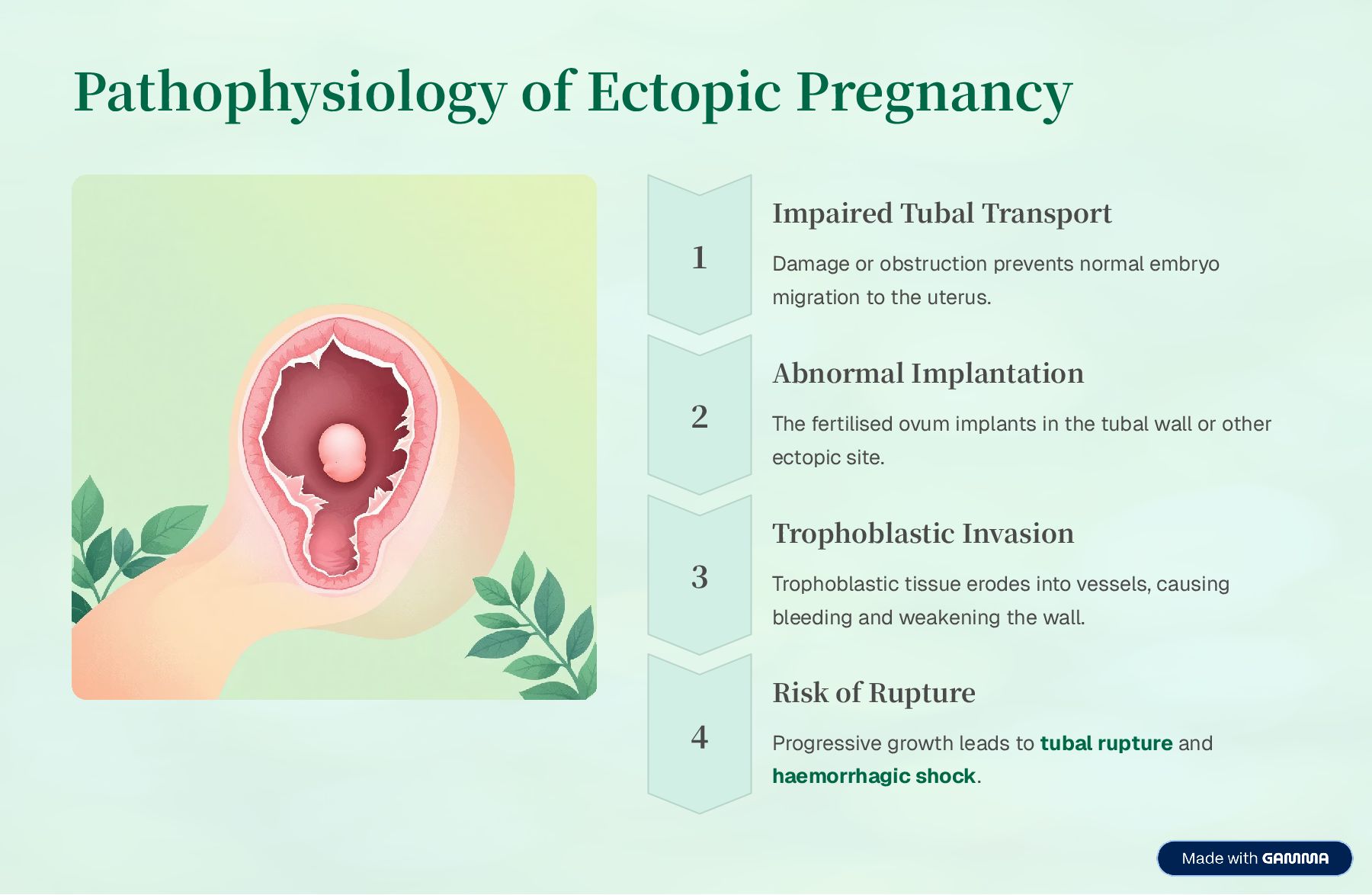 prevents normal embryo migration to the uterus. Abnormal Implantation The fertilised ovum implants in the tubal wall or other ectopic site. Trophoblastic Invasion Trophoblastic tissue erodes into vessels, causing bleeding and weakening the wall. Risk of Rupture Progressive growth leads to tubal rupture and haemorrhagic shock.