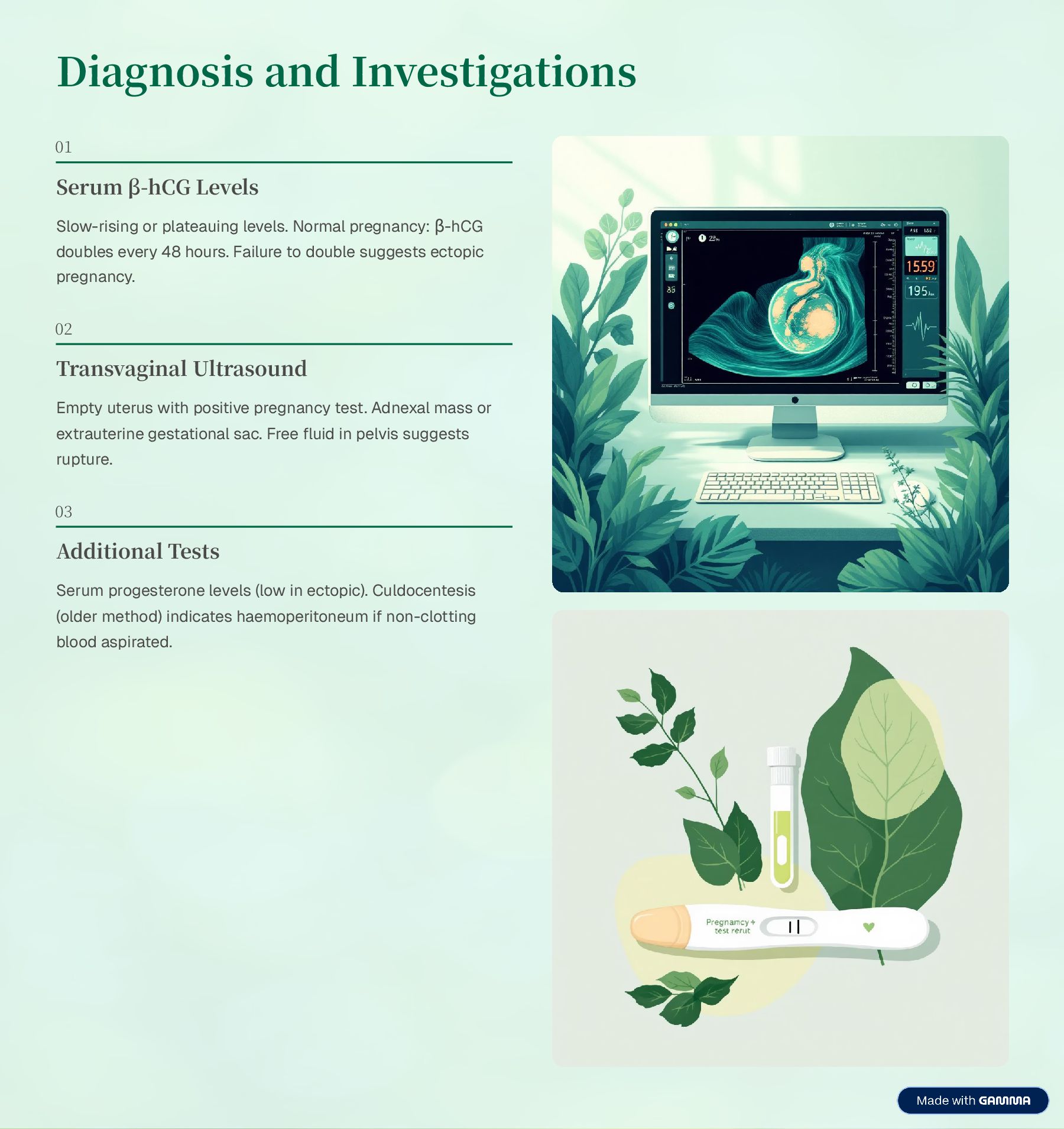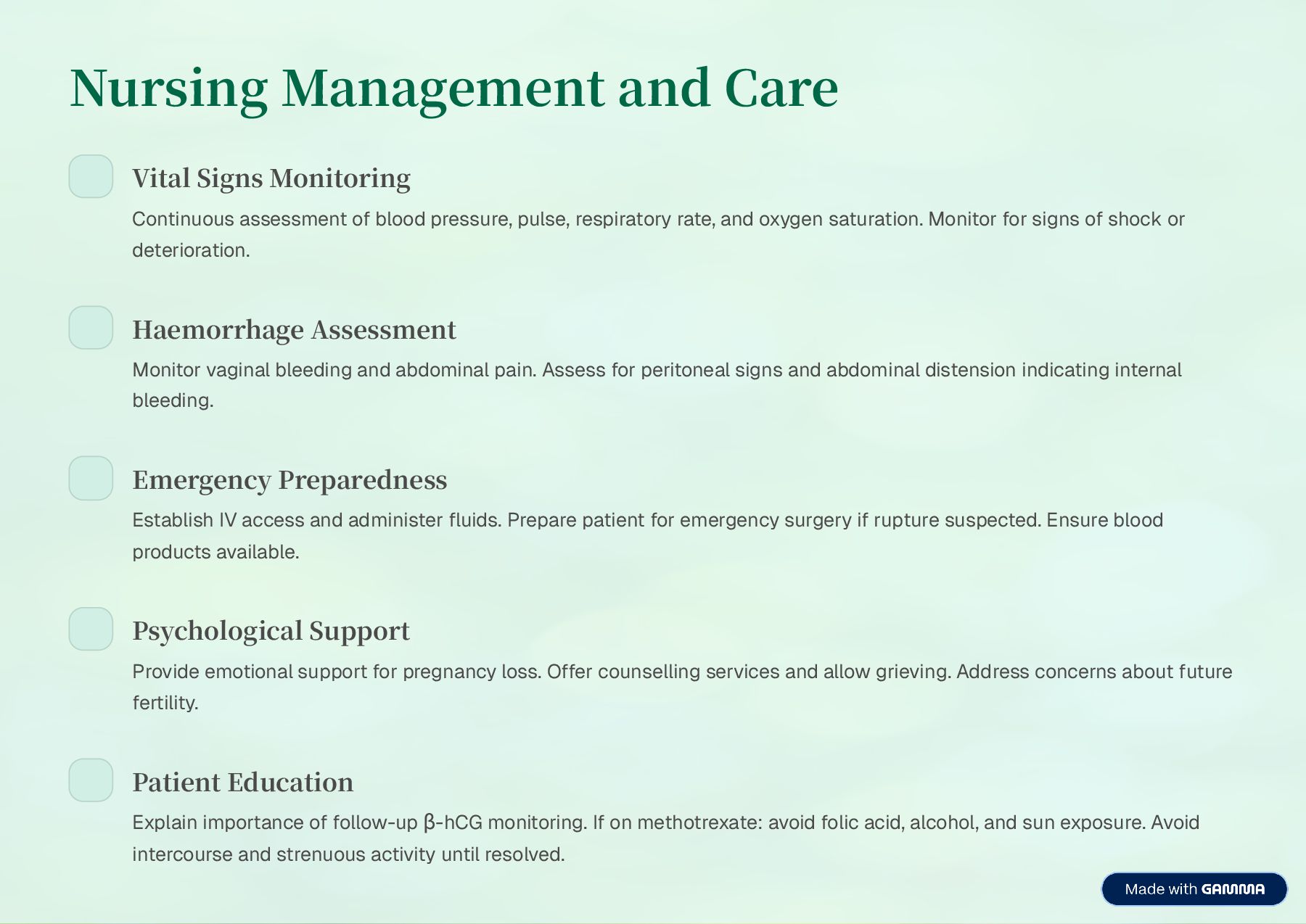 blood pressure, pulse, respiratory rate, and oxygen saturation. Monitor for signs of shock or deterioration. Haemorrhage Assessment Monitor vaginal bleeding and abdominal pain. Assess for peritoneal signs and abdominal distension indicating internal bleeding. Emergency Preparedness Establish IV access and administer fluids. Prepare patient for emergency surgery if rupture suspected. Ensure blood products available. Psychological Support Provide emotional support for pregnancy loss. Offer counselling services and allow grieving. Address concerns about future fertility. Patient Education Explain importance of follow-up ³-hCG monitoring. If on methotrexate: avoid folic acid, alcohol, and sun exposure. Avoid intercourse and strenuous activity until resolved.
