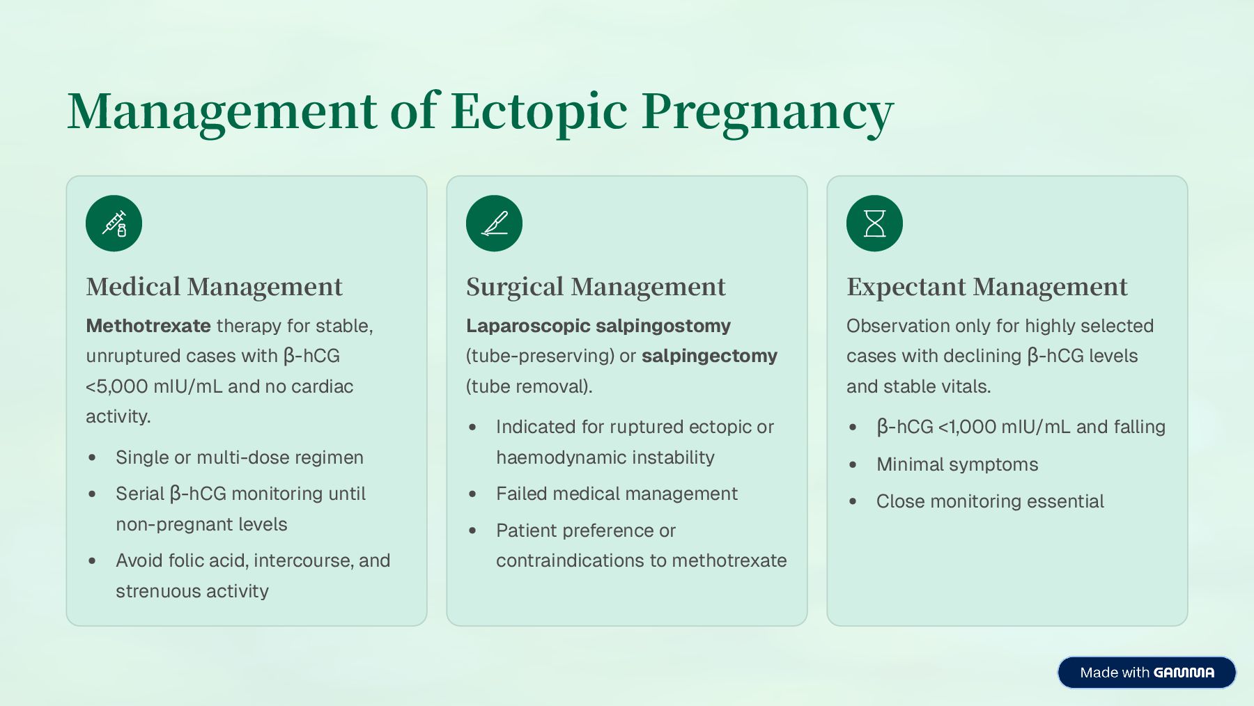 unruptured cases with ³-hCG <5,000 mIU/mL and no cardiac activity. Single or multi-dose regimen Serial ³-hCG monitoring until non-pregnant levels Avoid folic acid, intercourse, and strenuous activity Surgical Management Laparoscopic salpingostomy (tube-preserving) or salpingectomy (tube removal). Indicated for ruptured ectopic or haemodynamic instability Failed medical management Patient preference or contraindications to methotrexate Expectant Management Observation only for highly selected cases with declining ³-hCG levels and stable vitals. ³-hCG <1,000 mIU/mL and falling Minimal symptoms Close monitoring essential