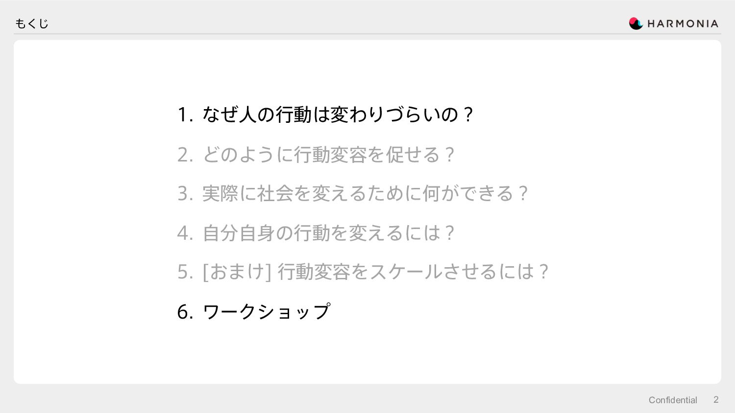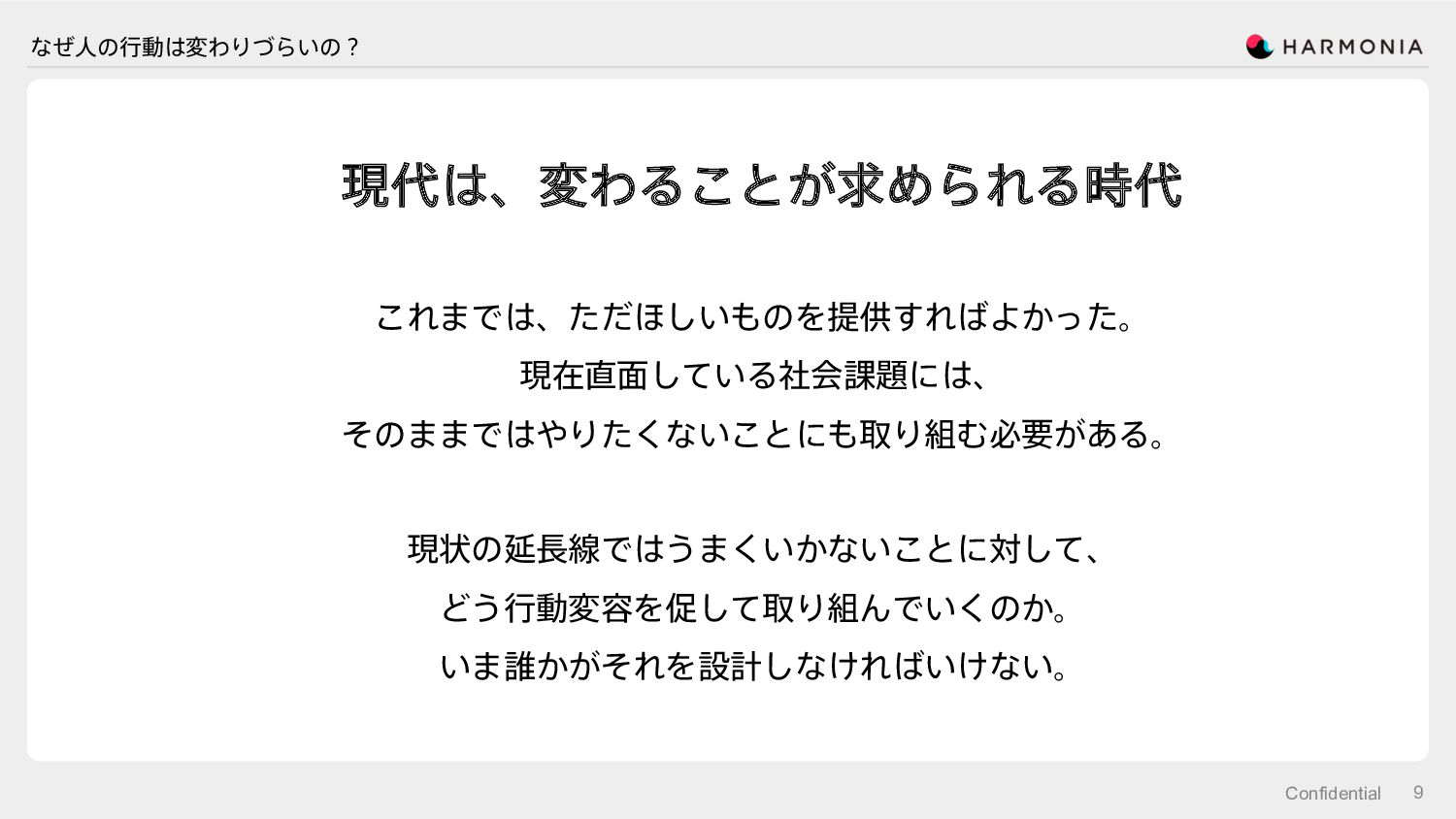 Confidential 2 ͘͡ ͳͥਓͷߦಈมΘΓͮΒ͍ͷʁ ͲͷΑ͏ʹߦಈม༰ΛଅͤΔʁ ࣮ࡍʹࣾձΛม͑ΔͨΊʹԿ͕Ͱ͖Δʁ