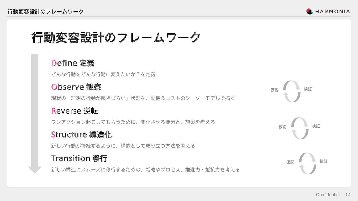 Confidential 12 ߦಈม༰ઃܭͷϑϨʔϜϫʔΫ ߦಈม༰ઃܭͷϑϨʔϜϫʔΫ %FGJOF ఆٛ ͲΜͳߦಈΛͲΜͳߦಈʹม͍͔͑ͨʁΛఆٛ 0CTFSWF ؍ ݱঢ়ͷʮཧͷߦಈ͕ى͖ͮΒ͍ʯঢ়گΛɺಈػˍίετͷγʔιʔϞσϧͰඳ͘