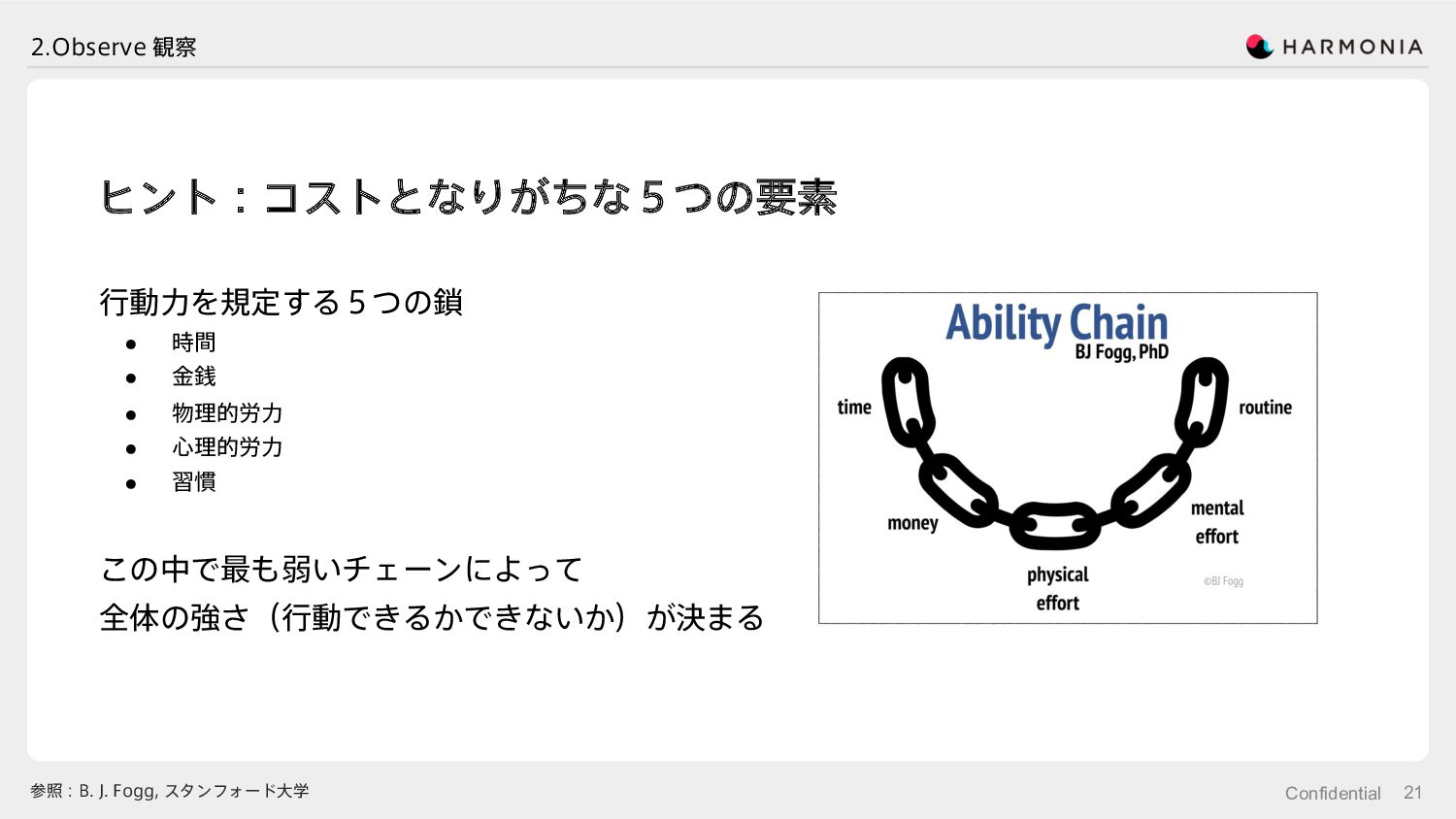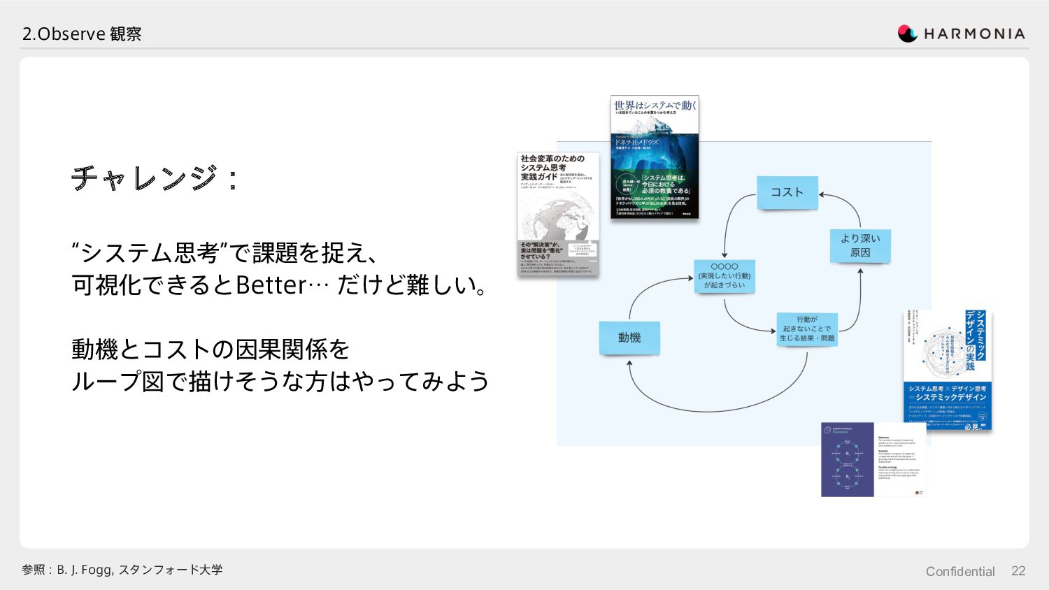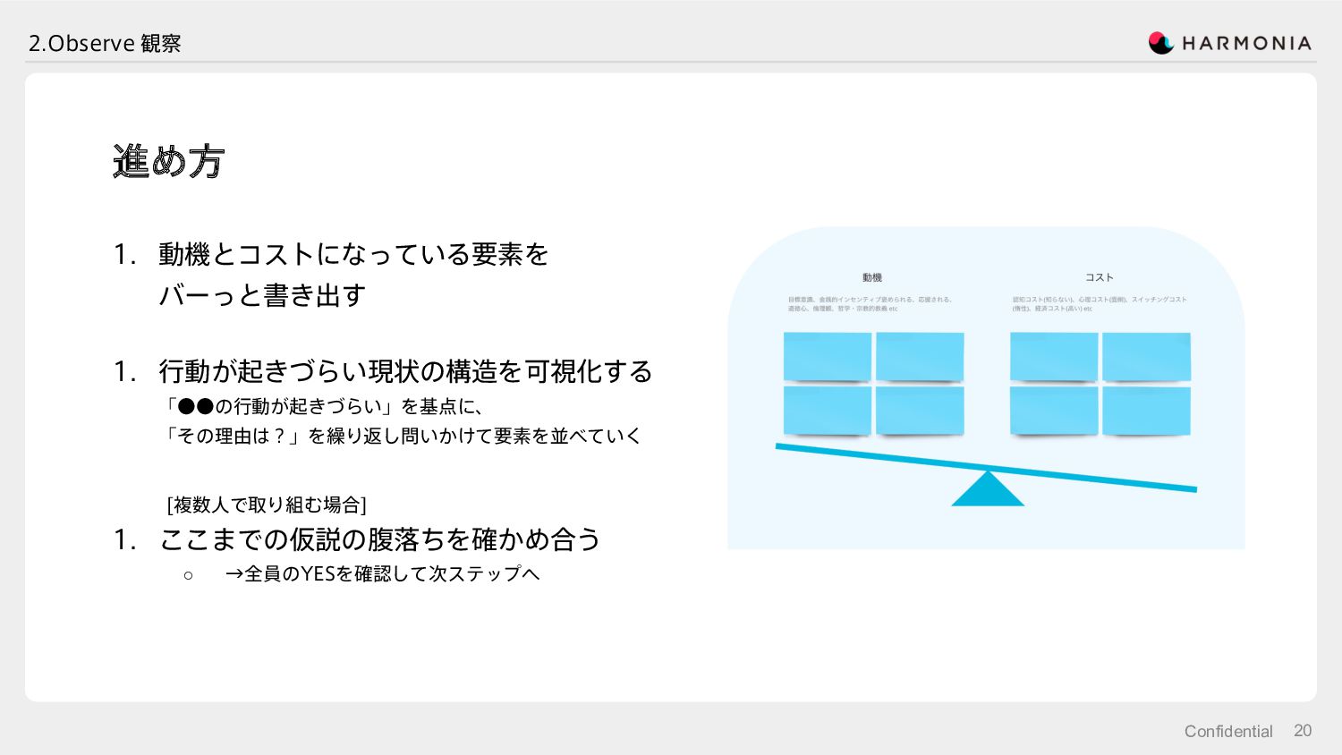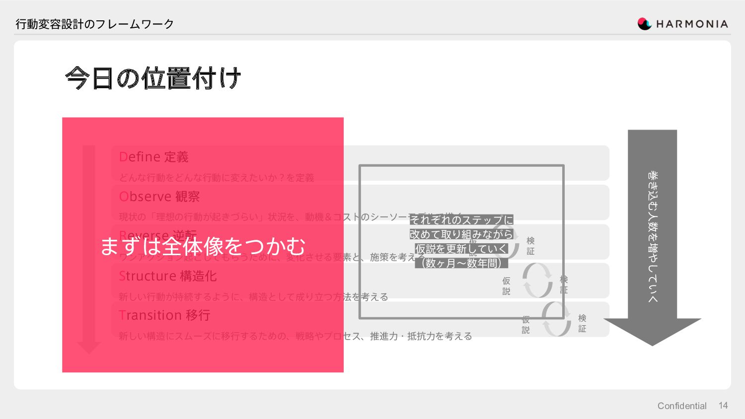 Confidential 13 ͦΕͰνϟϨϯδͯ͠Έ·͠ΐ͏ʂ ϫʔΫγϣοϓͷྲྀΕ %FGJOF ఆٛ ͲΜͳߦಈΛͲΜͳߦಈʹม͍͔͑ͨʁΛఆٛ 0CTFSWF ؍ ݱঢ়ͷʮཧͷߦಈ͕ى͖ͮΒ͍ʯঢ়گΛɺಈػˍίετͷγʔιʔϞσϧͰඳ͘