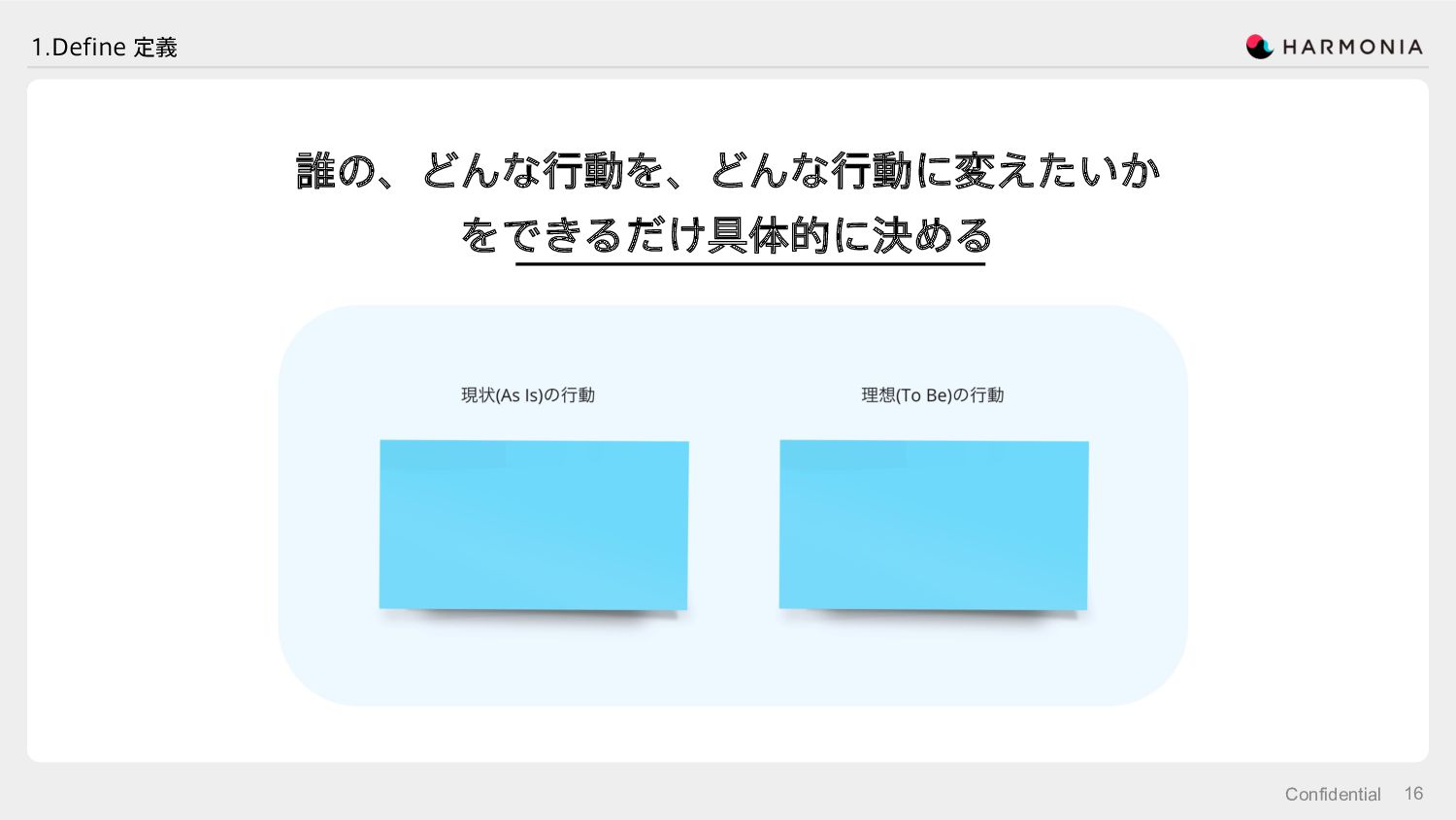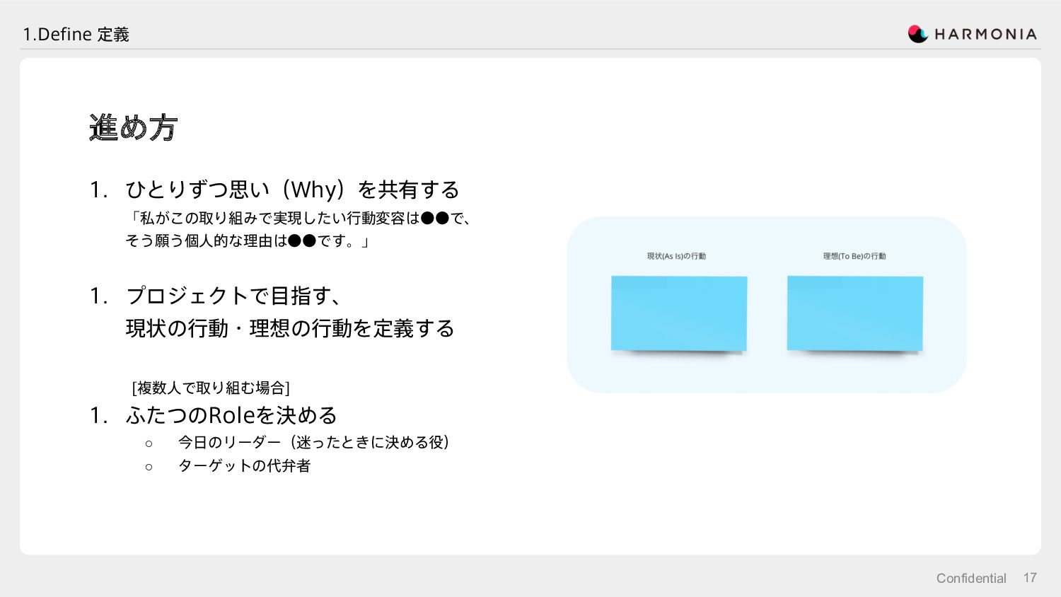 Confidential 17 %FGJOFఆٛ ͻͱΓͣͭࢥ͍ʢ8IZʣΛڞ༗͢Δ ʮࢲ͕͜ͷऔΓΈͰ࣮ݱ͍ͨ͠ߦಈม༰˔˔Ͱɺ ͦ͏ئ͏ݸਓతͳཧ༝˔˔Ͱ͢ɻʯ ϓϩδΣΫτͰࢦ͢ɺ ݱঢ়ͷߦಈɾཧͷߦಈΛఆٛ͢Δ