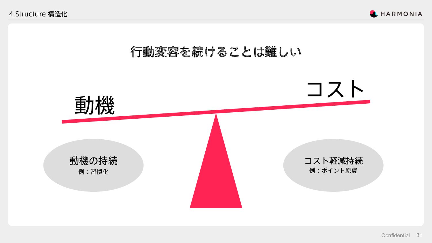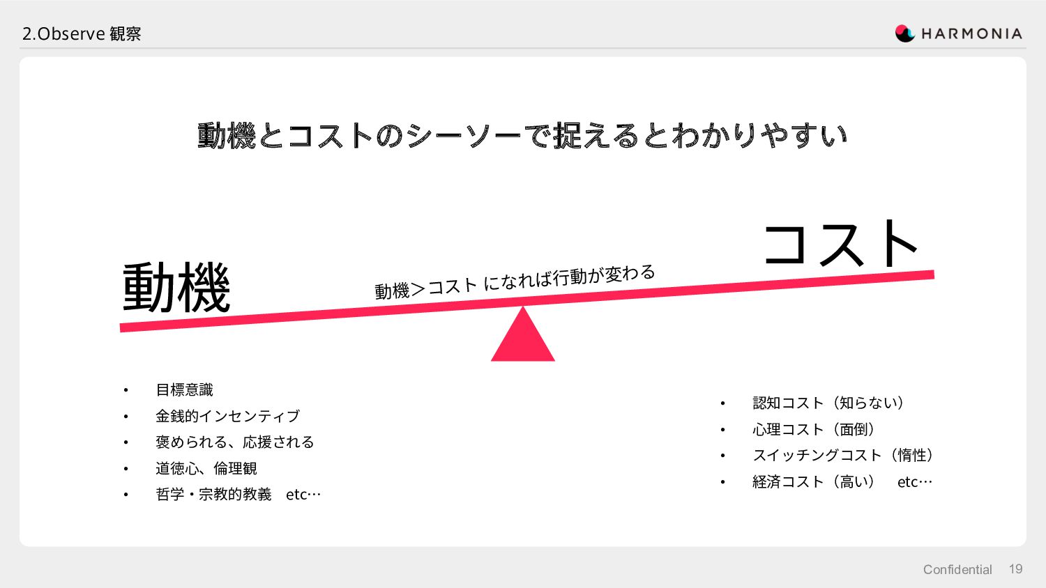 Confidential 19 0CTFSWF؍ ಈػͱίετͷγʔιʔͰଊ͑ΔͱΘ͔Γ͍͢ ಈػ ίετ 動機>コスト になれば⾏動が変わる • ⽬標意識