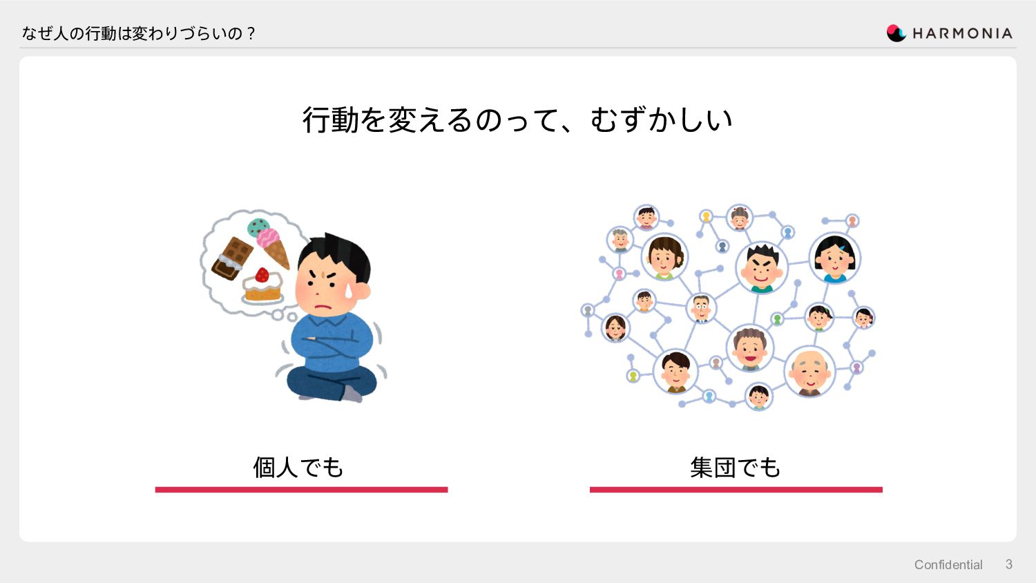 Confidential 3 ͳͥਓͷߦಈมΘΓͮΒ͍ͷʁ ߦಈΛม͑ΔͷͬͯɺΉ͔͍ͣ͠ ݸਓͰ ूஂͰ