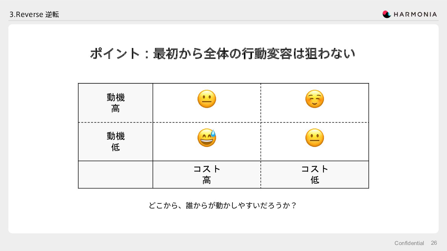 Confidential 26 3FWFSTFٯస ϙΠϯτɿ࠷ॳ͔Βશମͷߦಈม༰ૂΘͳ͍ 動機 高 😐 ☺ 動機 低