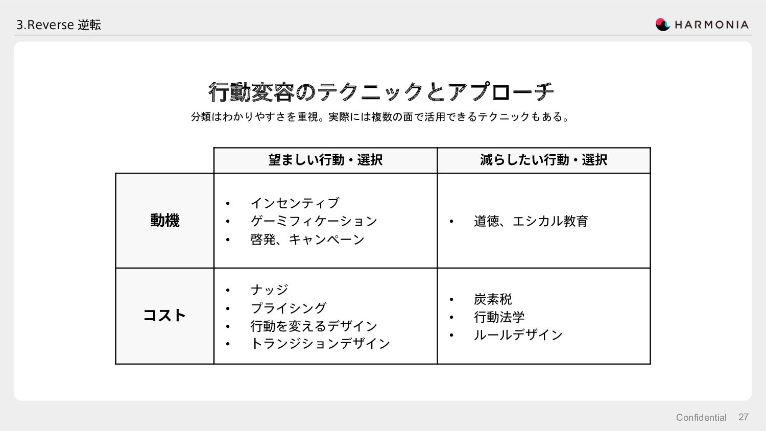 Confidential 27 3FWFSTFٯస ߦಈม༰ͷςΫχοΫͱΞϓϩʔν 望ましい⾏動‧選択 減らしたい⾏動‧選択 動機 • ΠϯηϯςΟϒ •