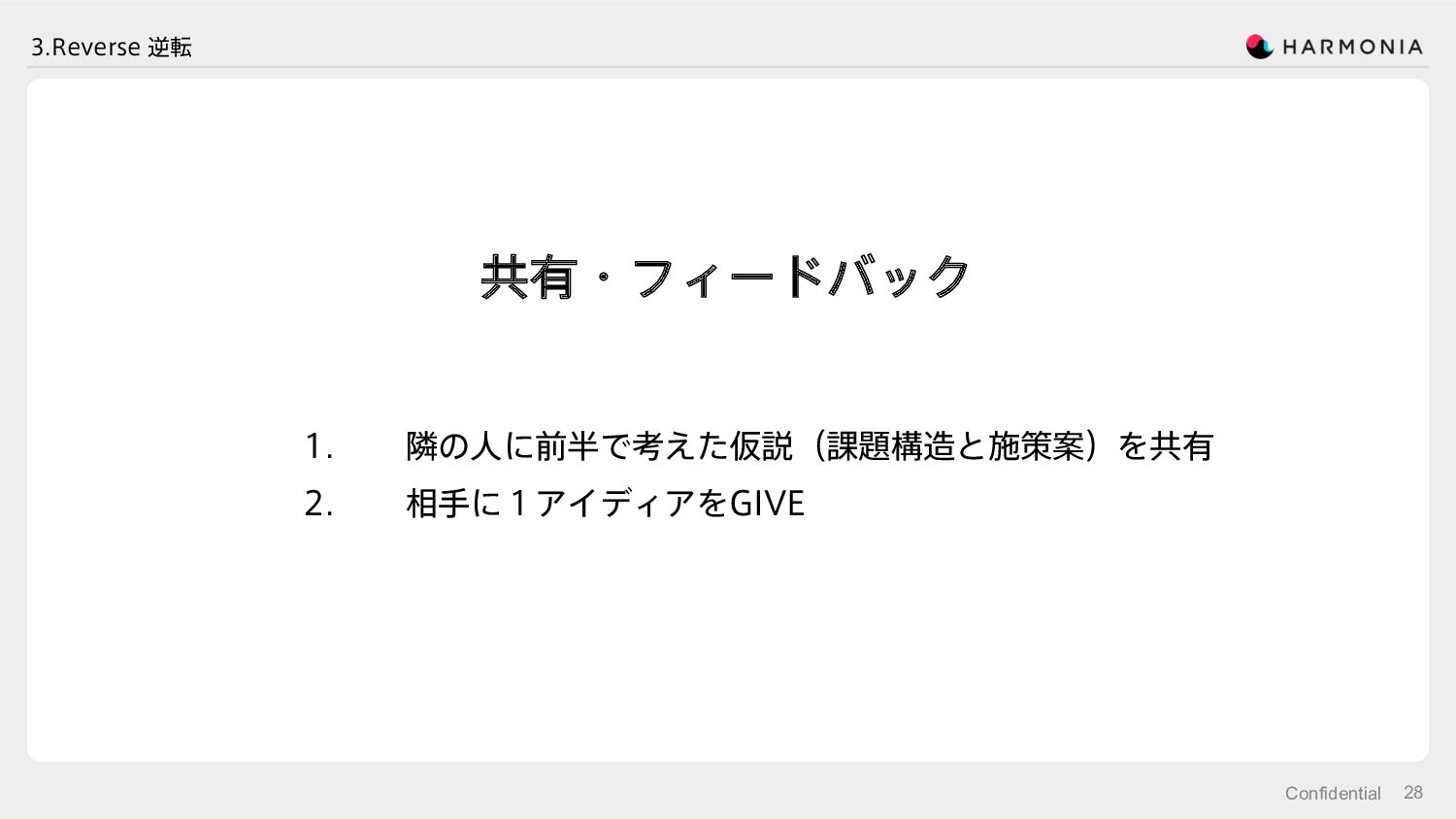 Confidential 28 3FWFSTFٯస ڞ༗ɾϑΟʔυόοΫ ྡͷਓʹલͰߟ͑ͨԾઆʢ՝ߏͱࢪࡦҊʣΛڞ༗ ૬खʹ̍ΞΠσΟΞΛ(*7&