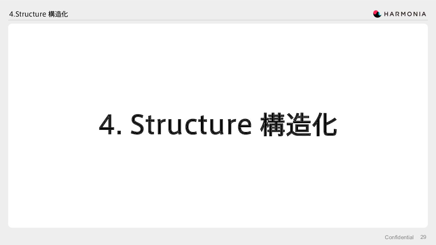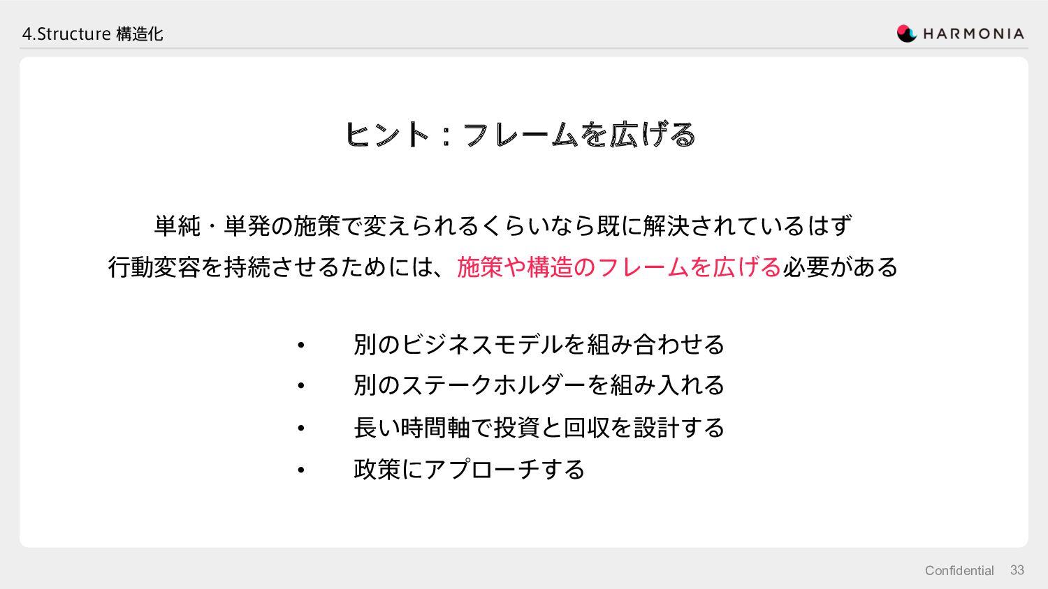 Confidential 33 4USVDUVSFߏԽ ώϯτɿϑϨʔϜΛ͛Δ ୯७ɾ୯ൃͷࢪࡦͰม͑ΒΕΔ͘Β͍ͳΒطʹղܾ͞Ε͍ͯΔͣ ߦಈม༰Λ࣋ଓͤ͞ΔͨΊʹɺࢪࡦߏͷϑϨʔϜΛ͛Δඞཁ͕͋Δ • ผͷϏδωεϞσϧΛΈ߹ΘͤΔ • ผͷεςʔΫϗϧμʔΛΈೖΕΔ