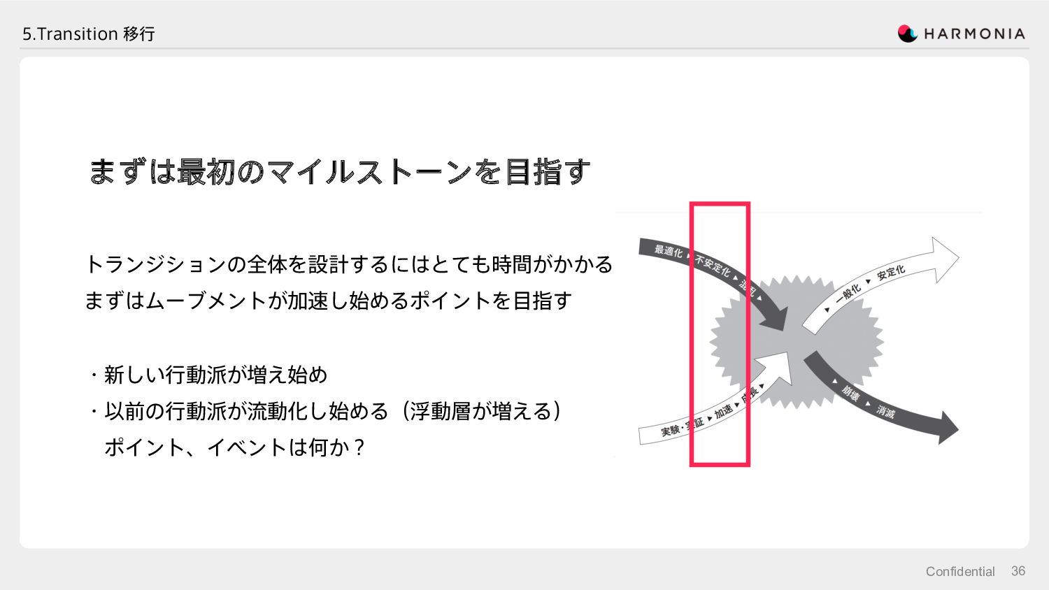 Confidential 36 5SBOTJUJPOҠߦ ·ͣ࠷ॳͷϚΠϧετʔϯΛࢦ͢ τϥϯδγϣϯͷશମΛઃܭ͢Δʹͱ͕͔͔ͯ࣌ؒΔ ·ͣϜʔϒϝϯτ͕Ճ࢝͠ΊΔϙΠϯτΛࢦ͢ ɾ৽͍͠ߦಈ͕૿͑࢝Ί ɾҎલͷߦಈ͕ྲྀಈԽ࢝͠ΊΔʢුಈ͕૿͑Δʣ ϙΠϯτɺΠϕϯτԿ͔ʁ