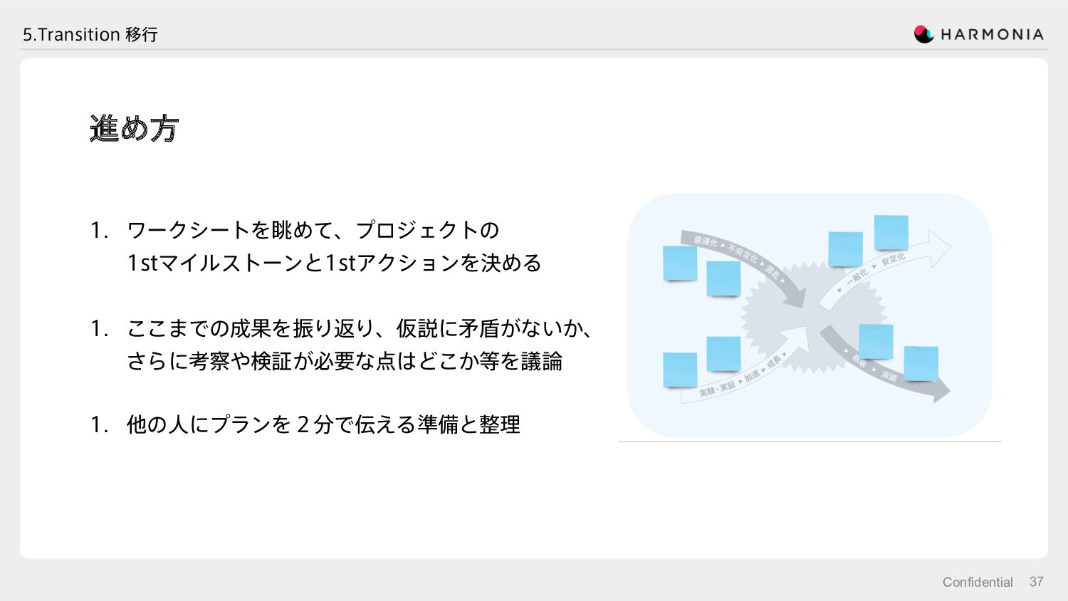 Confidential 37 5SBOTJUJPOҠߦ ϫʔΫγʔτΛோΊͯɺϓϩδΣΫτͷ TUϚΠϧετʔϯͱTUΞΫγϣϯΛܾΊΔ ͜͜·ͰͷՌΛৼΓฦΓɺԾઆʹໃ६͕ͳ͍͔ɺ ͞Βʹߟݕূ͕ඞཁͳͲ͔͜Λٞ