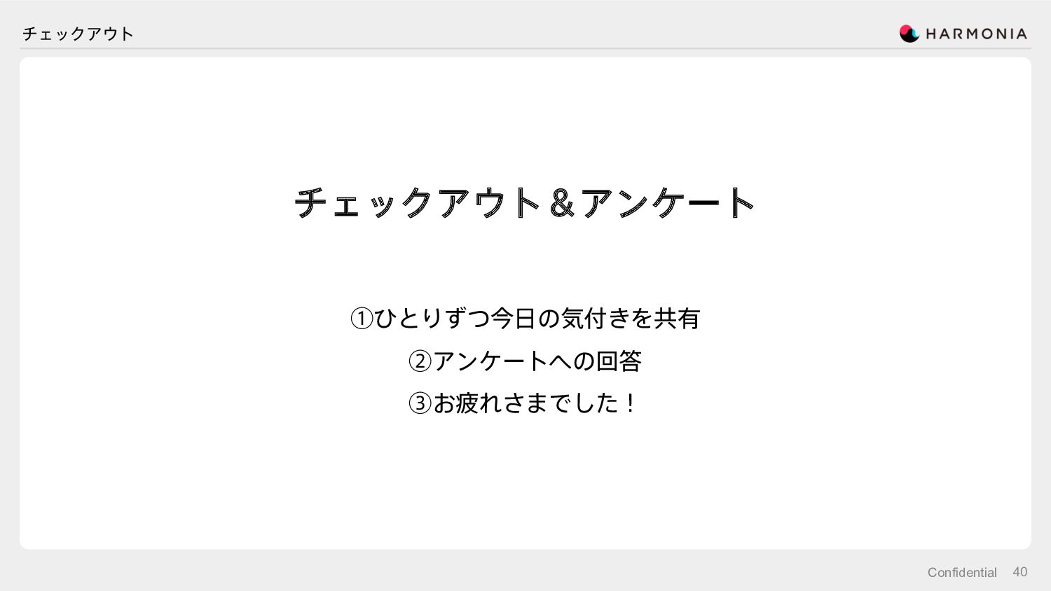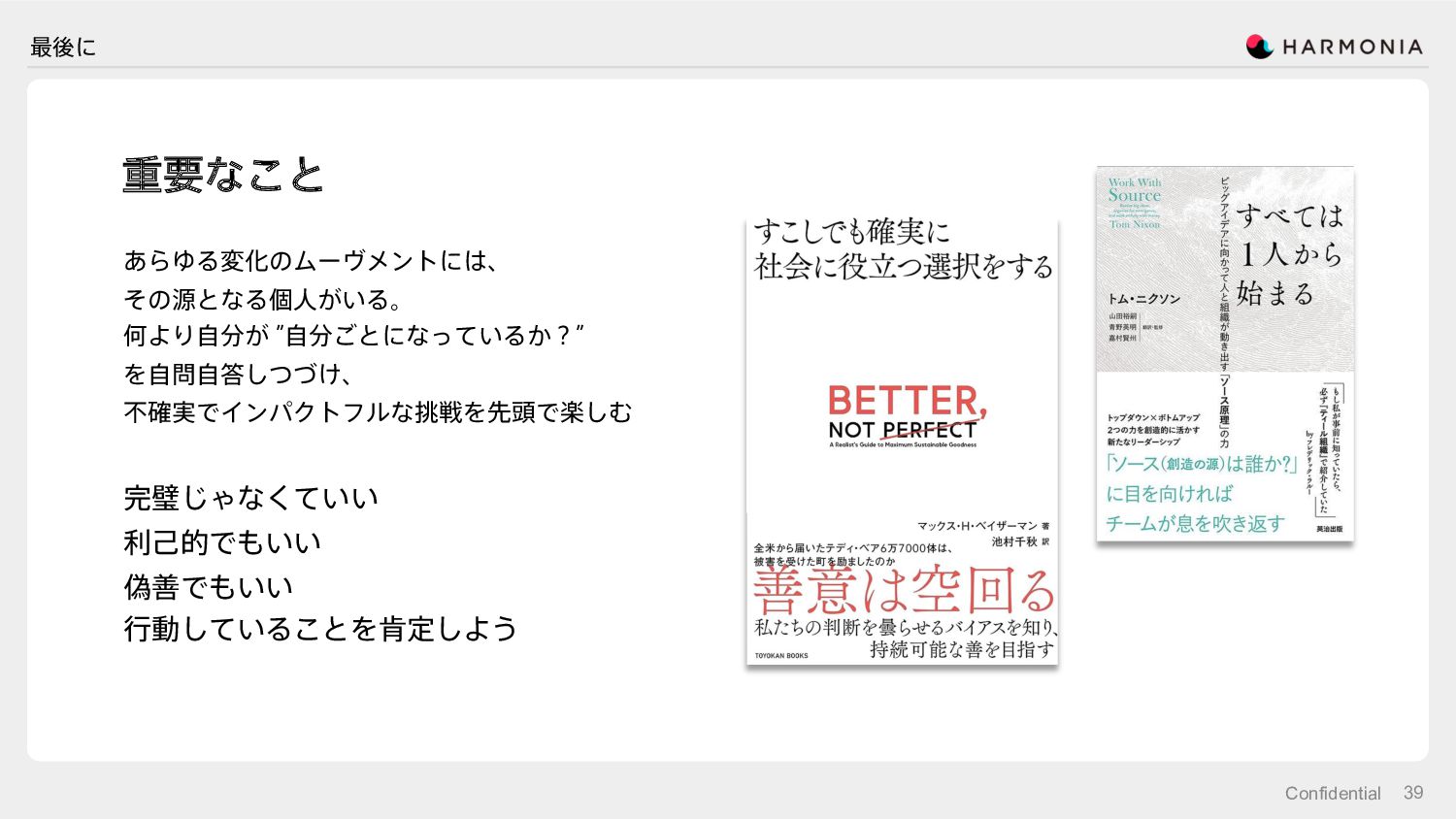 Confidential 39 ࠷ޙʹ ͋ΒΏΔมԽͷϜʔϰϝϯτʹɺ ͦͷݯͱͳΔݸਓ͕͍Δɻ ԿΑΓ͕ࣗ zࣗ͝ͱʹͳ͍ͬͯΔ͔ʁz Λ͚ࣗࣗͭͮ͠ɺ ෆ࣮֬ͰΠϯύΫτϑϧͳઓΛઌ಄Ͱָ͠Ή ᘳ͡Όͳ͍͍ͯ͘