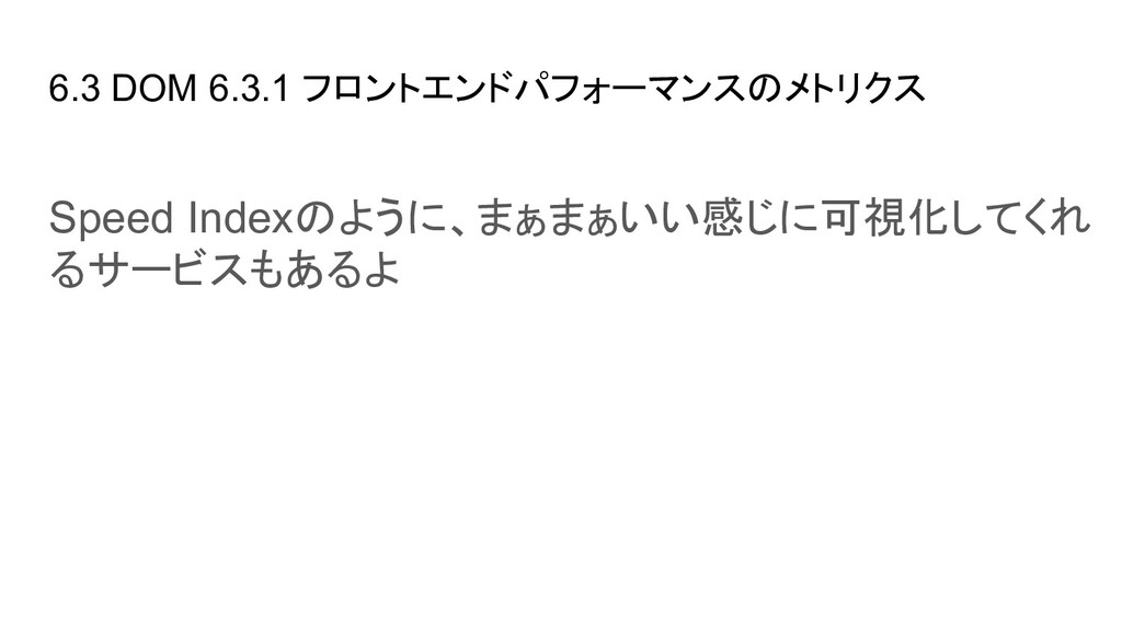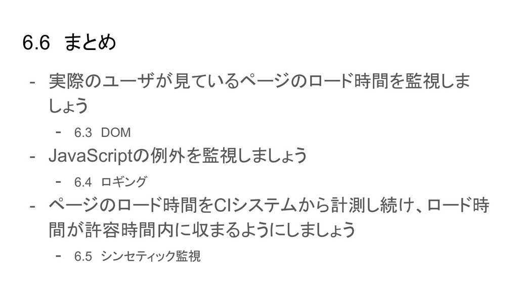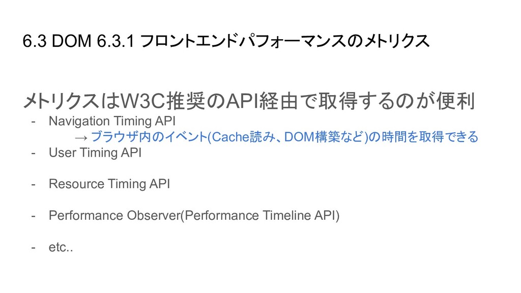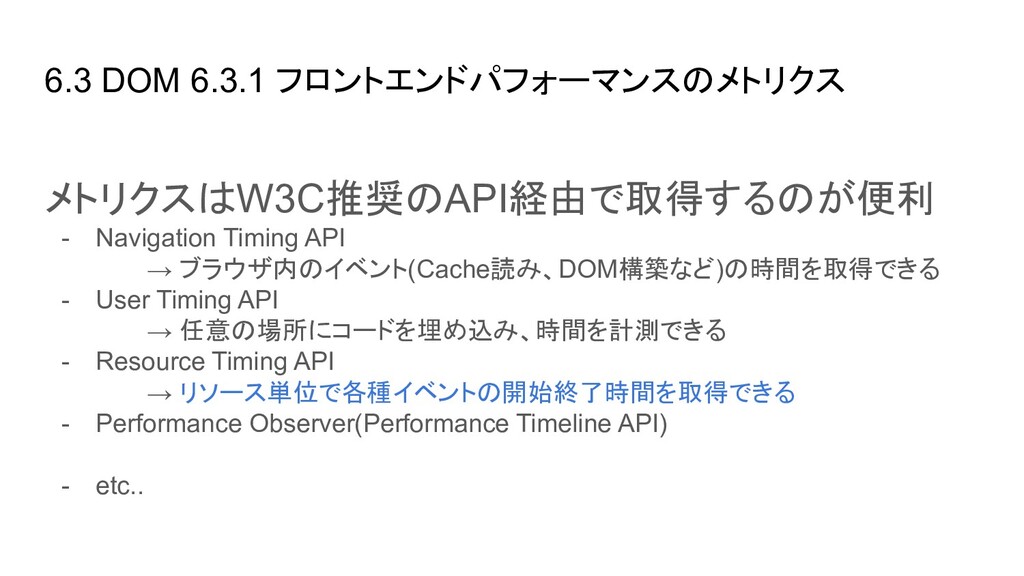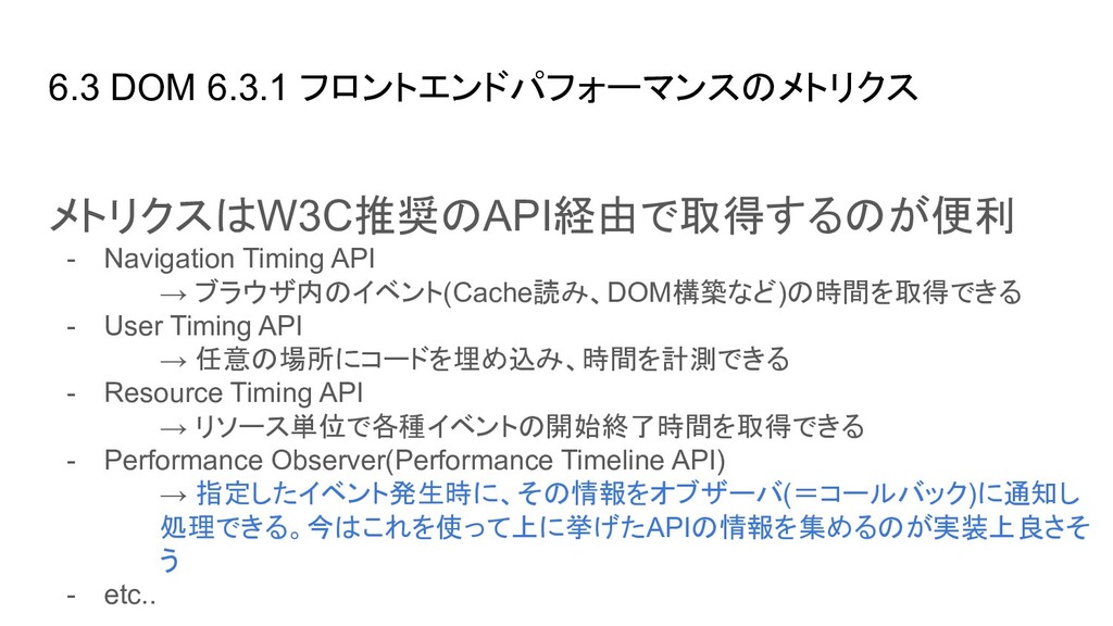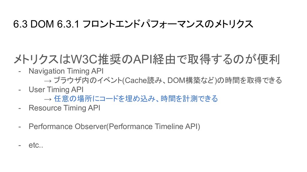ブラウザ内のイベント(Cache読み、DOM構築など)の時間を取得できる - User Timing API → 任意の場所にコードを埋め込み、時間を計測できる - Resource Timing API → リソース単位で各種イベントの開始終了時間を取得できる - Performance Observer(Performance Timeline API) → 指定したイベント発生時に、その情報をオブザーバ(=コールバック)に通知し 処理できる。今はこれを使って上に挙げたAPIの情報を集めるのが実装上良さそ う - etc..