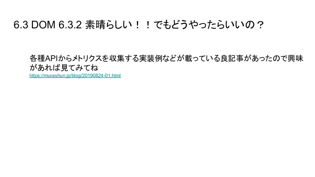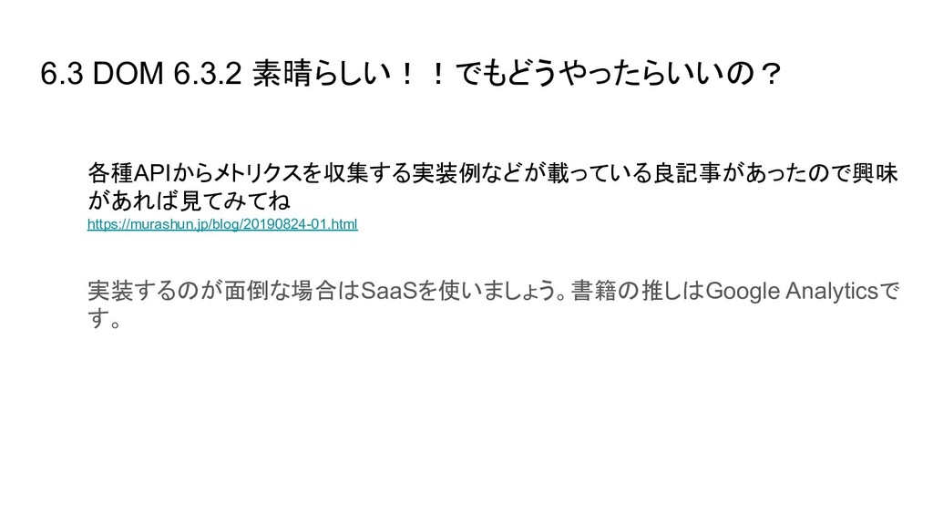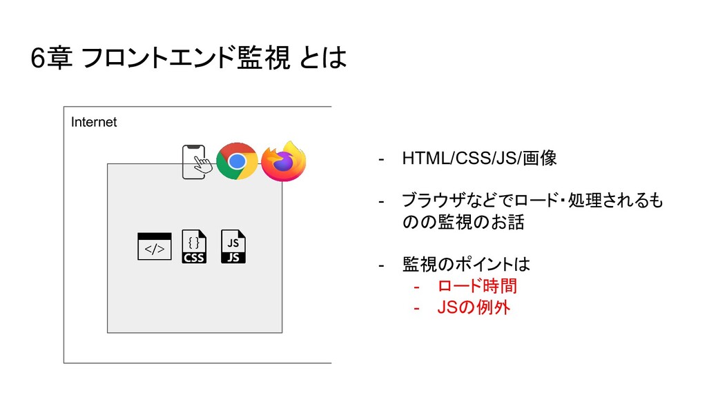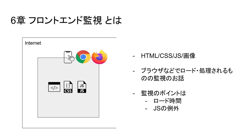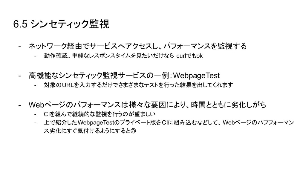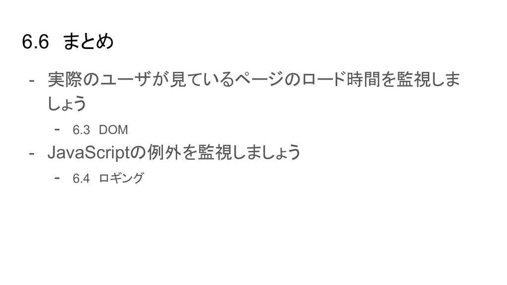 ブラウザ内のイベント(Cache読み、DOM構築など)の時間を取得できる - User Timing API → 任意の場所にコードを埋め込み、時間を計測できる - Resource Timing API → リソース単位で各種イベントの開始終了時間を取得できる - Performance Observer(Performance Timeline API) → 指定したイベント発生時に、その情報をオブザーバ(=コールバック)に通知し 処理できる。今はこれを使って上に挙げたAPIの情報を集めるのが実装上良さそ う - etc..
