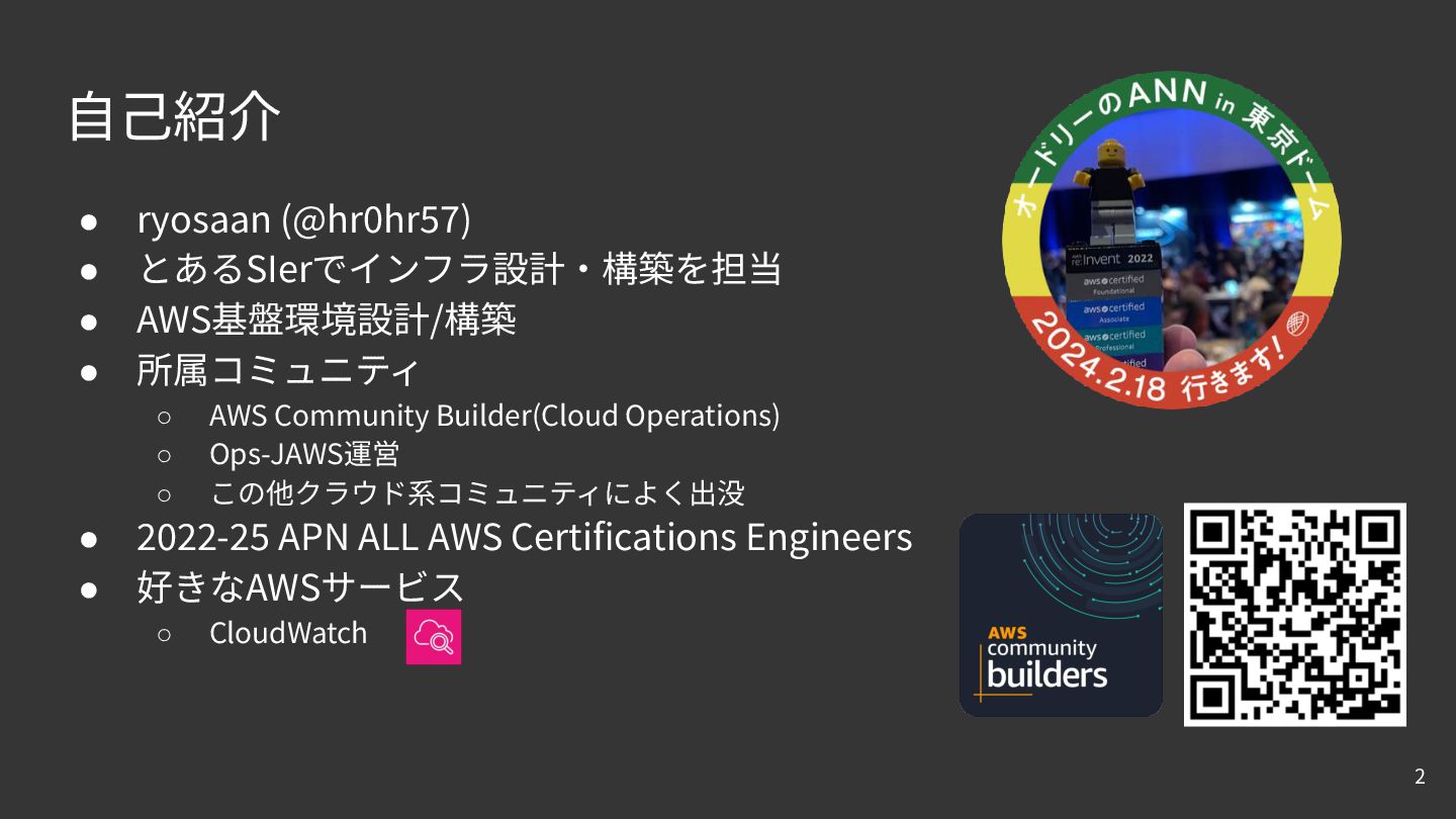 ◦ AWS Community Builder(Cloud Operations) ◦ Ops-JAWS運営 ◦ この他クラウド系コミュニティによく出没 • 2022-25 APN ALL AWS Certifications Engineers • 好きなAWSサービス ◦ CloudWatch 2