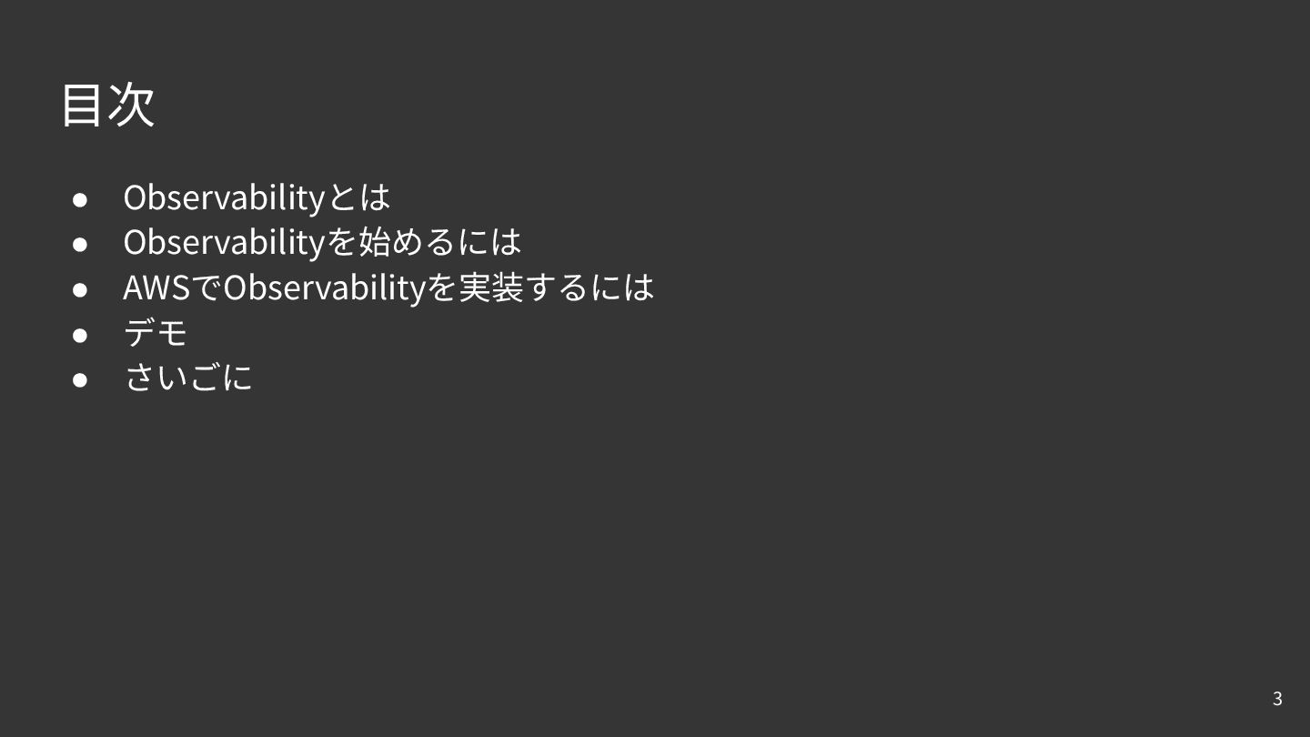 ⽬次 • Observabilityとは • Observabilityを始めるには • AWSでObservabilityを実装するには • デモ •