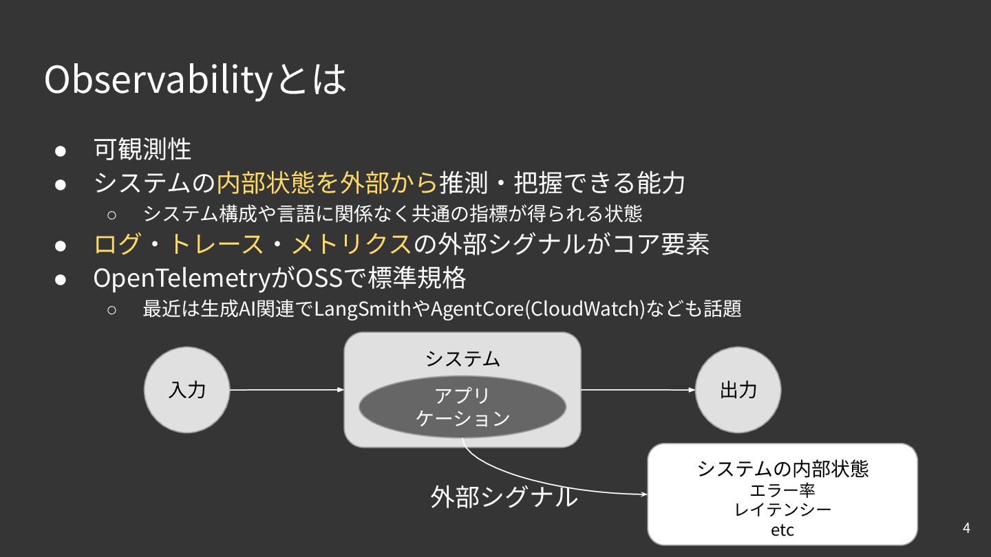 OpenTelemetryがOSSで標準規格 ◦ 最近は⽣成AI関連でLangSmithやAgentCore(CloudWatch)なども話題 4 システム ⼊⼒ 出⼒ アプリ ケーション システムの内部状態 エラー率 レイテンシー etc 外部シグナル