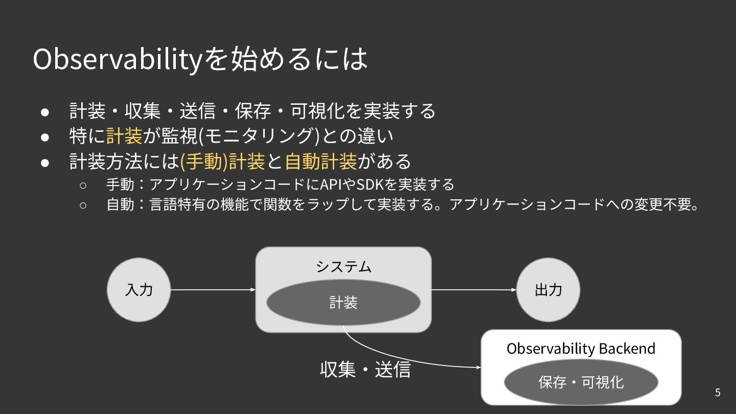 Observabilityを始めるには • 計装‧収集‧送信‧保存‧可視化を実装する • 特に計装が監視(モニタリング)との違い • 計装⽅法には(⼿動)計装と⾃動計装がある ◦ ⼿動:アプリケーションコードにAPIやSDKを実装する ◦