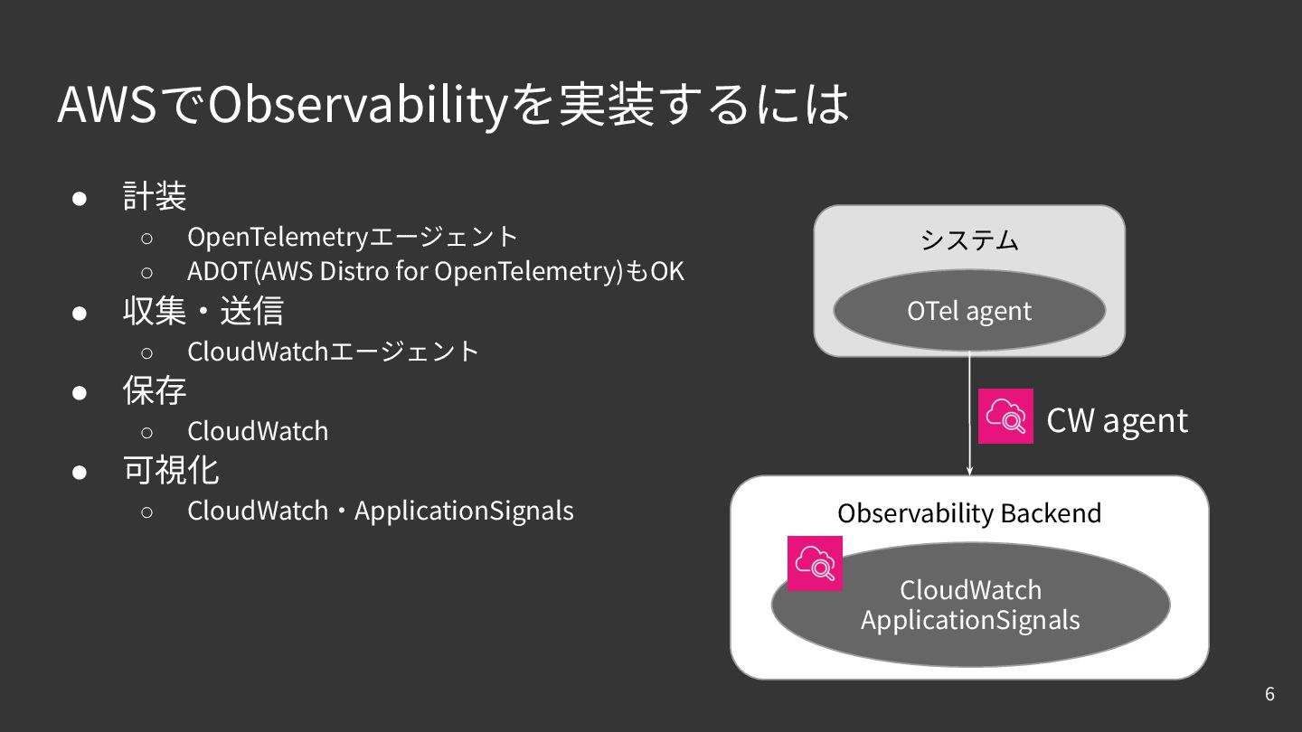 AWSでObservabilityを実装するには • 計装 ◦ OpenTelemetryエージェント ◦ ADOT(AWS Distro for OpenTelemetry)もOK