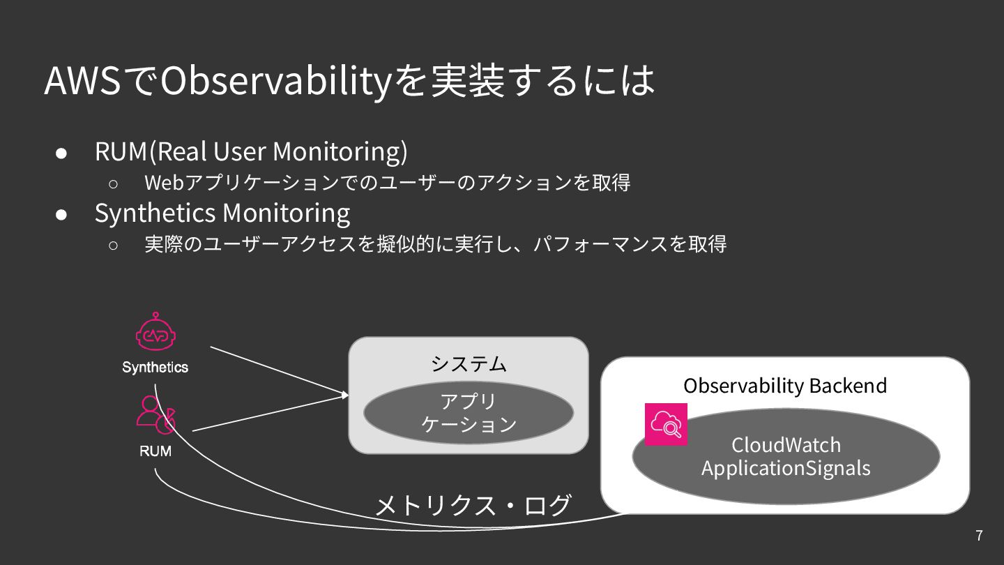 AWSでObservabilityを実装するには • RUM(Real User Monitoring) ◦ Webアプリケーションでのユーザーのアクションを取得 • Synthetics Monitoring