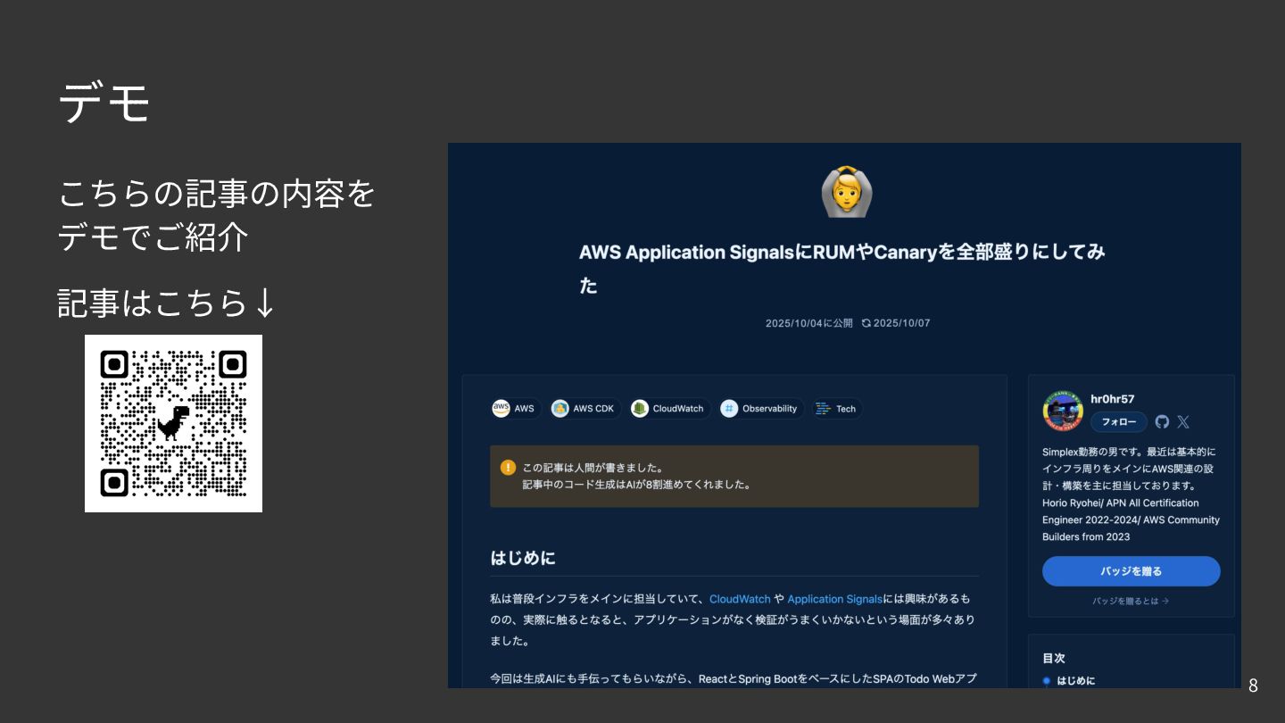 ◦ 実際のユーザーアクセスを擬似的に実⾏し、パフォーマンスを取得 7 システム アプリ ケーション Observability Backend CloudWatch ApplicationSignals メトリクス‧ログ