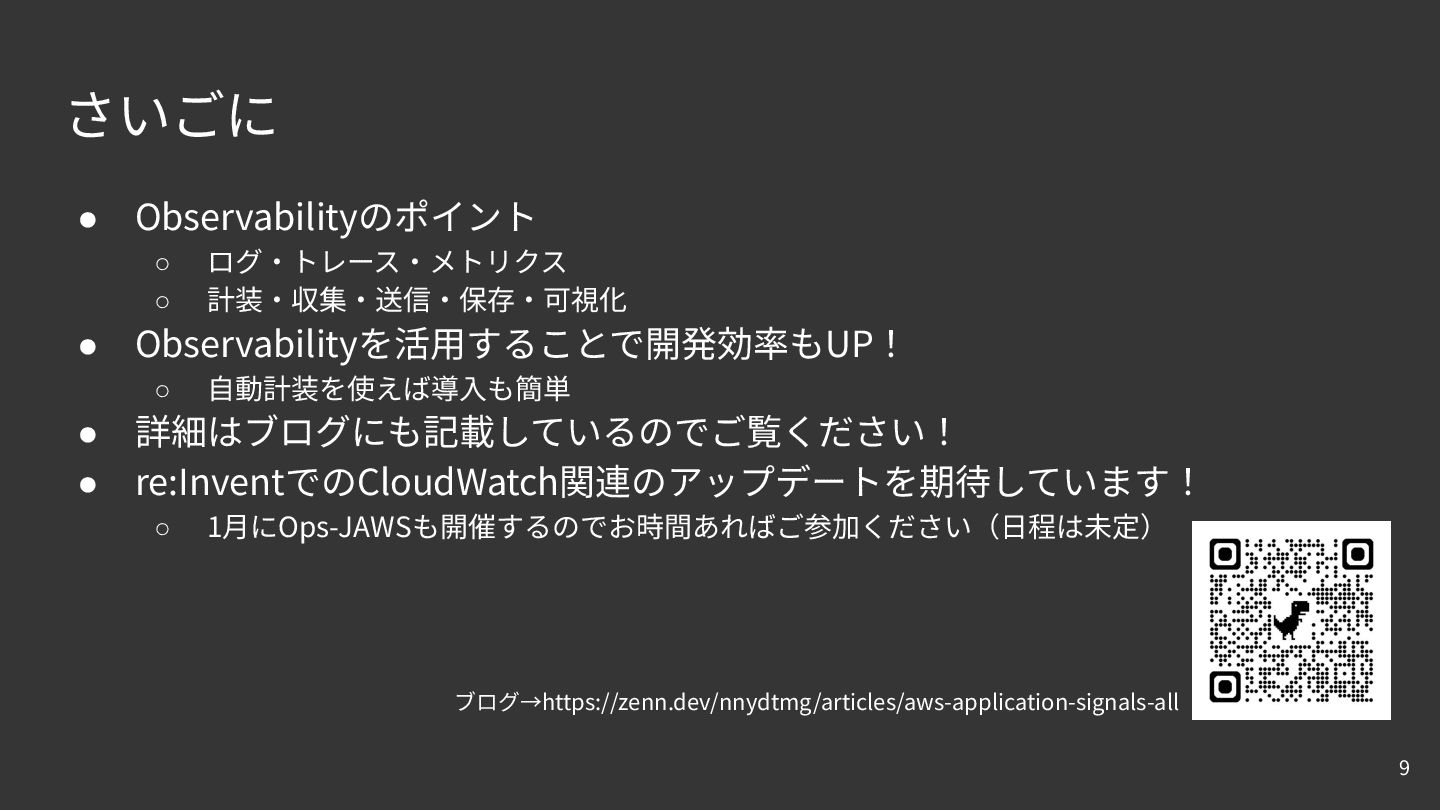 ⾃動計装を使えば導⼊も簡単 • 詳細はブログにも記載しているのでご覧ください! • re:InventでのCloudWatch関連のアップデートを期待しています! ◦ 1⽉にOps-JAWSも開催するのでお時間あればご参加ください(⽇程は未定) 9 ブログ→https://zenn.dev/nnydtmg/articles/aws-application-signals-all