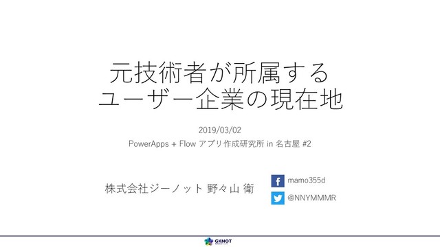 元技術者が所属する ユーザー企業の現在地 株式会社ジーノット 野々山 衛 mamo355d @NNYMMMR 2019/03/02 PowerApps +