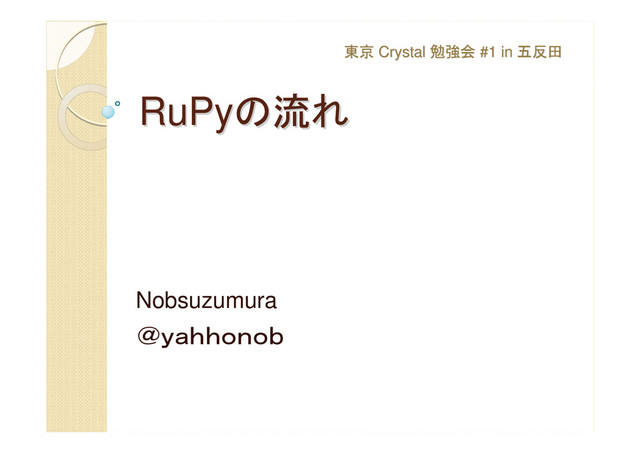 Conference since 2007 people twitting as follows in the Internet people twitting as follows in the Internet Crystal is Ruby inspired Systax Elixir is Ruby like Erlang Swift(Apple) for Rubyist (Ruby like Objective-C) Rust(Mozila) is Ruby like C++/Java/C Coffeescript is Ruby like Javascript, into Ecmascript2015 SCALA is Ruby like Java (More Functional) Groovy is Ruby like Jacascript Julia is Ruby/Python like Matlab, R C++/11 is RuPy like C++ (More By Boost) JVM7.0 finally Invoke Dynamic ◦ Easy to Read, Easy to Learn, Easy to think ◦ Less Noise, Less Cellemony, Less Magic Spelling ◦ Comfortable, like, Love , so Community love Ruby/Python ◦ Computer Scientists respect Ruby ◦ Small Talk &LISP communities respect Ruby