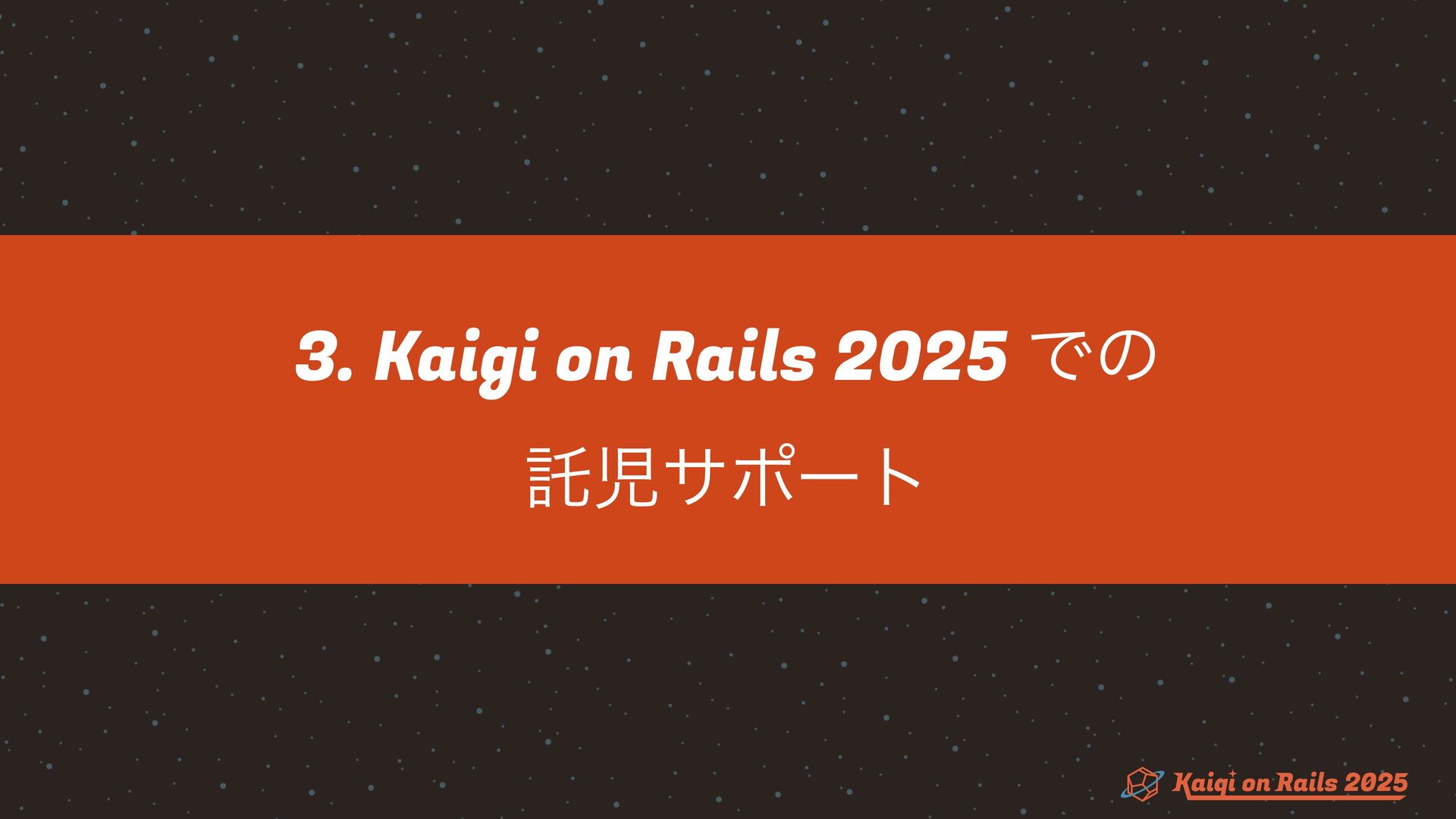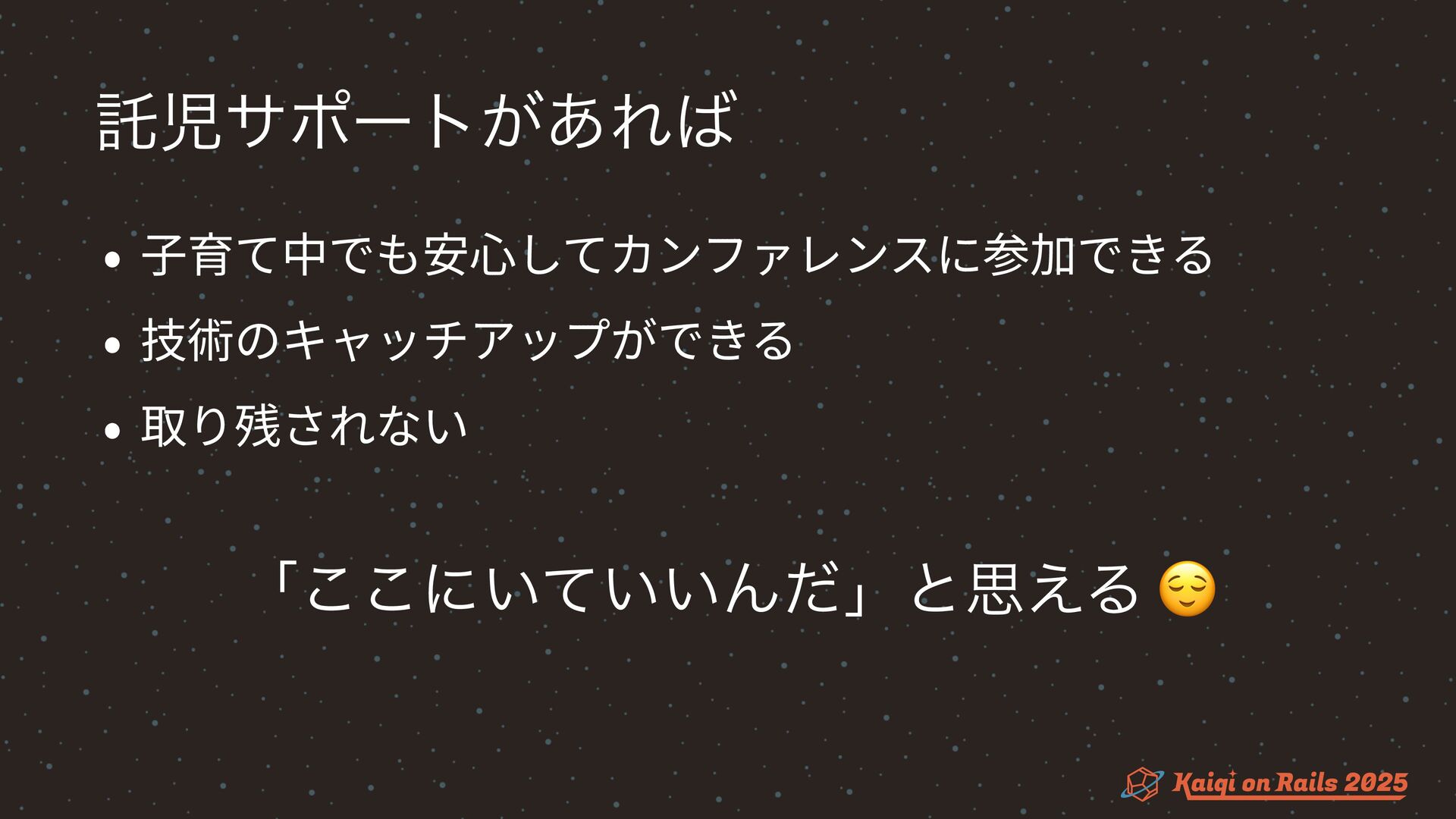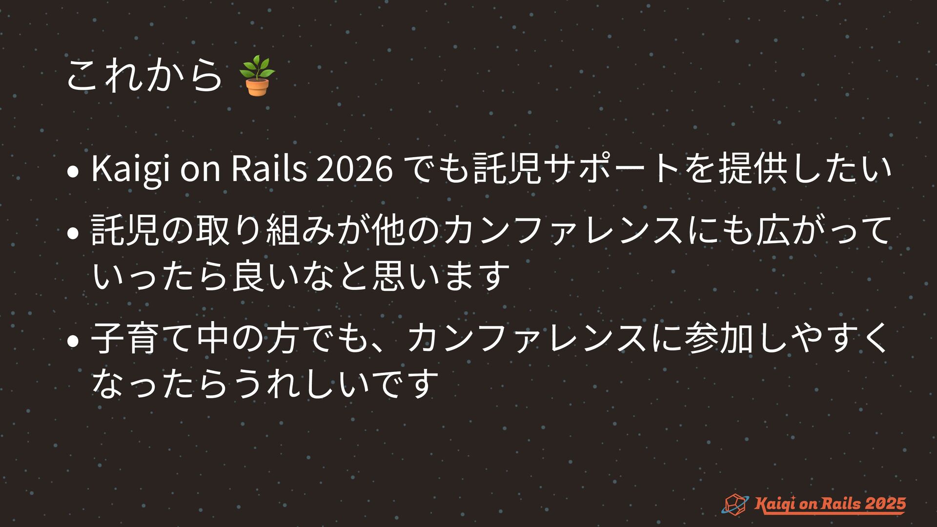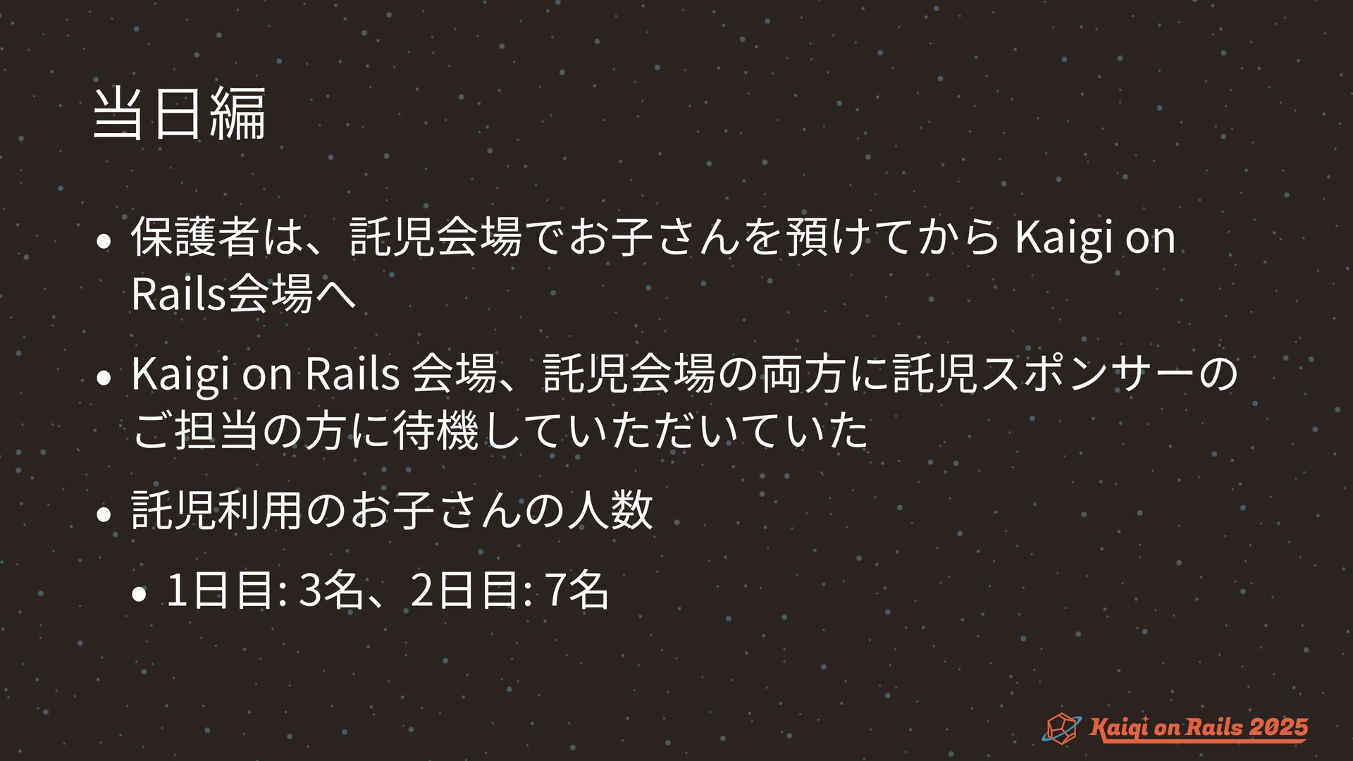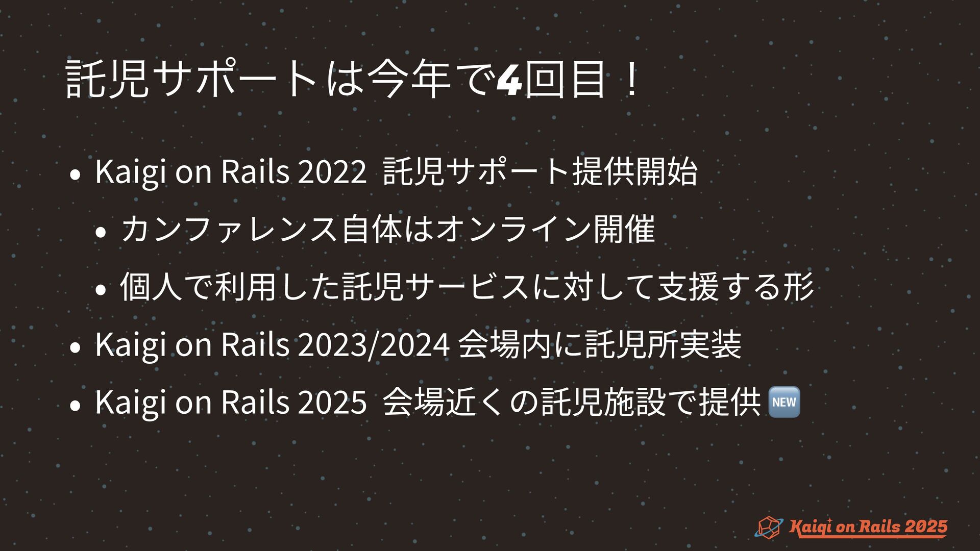 • カンファレンス 自 体はオンライン開催 • 個 人 で利 用 した託児サービスに対して 支 援する形 • Kaigi on Rails 2 0 2 3 / 2 0 2 4 会場内に託児所実装 • Kaigi on Rails 2 0 2 5 会場近くの託児施設で提供 🆕
