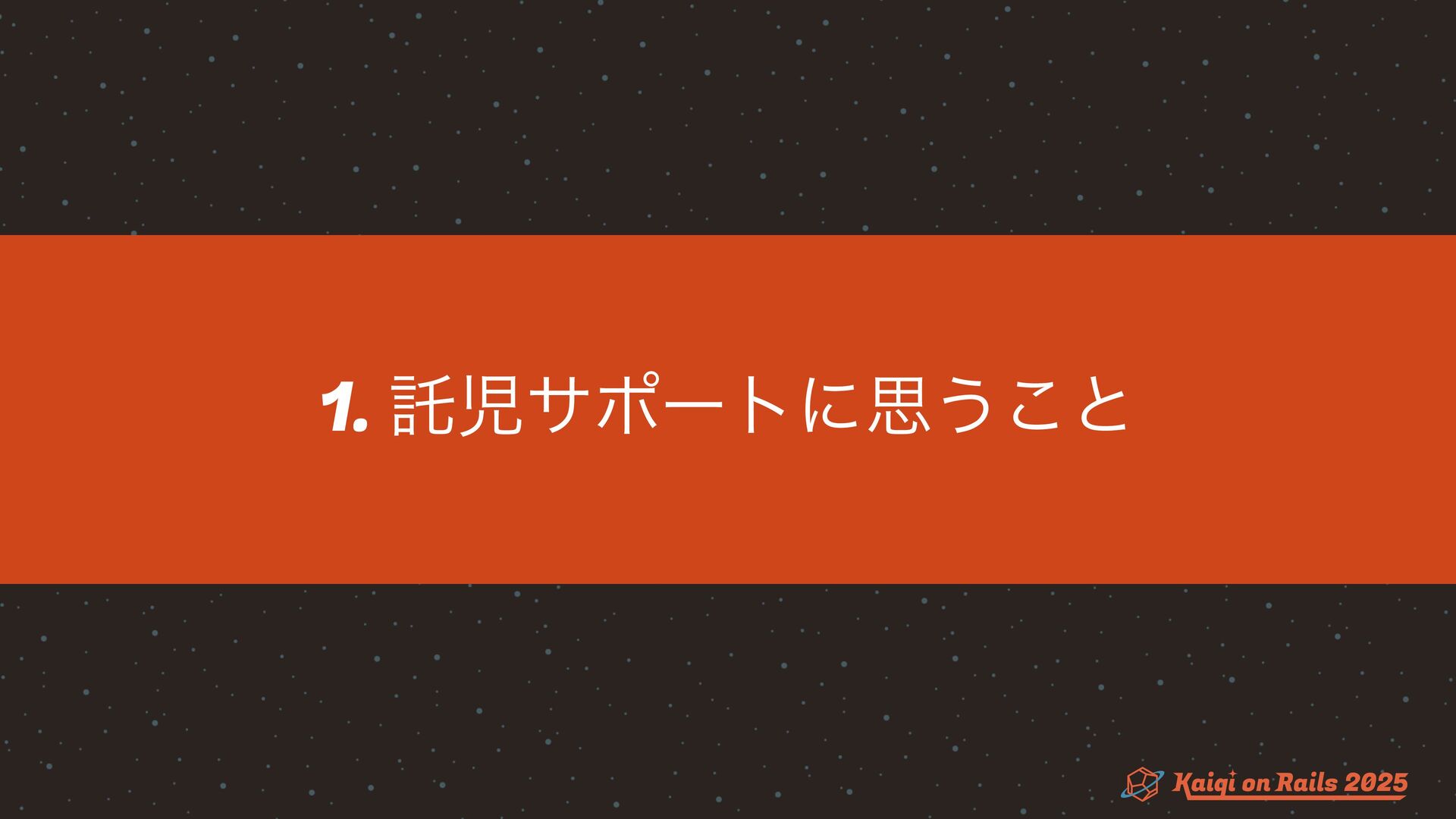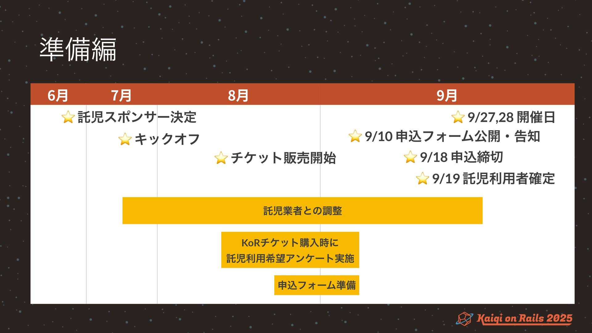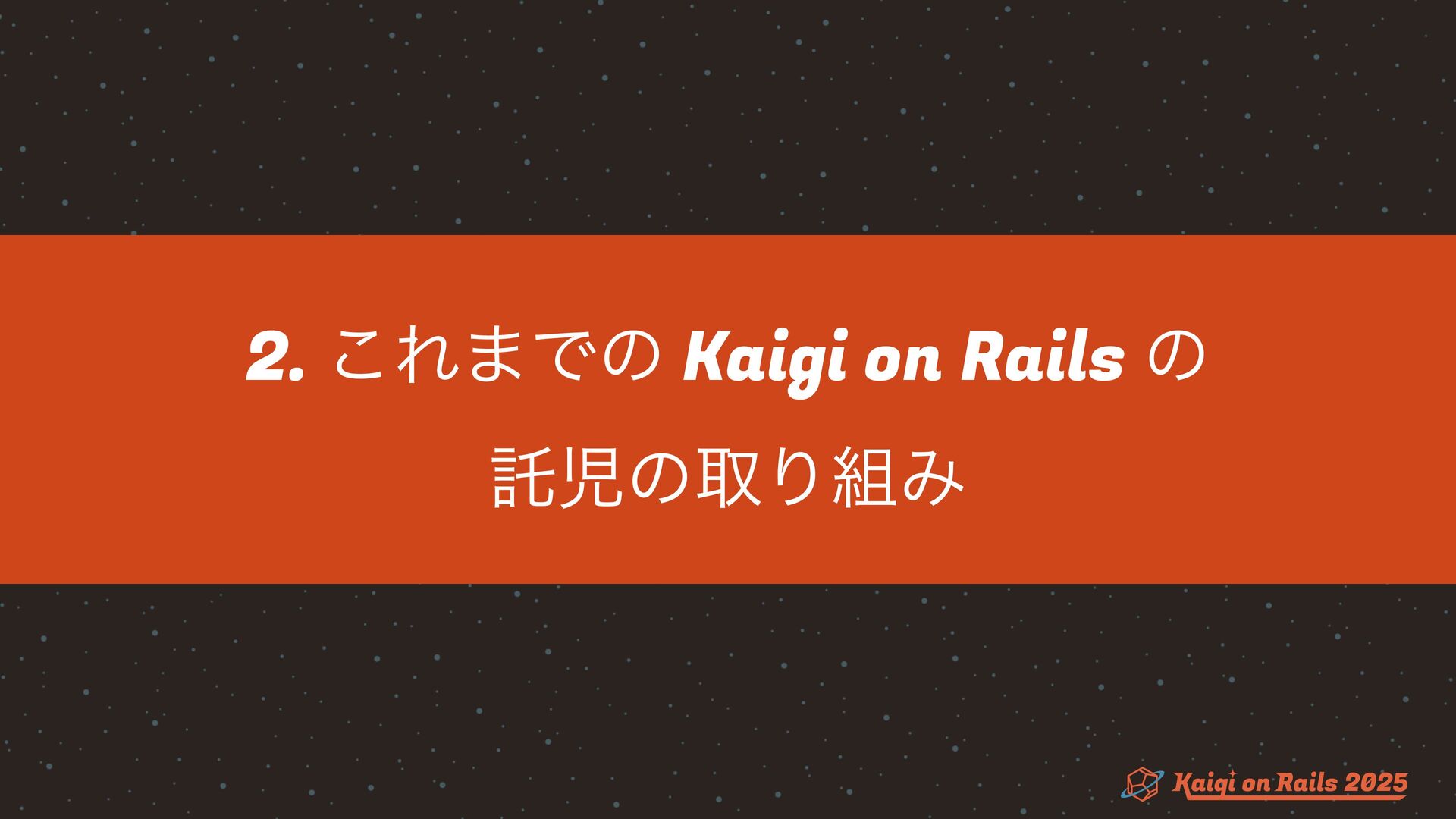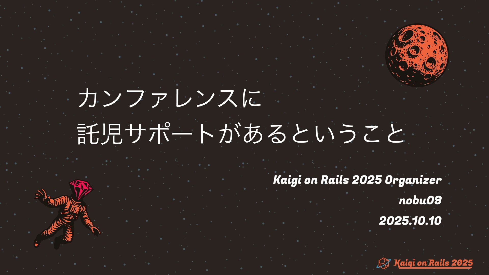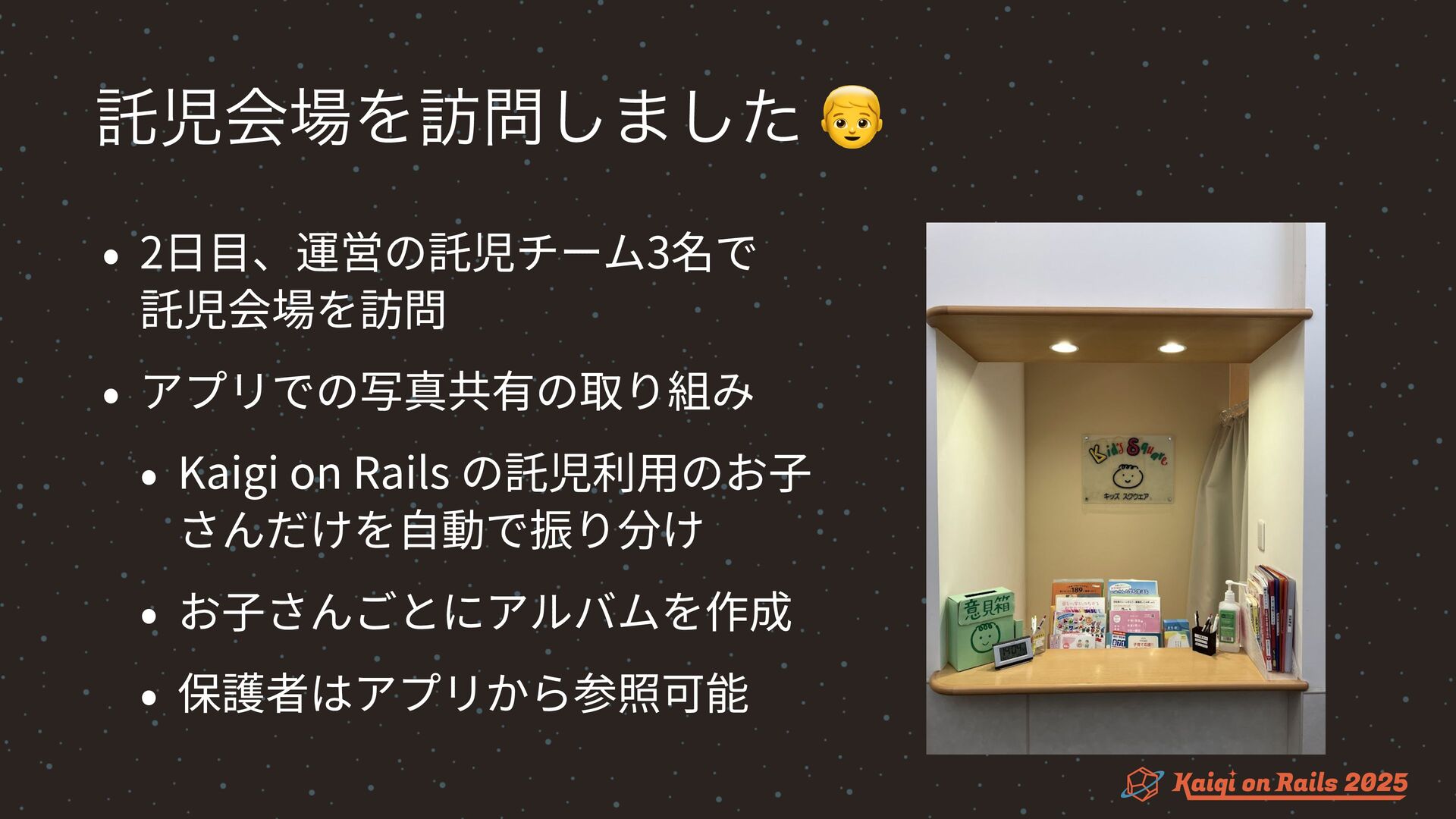 • カンファレンス 自 体はオンライン開催 • 個 人 で利 用 した託児サービスに対して 支 援する形 • Kaigi on Rails 2 0 2 3 / 2 0 2 4 会場内に託児所実装 • Kaigi on Rails 2 0 2 5 会場近くの託児施設で提供 🆕