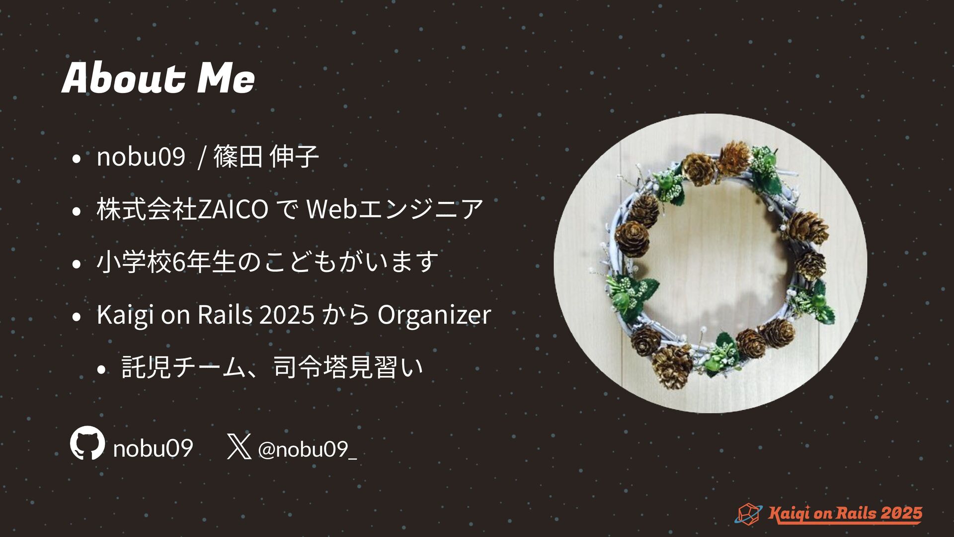 子 • 株式会社ZAICO で Webエンジニア • 小 学校6年 生 のこどもがいます • Kaigi on Rails 2 0 2 5 から Organizer • 託児チーム、司令塔 見 習い @nobu09_ nobu09