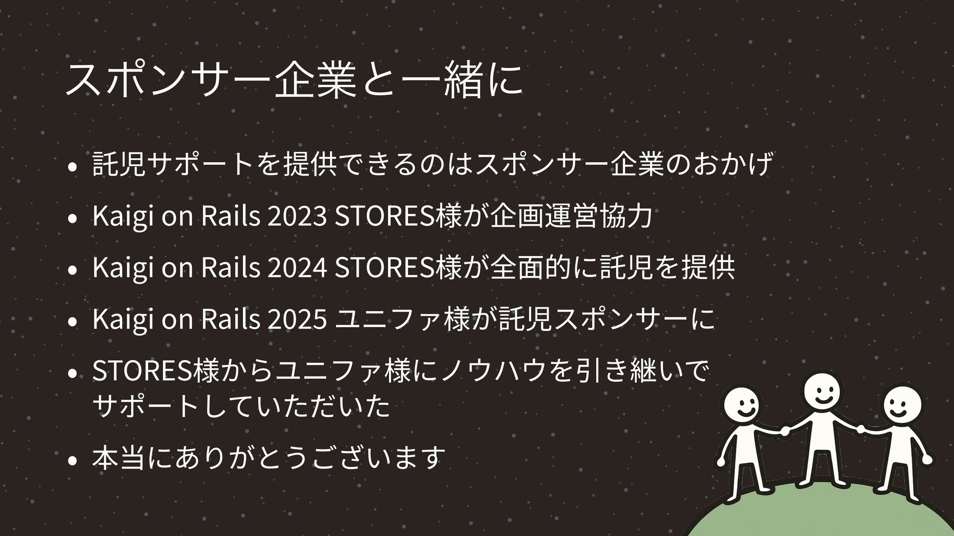 3 STORES様が企画運営協 力 • Kaigi on Rails 2 0 2 4 STORES様が全 面 的に託児を提供 • Kaigi on Rails 2 0 2 5 ユニファ様が託児スポンサーに • STORES様からユニファ様にノウハウを引き継いで サポートしていただいた • 本当にありがとうございます
