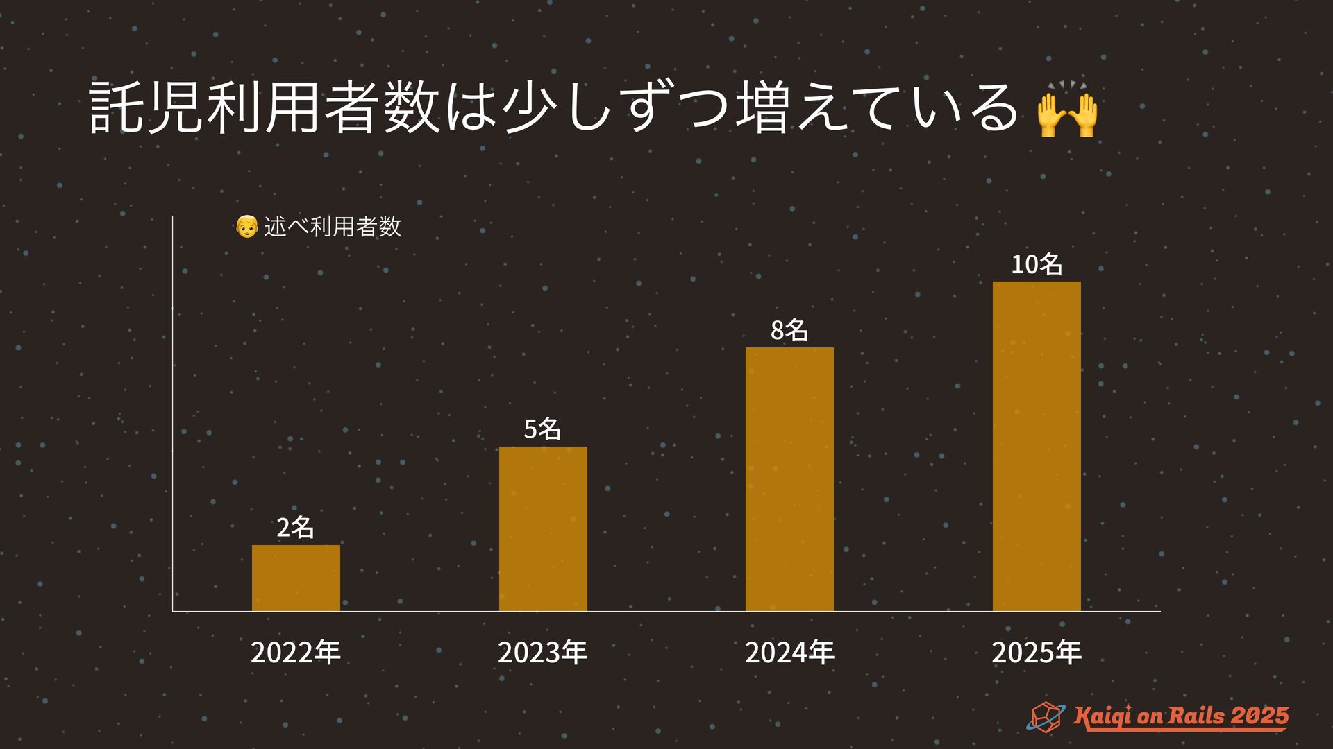 ୗࣇར༻ऀগͣͭ͠૿͍͑ͯΔ 🙌 2022年 2023年 2024年 2025年 10名 8名 5名 2名