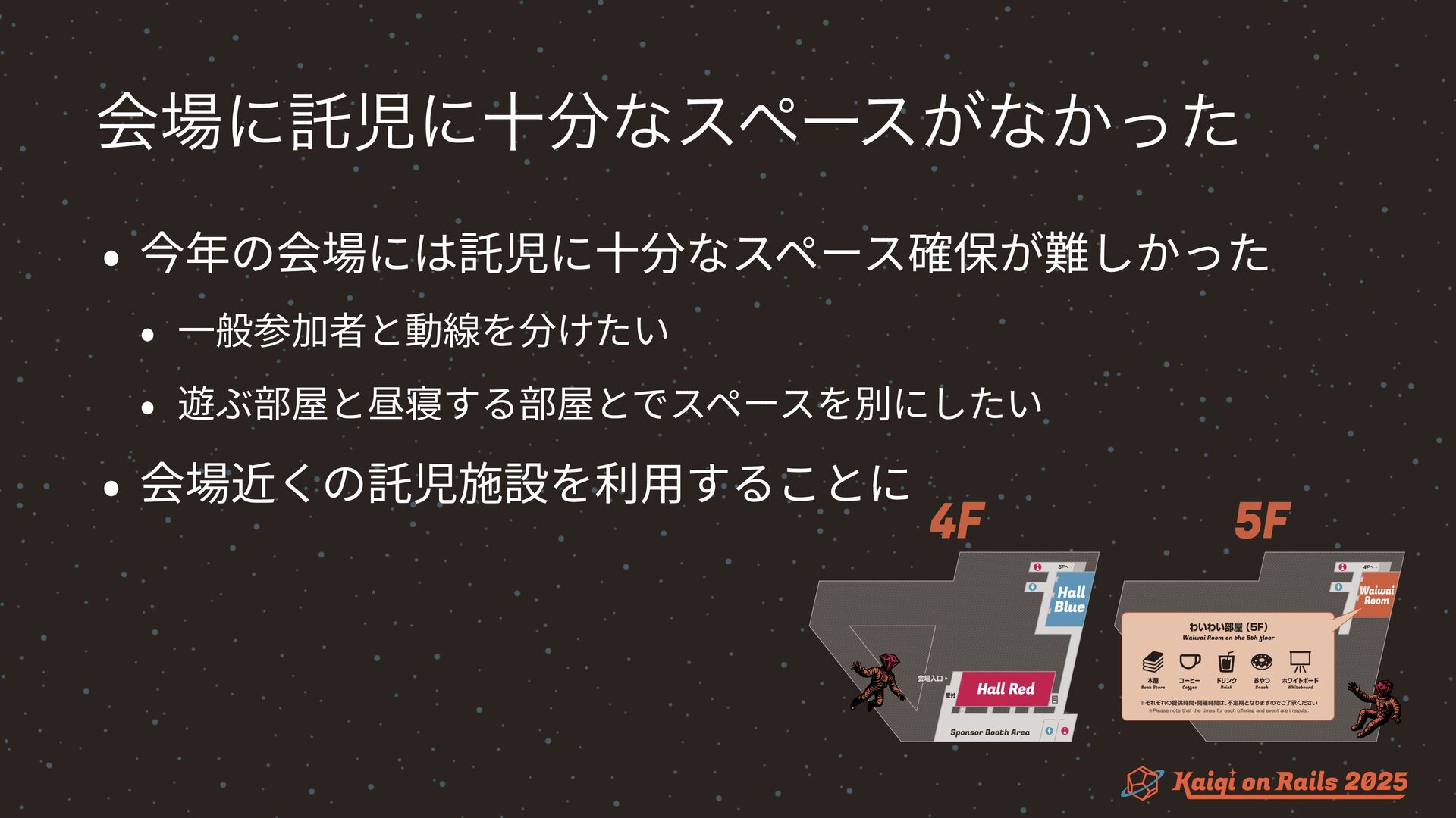 ฤ • 保護者は、託児会場でお 子 さんを預けてから Kaigi on Rails会場へ • Kaigi
