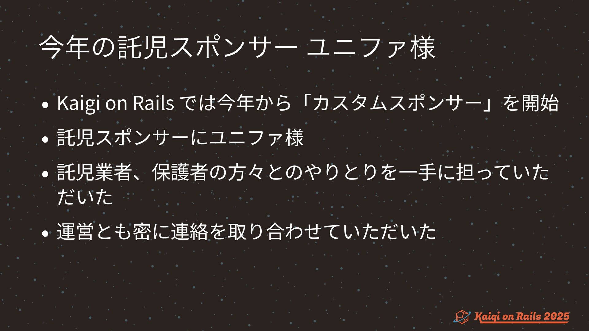 ࠓͷୗࣇεϙϯαʔ ϢχϑΝ༷ • Kaigi on Rails では今年から「カスタムスポンサー」を開始 • 託児スポンサーにユニファ様 •