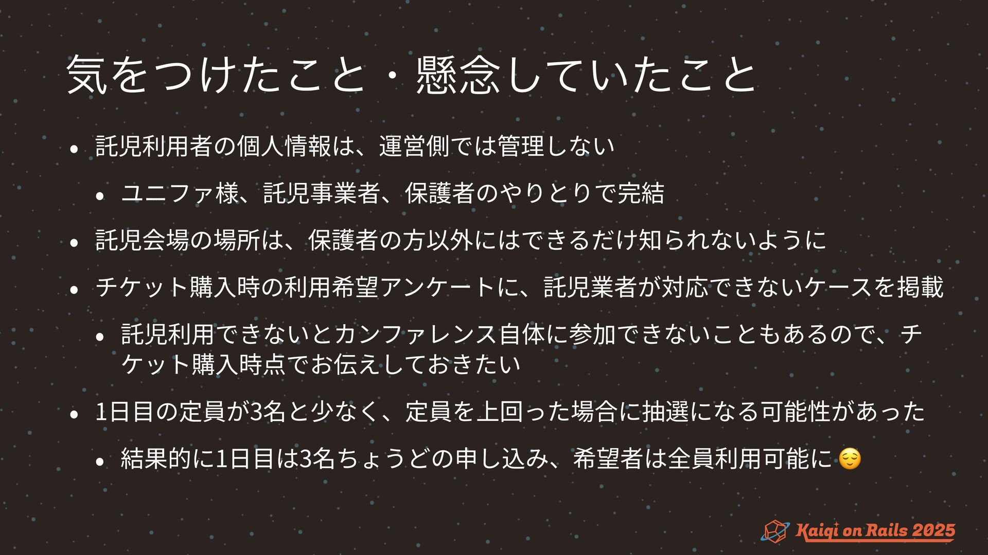 託児会場の場所は、保護者の 方 以外にはできるだけ知られないように • チケット購 入 時の利 用 希望アンケートに、託児業者が対応できないケースを掲載 • 託児利 用 できないとカンファレンス 自 体に参加できないこともあるので、チ ケット購 入 時点でお伝えしておきたい • 1 日目 の定員が3名と少なく、定員を上回った場合に抽選になる可能性があった • 結果的に1 日目 は3名ちょうどの申し込み、希望者は全員利 用 可能に 😌